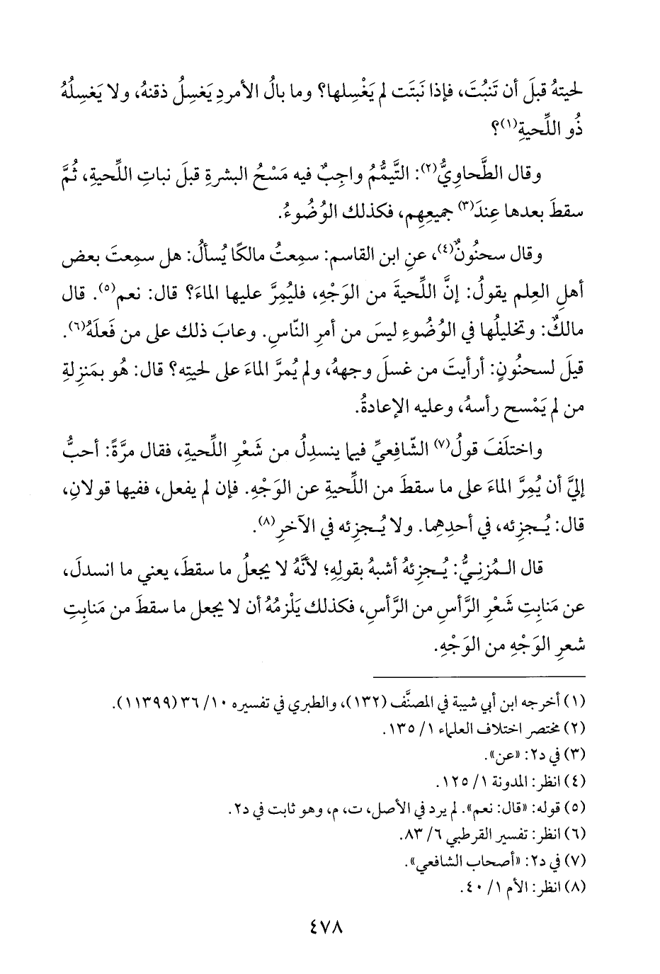 وقال سحنُونٌ (¬٤)، عنِ ابن القاسم: سمِعتُ مالكًا يُسألُ: هل سمِعتَ بعض أهلِ العِلم يقولُ: إنَّ اللِّحيةَ من الوَجْهِ، فليُمِرَّ عليها الماءَ؟ قال: نعم (¬٥). قال مالكٌ: وتخليلُها في الوُضُوءِ ليسَ من أمرِ النّاسِ. وعابَ ذلك على من فَعلَهُ (¬٦). قيلَ لسحنُونٍ: أرأيتَ من غسلَ وجههُ، ولم يُمرَّ الماءَ على لحيتِه؟ قال: هُو بمَنزِلةِ من لم يَمْسح رأسهُ، وعليه الإعادةُ.