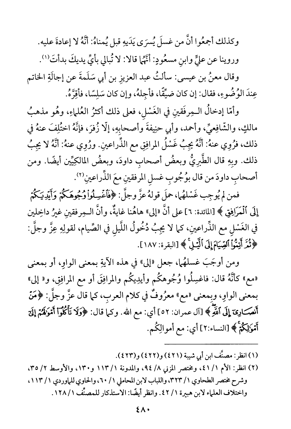 ومن أوجَبَ غسلهُما، جعل "إلى" في هذه الآيةِ بمعنى الواوِ، أو بمعنى "مع" كأنَّهُ قال: فاغسِلُوا وُجُوهكُم وأيدِيكُم والمرافِقَ أو مع المرافِقِ، و"إلى" بمعنى الواوِ، وبِمعنى "مع" معرُوفٌ في كلام العربِ، كما قال عزَّ وجلَّ: {مَنْ أَنْصَارِي إِلَى اللَّهِ} [آل عمران: ٥٢] أي: مع اللَّه. وكما قال: {وَلَا تَأْكُلُوا أَمْوَالَهُمْ إِلَى أَمْوَالِكُمْ} [النساء: ٢] أي: مع أموالِكُم.