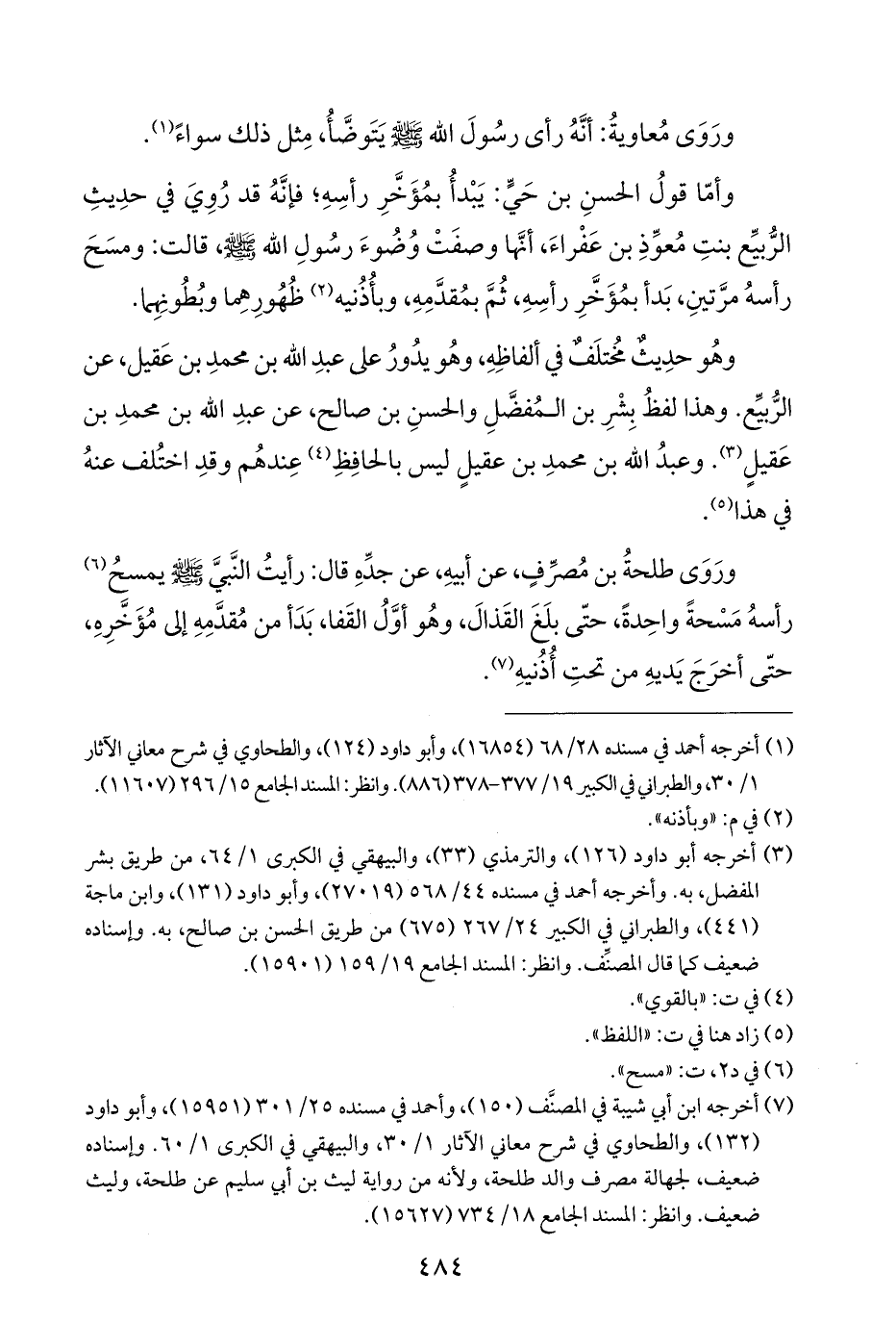 (¬٧) أخرجه ابن أبي شيبة في المصنَّف (١٥٠)، وأحمد في مسنده ٢٥/ ٣٠١ (١٥٩٥١)، وأبو داود (١٣٢)، والطحاوي في شرح معاني الآثار ١/ ٣٠، والبيهقي في الكبرى ١/ ٦٠. وإسناده ضعيف، لجهالة مصرف والد طلحة، ولأنه من رواية ليث بن أبي سليم عن طلحة، وليث ضعيف. وانظر: المسند الجامع ١٨/ ٧٣٤ (١٥٦٢٧).