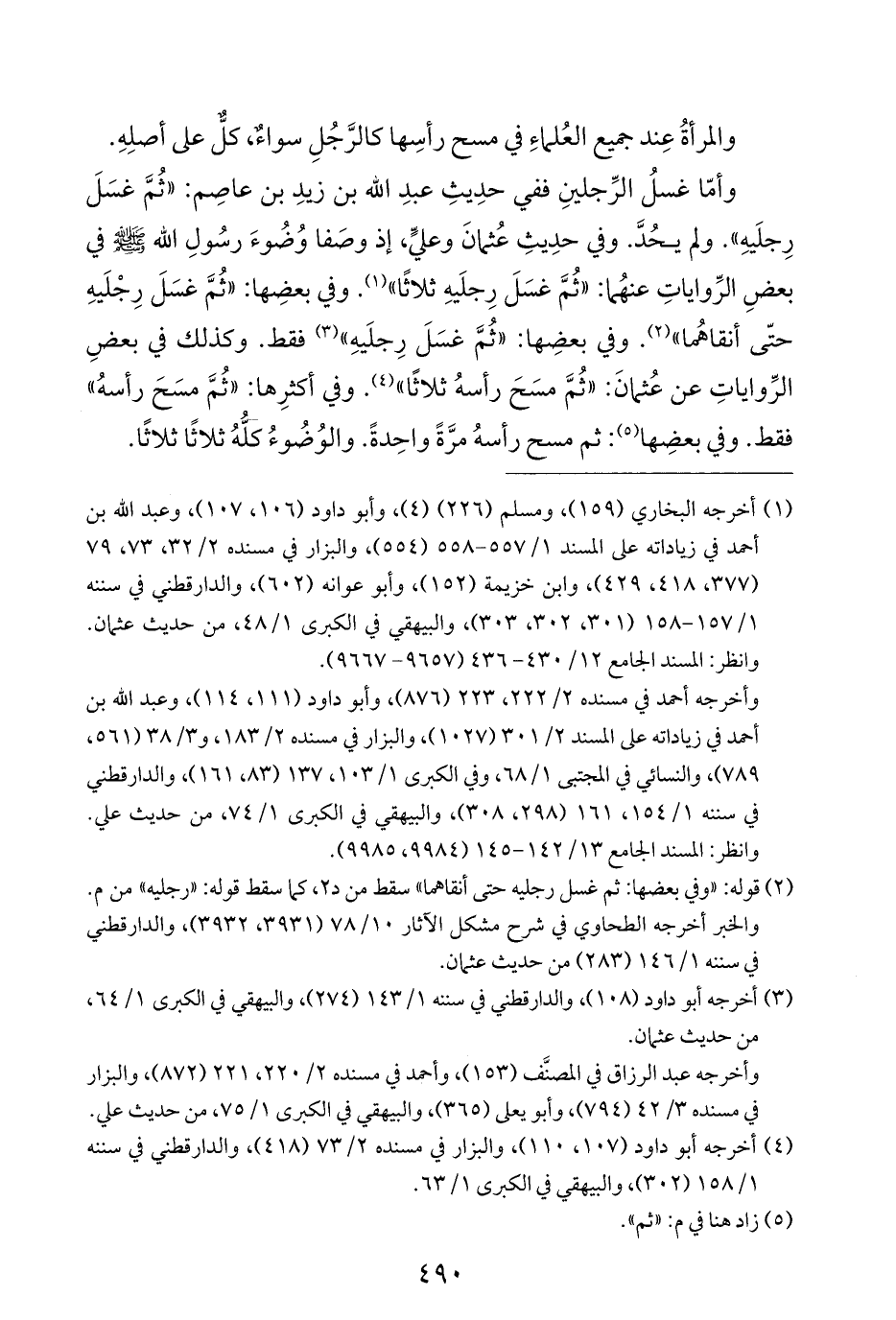 وأمّا غسلُ الرِّجلينِ ففي حدِيثِ عبدِ اللَّه بن زيدِ بن عاصِم: "ثُمَّ غسَلَ رِجلَيهِ". ولم يحُدَّ. وفي حدِيثِ عُثمانَ وعليٍّ، إذ وصَفا وُضُوءَ رسُولِ اللَّه -صلى اللَّه عليه وسلم- في بعضِ الرِّواياتِ عنهُما: "ثُمَّ غسَلَ رِجلَيهِ ثلاثًا" (¬١). وفي بعضِها: "ثُمَّ غسَلَ رِجْلَيهِ حتّى أنقاهُما" (¬٢). وفي بعضِها: "ثُمَّ غسَلَ رِجلَيهِ" (¬٣) فقط. وكذلك في بعضِ الرِّواياتِ عن عُثمانَ: "ثُمَّ مسَحَ رأسهُ ثلاثًا" (¬٤). وفي أكثرِها: "ثُمَّ مسَحَ رأسهُ" فقط. وفي بعضِها (¬٥): ثم مسح رأسهُ مرَّةً واحِدةً. والوُضُوءُ كلُّهُ ثلاثًا ثلاثًا.