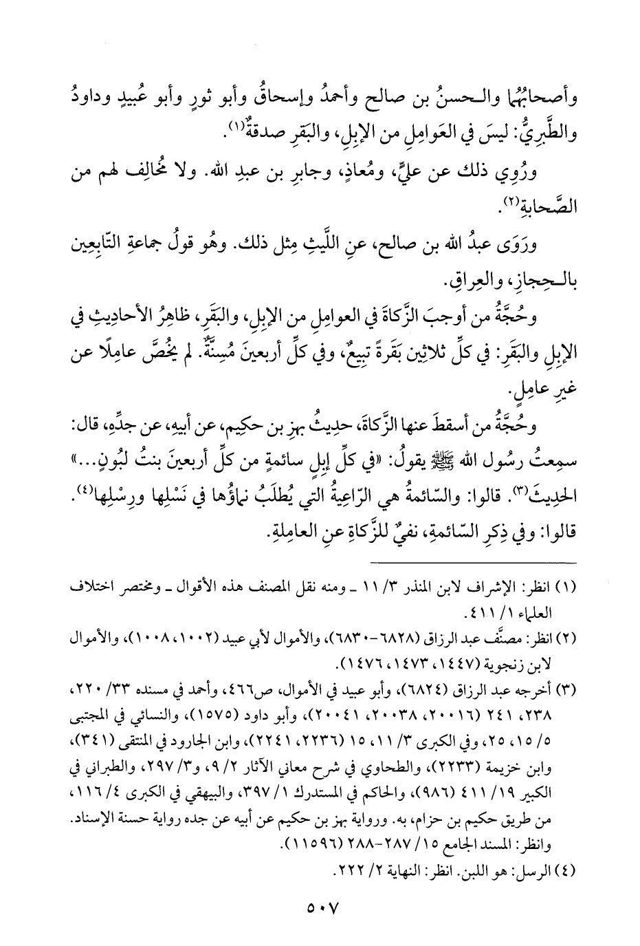 وحُجَّةُ من أوجبَ الزَّكاةَ في العوامِلِ من الإبِلِ، والبَقَرِ، ظاهِرُ الأحادِيثِ في الإبِلِ والبَقَرِ: في كلِّ ثلاثِين بَقَرةً تبِيعٌ، وفي كلِّ أربعينَ مُسِنَّةٌ. لم يخُصَّ عامِلًا عن غيرِ عامِلٍ.