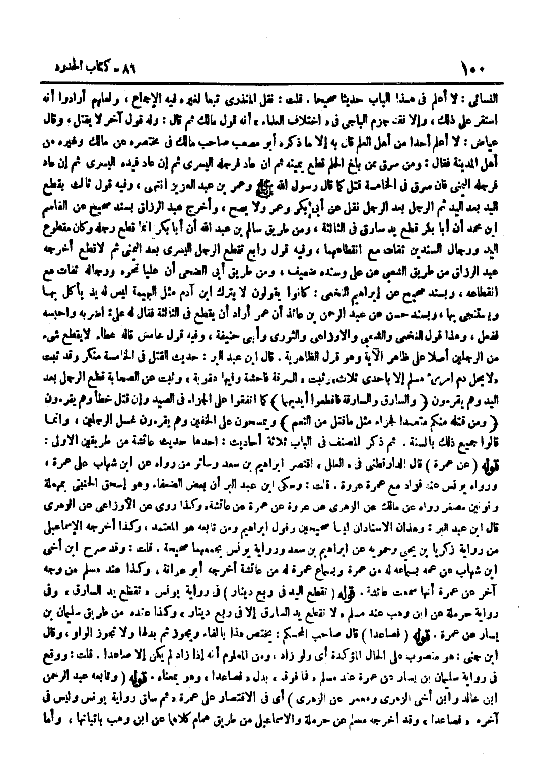 النَّسَائِيُّ لَا أَعْلَمُ فِي هَذَا الْبَابِ حَدِيثًا صَحِيحًا قُلْتُ نَقَلَ الْمُنْذِرِيُّ تَبَعًا لِغَيْرِهِ فِيهِ الْإِجْمَاعَ وَلَعَلَّهُمْ أَرَادُوا أَنَّهُ اسْتَقَرَّ عَلَى ذَلِكَ وَإِلَّا فَقَدْ جَزَمَ الْبَاجِيُّ فِي اخْتِلَافِ الْعُلَمَاءِ أَنَّهُ قَوْلُ مَالِكٍ ثُمَّ قَالَ وَلَهُ قَوْلٌ آخَرُ لَا يُقْتَلُ وَقَالَ عِيَاضٌ لَا أَعْلَمُ أَحَدًا مِنْ أَهْلِ الْعِلْمِ قَالَ بِهِ إِلَّا مَا ذَكَرَهُ أَبُو مُصْعَبٍ صَاحِبُ مَالِكٍ فِي مُخْتَصَرِهِ عَنْ مَالِكٍ وَغَيْرِهِ مِنْ أَهْلِ الْمَدِينَةِ فَقَالَ وَمَنْ سَرَقَ مِمَّنْ بَلَغَ الْحُلَمَ قُطِعَ يَمِينُهُ ثُمَّ إِنْ عَادَ فَرِجْلُهُ الْيُسْرَى ثُمَّ إِنْ عَادَ فَيَدُهُ الْيُسْرَى ثُمَّ إِنْ عَادَ فَرِجْلُهُ الْيُمْنَى فَإِنْ سَرَقَ فِي الْخَامِسَةِ قُتِلَ كَمَا قَالَ رَسُولُ اللَّهِ صَلَّى اللَّهُ عَلَيْهِ وَسَلَّمَ وَعُمَرُ بْنُ عَبْدِ الْعَزِيزِ انْتَهَى وَفِيهِ قَوْلٌ ثَالِثٌ بِقَطْعِ الْيَدِ بَعْدَ الْيَدِ ثُمَّ الرِّجْلِ بَعْدَ الرِّجْلِ نُقِلَ عَنْ أَبِي بَكْرٍ وَعُمَرَ وَلَا يَصِحُّ وَأَخْرَجَ عَبْدُ الرَّزَّاقِ بِسَنَدٍ صَحِيحٍ عَنِ الْقَاسِمِ بْنِ مُحَمَّدٍ أَنَّ أَبَا بَكْرٍ قَطَعَ يَدَ سَارِقٍ فِي الثَّالِثَةِ وَمِنْ طَرِيقِ سَالِمِ بْنِ عَبْدِ اللَّهِ أَنَّ أَبَا بَكْرٍ إِنَّمَا قَطَعَ رِجْلَهُ وَكَانَ مَقْطُوعَ الْيَدِ وَرِجَالُ السَّنَدَيْنِ ثِقَاتٌ مَعَ انْقِطَاعِهِمَا وَفِيهِ قَوْلٌ رَابِعٌ تُقْطَعُ الرِّجْلُ الْيُسْرَى بَعْدَ الْيُمْنَى ثُمَّ لَا قَطْعٌ أَخْرَجَهُ عَبْدُ الرَّزَّاقِ مِنْ طَرِيقِ الشَّعْبِيِّ عَنْ عَلِيٍّ وَسَنَدُهُ ضَعِيفٌ وَمِنْ طَرِيقِ أَبِي الضُّحَى أَنَّ عَلِيًّا نَحْوُهُ وَرِجَالُهُ ثِقَاتٌ مَعَ انْقِطَاعِهِ وَبِسَنَدٍ صَحِيحٍ عَنْ إِبْرَاهِيمَ النَّخَعِيِّ كَانُوا يَقُولُونَ لَا يتْرك بن آدَمَ مِثْلَ الْبَهِيمَةِ لَيْسَ لَهُ يَدٌ يَأْكُلُ بِهَا وَيَسْتَنْجِي بِهَا وَبِسَنَدٍ حَسَنٍ عَنْ عَبْدِ الرَّحْمَنِ بْنِ عَائِذٍ أَنَّ عُمَرَ أَرَادَ أَنْ يَقْطَعَ فِي الثَّالِثَةِ فَقَالَ لَهُ عَلِيٌّ اضْرِبْهُ وَاحْبِسْهُ فَفَعَلَ وَهَذَا قَوْلُ النَّخَعِيِّ وَالشَّعْبِيِّ وَالْأَوْزَاعِيِّ وَالثَّوْرِيِّ وَأَبِي حَنِيفَةَ وَفِيهِ قَوْلٌ خَامِسٌ قَالَهُ عَطَاءٌ لَا يُقْطَعُ شَيْءٌ مِنَ الرِّجْلَيْنِ أَصْلًا عَلَى ظَاهِرِ الْآيَةِ وَهُوَ قَوْلُ الظَّاهِرِيَّةِ قَالَ بن عَبْدِ الْبَرِّ حَدِيثُ الْقَتْلِ فِي الْخَامِسَةِ مُنْكَرٌ وَقَدْ ثَبَتَ لَا يَحِلُّ دَمُ امْرِئٍ مُسْلِمٍ إِلَّا بِإِحْدَى ثَلَاثٍ وَثَبَتَ السَّرِقَةُ فَاحِشَةٌ وَفِيهَا عُقُوبَةٌ وَثَبَتَ عَنِ الصَّحَابَةِ قَطْعُ الرِّجْلِ بَعْدَ الْيَد وهم يقرؤون وَالسَّارِق والسارقة فَاقْطَعُوا أَيْدِيهِمَا كَمَا اتَّفَقُوا عَلَى الْجَزَاءِ فِي الصَّيْدِ وَإِنْ قتل خطأ وهم يقرؤون وَمَنْ قَتَلَهُ مِنْكُمْ مُتَعَمِّدًا فَجَزَاءٌ مِثْلُ مَا قتل من النعم ويمسحون على الْخُفَّيْنِ وهم يقرؤون غَسْلَ الرِّجْلَيْنِ وَإِنَّمَا قَالُوا جَمِيعَ ذَلِكَ بِالسُّنَّةِ ثُمَّ ذَكَرَ الْمُصَنِّفُ فِي البَابِ ثَلَاثَةَ أَحَادِيثَ أَحَدُهَا حَدِيثُ عَائِشَةَ مِنْ طَرِيقَيْنِ الْأُولَى