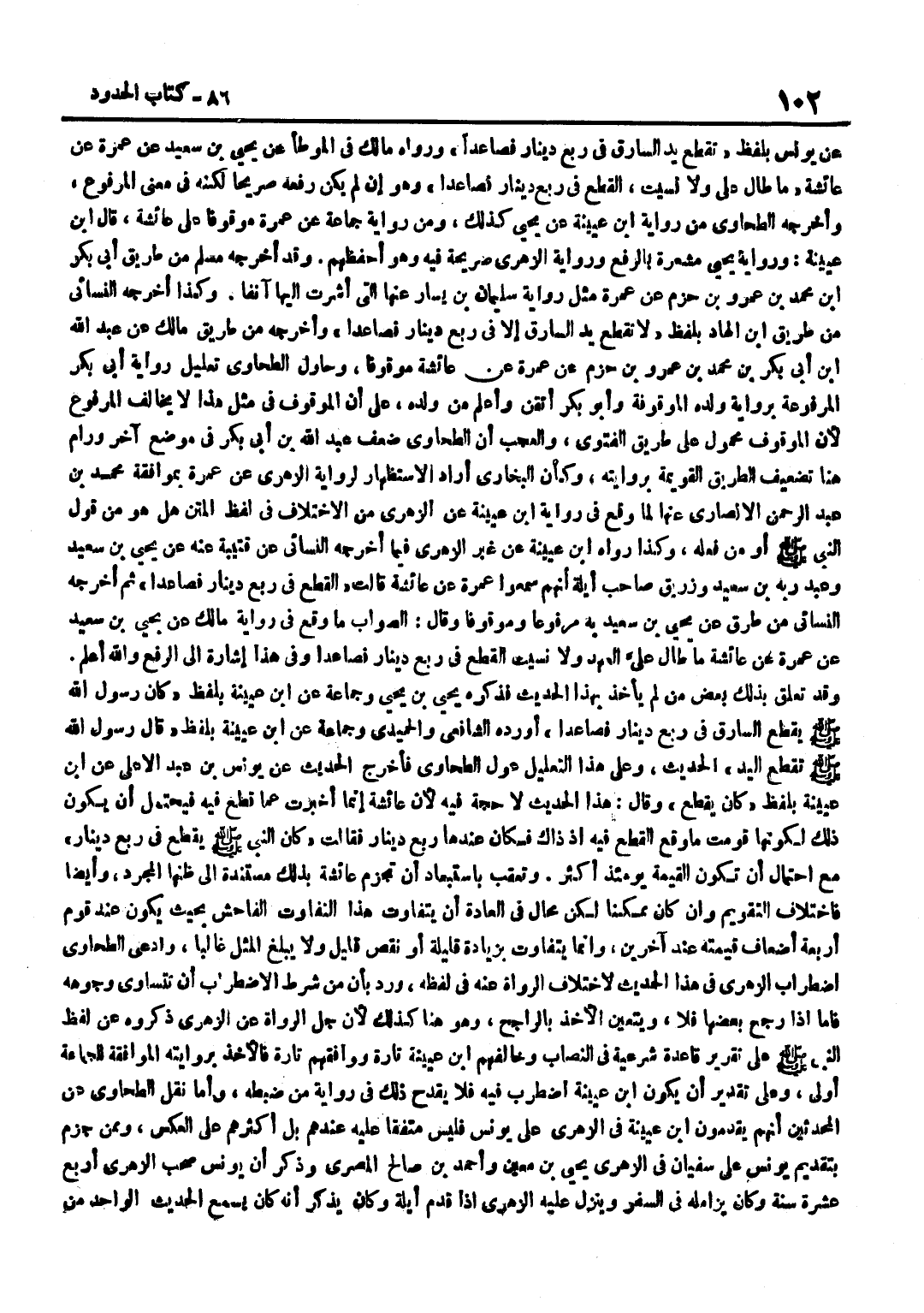عَنْ يُونُسَ بِلَفْظِ تُقْطَعُ يَدُ السَّارِقِ فِي رُبْعِ دِينَارٍ فَصَاعِدًا وَرَوَاهُ مَالِكٌ فِي الْمُوَطَّأِ عَنْ يَحْيَى بْنِ سَعِيدٍ عَنْ عَمْرَةَ عَنْ عَائِشَةَ مَا طَالَ عَلَيَّ وَلَا نَسِيتُ الْقَطْعُ فِي رُبْعِ دِينَارٍ فَصَاعِدًا وَهُوَ إِنْ لَمْ يَكُنْ رَفْعُهُ صَرِيحًا لَكِنَّهُ فِي مَعْنَى الْمَرْفُوعِ وَأخرجه الطَّحَاوِيّ من رِوَايَة بن عُيَيْنَةَ عَنْ يَحْيَى كَذَلِكَ وَمِنْ رِوَايَةِ جَمَاعَةٍ عَن عمْرَة مَوْقُوفا على عَائِشَة قَالَ بن عُيَيْنَةَ وَرِوَايَةُ يَحْيَى مُشْعِرَةٌ بِالرَّفْعِ وَرِوَايَةُ الزُّهْرِيِّ صَرِيحَةٌ فِيهِ وَهُوَ أَحْفَظُهُمْ وَقَدْ أَخْرَجَهُ مُسْلِمٌ مِنْ طَرِيقِ أَبِي بَكْرِ بْنِ مُحَمَّدِ بْنِ عَمْرِو بْنِ حَزْمٍ عَنْ عَمْرَةَ مِثْلَ رِوَايَةِ سُلَيْمَانَ بْنِ يَسَارٍ عَنْهَا الَّتِي أَشَرْتُ إِلَيْهَا آنِفا وَكَذَا أخرجه النَّسَائِيّ من طَرِيق بن الْهَادِ بِلَفْظِ لَا تُقْطَعُ يَدُ السَّارِقِ إِلَّا فِي رُبْعِ دِينَارٍ فَصَاعِدًا وَأَخْرَجَهُ مِنْ طَرِيقِ مَالِكٍ عَنْ عَبْدِ اللَّهِ بْنِ أَبِي بَكْرِ بْنِ مُحَمَّدِ بْنِ عَمْرِو بْنِ حَزْمٍ عَنْ عَمْرَةَ عَنْ عَائِشَةَ مَوْقُوفًا وَحَاوَلَ الطَّحَاوِيُّ تَعْلِيلَ رِوَايَةِ أَبِي بَكْرٍ الْمَرْفُوعَةِ بِرِوَايَةِ وَلَدِهِ الْمَوْقُوفَةِ وَأَبُو بَكْرٍ أَتْقَنُ وَأَعْلَمُ مِنْ وَلَدِهِ عَلَى أَنَّ الْمَوْقُوفَ فِي مِثْلِ هَذَا لَا يُخَالِفُ الْمَرْفُوعَ لِأَنَّ الْمَوْقُوفَ مَحْمُولٌ عَلَى طَرِيقِ الْفَتْوَى وَالْعَجَبُ أَنَّ الطَّحَاوِيَّ ضَعَّفَ عَبْدَ اللَّهِ بْنَ أَبِي بَكْرٍ فِي مَوْضِعٍ آخَرَ وَرَامَ هُنَا تَضْعِيفُ الطَّرِيقِ الْقَوِيمَةِ بِرِوَايَتِهِ وَكَأَنَّ الْبُخَارِيَّ أَرَادَ الِاسْتِظْهَارَ لِرِوَايَةِ الزُّهْرِيِّ عَنْ عَمْرَةَ بِمُوَافَقَةِ مُحَمَّدِ بْنِ عَبْدِ الرَّحْمَنِ الْأَنْصَارِيِّ عَنْهَا لِمَا وَقَعَ فِي رِوَايَة بن عُيَيْنَةَ عَنِ الزُّهْرِيِّ مِنَ الِاخْتِلَافِ فِي لَفْظِ الْمَتْنِ هَلْ هُوَ مِنْ قَوْلِ النَّبِيِّ صَلَّى اللَّهُ عَلَيْهِ وَسَلَّمَ أَوْ مِنْ فِعْلِهِ وَكَذَا رَوَاهُ بن عُيَيْنَةَ عَنْ غَيْرِ الزُّهْرِيِّ فِيمَا أَخْرَجَهُ النَّسَائِيُّ عَنْ قُتَيْبَةَ عَنْهُ عَنْ يَحْيَى بْنِ سَعِيدٍ وَعَبْدِ رَبِّهِ بْنِ سَعِيدٍ وَزُرَيْقٍ صَاحِبِ أَيْلَةَ أَنَّهُمْ سَمِعُوا عَمْرَةَ عَنْ عَائِشَةَ قَالَتْ الْقَطْعُ فِي رُبْعِ دِينَارٍ فَصَاعِدًا ثُمَّ أَخْرَجَهُ النَّسَائِيُّ مِنْ طُرُقٍ عَنْ يَحْيَى بْنِ سَعِيدٍ بِهِ مَرْفُوعًا وَمَوْقُوفًا وَقَالَ الصَّوَابُ مَا وَقَعَ فِي رِوَايَةِ مَالِكٍ عَنْ يَحْيَى بْنِ سَعِيدٍ عَنْ عَمْرَةَ عَنْ عَائِشَةَ مَا طَالَ عَلَيَّ الْعَهْدُ وَلَا نَسِيتُ الْقَطْعُ فِي رُبْعِ دِينَارٍ فَصَاعِدًا وَفِي هَذَا إِشَارَةٌ إِلَى الرَّفْعِ وَاللَّهُ أَعْلَمُ وَقَدْ تَعَلَّقَ بِذَلِكَ بَعْضُ مَنْ لَمْ يَأْخُذْ بِهَذَا الْحَدِيثِ فَذَكَرَهُ يَحْيَى بْنُ يَحْيَى وَجَمَاعَةٌ عَن بن عُيَيْنَةَ بِلَفْظِ كَانَ رَسُولُ اللَّهِ صَلَّى اللَّهُ عَلَيْهِ وَسَلَّمَ يَقْطَعُ السَّارِقَ فِي رُبْعِ دِينَارٍ فَصَاعِدا أوردهُ الشَّافِعِي والْحميدِي وَجَمَاعَة عَن بن عُيَيْنَةَ بِلَفْظِ قَالَ رَسُولُ اللَّهِ صَلَّى اللَّهُ عَلَيْهِ وَسَلَّمَ تُقْطَعُ الْيَدُ الْحَدِيثَ وَعَلَى هَذَا التَّعْلِيلِ عَوَّلَ الطَّحَاوِيُّ فَأَخْرَجَ الْحَدِيثَ عَنْ يُونُسَ بن عبد الْأَعْلَى عَن بن عُيَيْنَةَ بِلَفْظِ كَانَ يَقْطَعُ وَقَالَ هَذَا الْحَدِيثُ لَا حُجَّةَ فِيهِ لِأَنَّ عَائِشَةَ إِنَّمَا أَخْبَرَتْ عَمَّا قُطِعَ فِيهِ فَيَحْتَمِلُ أَنْ يَكُونَ ذَلِكَ لِكَوْنِهَا قَوَّمَتْ مَا وَقَعَ الْقَطْعُ فِيهِ إِذْ ذَاكَ فَكَانَ عِن