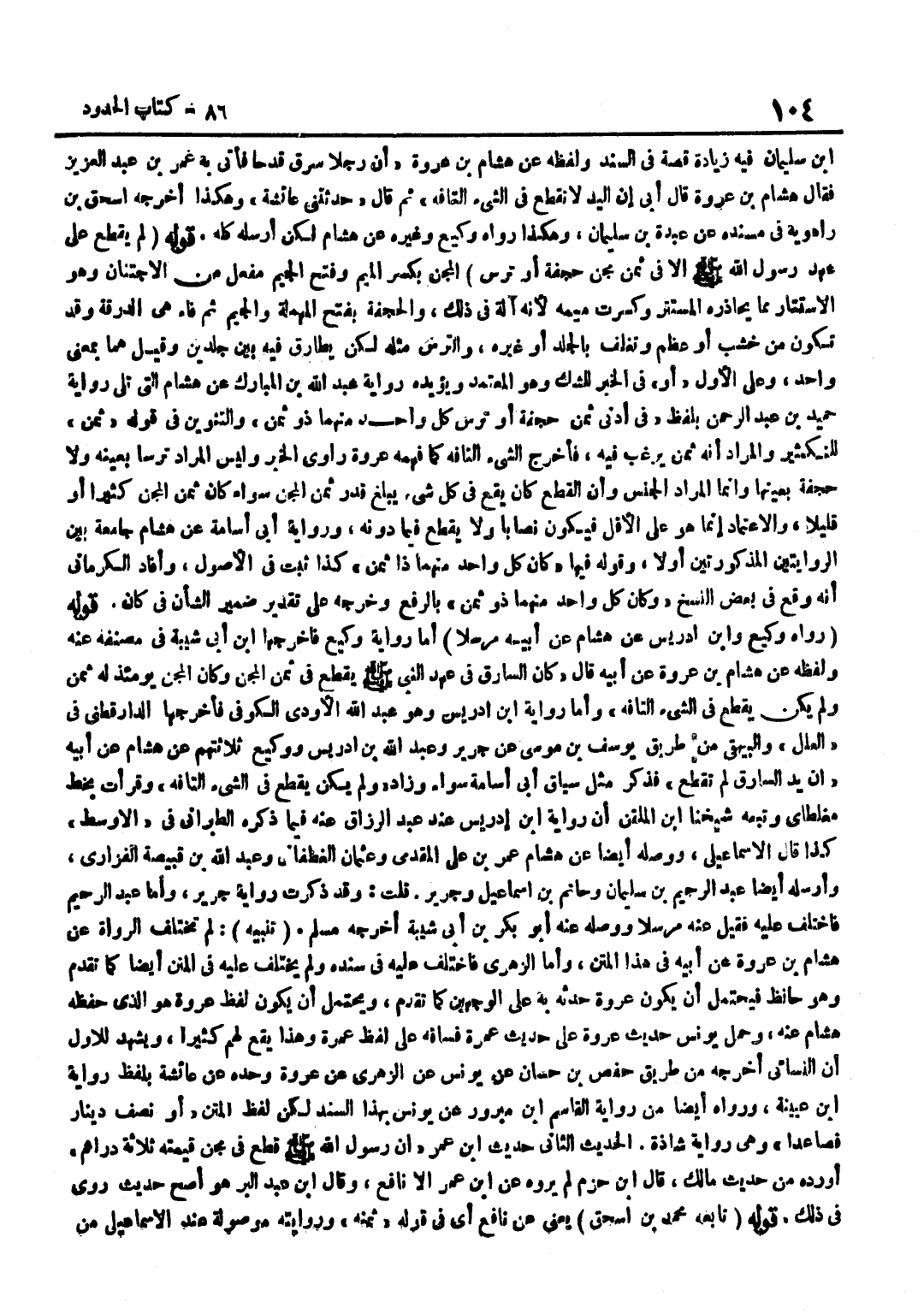 بْنِ سُلَيْمَانَ فِيهِ زِيَادَةُ قِصَّةٍ فِي السَّنَدِ وَلَفْظُهُ عَنْ هِشَامِ بْنِ عُرْوَةَ أَنَّ رَجُلًا سَرَقَ قَدَحًا فَأُتِيَ بِهِ عُمَرَ بْنَ عَبْدِ الْعَزِيزِ فَقَالَ هِشَامُ بْنُ عُرْوَةَ قَالَ أَبِي إِنَّ الْيَدَ لَا تُقْطَعُ فِي الشَّيْءِ التَّافِهِ ثُمَّ قَالَ حَدَّثَتْنِي عَائِشَةُ وَهَكَذَا أَخْرَجَهُ إِسْحَاقُ بْنُ رَاهْوَيْهِ فِي مُسْنَدِهِ عَنْ عَبْدَةَ بْنِ سُلَيْمَانَ وَهَكَذَا رَوَاهُ وَكِيعٌ وَغَيْرُهُ عَنْ هِشَامٍ لَكِنْ أَرْسَلَهُ كُلَّهُ قَوْلُهُ لَمْ يُقْطَعْ عَلَى عَهْدِ رَسُولِ اللَّهِ صَلَّى اللَّهُ عَلَيْهِ وَسَلَّمَ إِلَّا فِي ثَمَنِ مِجَنٍّ حَجَفَةٍ أَوْ تُرْسٍ الْمِجَنُّ بِكَسْرِ الْمِيمِ وَفَتْحِ الْجِيمِ مِفْعَلٌ مِنَ الِاجْتِنَانِ وَهُوَ الِاسْتِتَارُ مِمَّا يُحَاذِرهُ الْمُسْتَتِرُ وَكُسِرَتْ مِيمُهُ لِأَنَّهُ آلَةٌ فِي ذَلِكَ وَالْحَجَفَةُ بِفَتْحِ الْمُهْمَلَةِ وَالْجِيمِ ثُمَّ فَاءٌ هِيَ الدَّرَقَةُ وَقَدْ تَكُونُ مِنْ خَشَبٍ أَوْ عَظْمٍ وَتُغَلَّفُ بِالْجِلْدِ أَوْ غَيْرِهِ وَالتُّرْسُ مِثْلُهُ لَكِنْ يُطَارَقُ فِيهِ بَيْنَ جِلْدَيْنِ وَقِيلَ هُمَا بِمَعْنًى وَاحِدٍ وَعَلَى الْأَوَّلِ أَوْ فِي الْخَبَرِ لِلشَّكِّ وَهُوَ الْمُعْتَمَدُ وَيُؤَيِّدُهُ رِوَايَةِ عَبْدِ اللَّهِ بْنِ الْمُبَارَكِ عَنْ هِشَامٍ الَّتِي تَلِي رِوَايَةَ حُمَيْدِ بْنِ عَبْدِ الرَّحْمَنِ بِلَفْظِ فِي أَدْنَى ثَمَنِ حَجَفَةٍ أَوْ تُرْسٍ كُلُّ وَاحِدٍ مِنْهُمَا ذُو ثَمَنٍ وَالتَّنْوِينُ فِي قَوْلِهِ ثَمَنٍ لِلتَّكْثِيرِ وَالْمُرَادُ أَنَّهُ ثَمَنٌ يُرْغَبُ فِيهِ فَأُخْرِجَ الشَّيْءُ التَّافِهُ كَمَا فَهِمَهُ عُرْوَةُ رَاوِي الْخَبَرِ وَلَيْسَ الْمُرَادُ تُرْسًا بِعَيْنِهِ وَلَا حَجَفَةً بِعَيْنِهَا وَإِنَّمَا الْمُرَادُ الْجِنْسُ وَأَنَّ الْقَطْعَ كَانَ يَقَعُ فِي كُلِّ شَيْءٍ يَبْلُغُ قَدْرَ ثَمَنِ الْمِجَنِّ سَوَاءٌ كَانَ ثَمَنُ الْمِجَنِّ كَثِيرًا أَوْ قَلِيلًا وَالِاعْتِمَادُ إِنَّمَا هُوَ عَلَى الْأَقَلِّ فَيَكُونُ نِصَابًا وَلَا يُقْطَعُ فِيمَا دُونَهُ وَرِوَايَةُ أَبِي أُسَامَةَ عَنْ هِشَامٍ جَامِعَةٌ بَيْنَ الرِّوَايَتَيْنِ الْمَذْكُورَتَيْنِ أَوَّلًا وَقَوْلُهُ فِيهَا كَانَ كُلُّ وَاحِدٍ مِنْهُمَا ذَا ثَمَنٍ كَذَا ثَبَتَ فِي الْأُصُولِ وَأَفَادَ الْكِرْمَانِيُّ أَنَّهُ وَقَعَ فِي بَعْضِ النّسخ وَكَانَ كل وَاحِد مِنْهُمَا ذَا ثَمَنٍ بِالرَّفْعِ وَخَرَّجَهُ عَلَى تَقْدِيرِ ضَمِيرِ الشَّأْنِ فِي كَانَ قَوْله رَوَاهُ وَكِيع وبن إِدْرِيسَ عَنْ هِشَامٍ عَنْ أَبِيهِ مُرْسَلًا أَمَّا رِوَايَة وَكِيع فأخرجها بن أَبِي شَيْبَةَ فِي مُصَنَّفِهِ عَنْهُ وَلَفْظُهُ عَنْ هِشَامِ بْنِ عُرْوَةَ عَنْ أَبِيهِ قَالَ كَانَ السَّارِقُ فِي عَهْدِ النَّبِيِّ صَلَّى اللَّهُ عَلَيْهِ وَسَلَّمَ يُقْطَعُ فِي ثَمَنِ الْمِجَنِّ وَكَانَ الْمِجَنُّ يَوْمئِذٍ لَهُ ثَمَنٌ وَلَمْ يَكُنْ يُقْطَعُ فِي الشَّيْء التافه وَأما رِوَايَة بن إِدْرِيسَ وَهُوَ عَبْدُ اللَّهِ الْأَوْدِيُّ الْكُوفِيُّ فَأَخْرَجَهَا الدَّارَقُطْنِيُّ فِي الْعِلَلِ وَالْبَيْهَقِيُّ مِنْ طَرِيقِ يُوسُفَ بْنِ مُوسَى عَنْ جَرِيرٍ وَعَبْدِ اللَّهِ بْنِ إِدْرِيسَ وَوَكِيعٍ ثَلَاثَتُهُمْ عَنْ هِشَامٍ عَنْ أَبِيهِ أَنَّ يَدَ السَّارِقِ لَمْ تُقْطَعْ فَذَكَرَ مِثْلَ سِيَاقِ أَبِي أُسَامَةَ سَوَاءً وَزَادَ وَلَمْ يَكُنْ يُقْطَعُ فِي الشَّيْءِ التَّافِهِ وَقَرَأْتُ بِخَطِّ مُغَلْطَايْ وَتَبعهُ شَيخنَا بن الملقن أَن رِوَايَة بن إِدْرِيسَ عِنْدَ عَبْدِ الرَّزَّاقِ عَنْهُ فِيمَا ذَكَرَهُ الطَّبَرَانِيُّ فِي الْأَوْسَطِ كَذَا قَالَ الْإِسْمَاعِيلِيُّ وَوَصَلَهُ أَيْضًا عَنْ هِشَامٍ عُمَرُ بْنُ عَلِيٍّ 