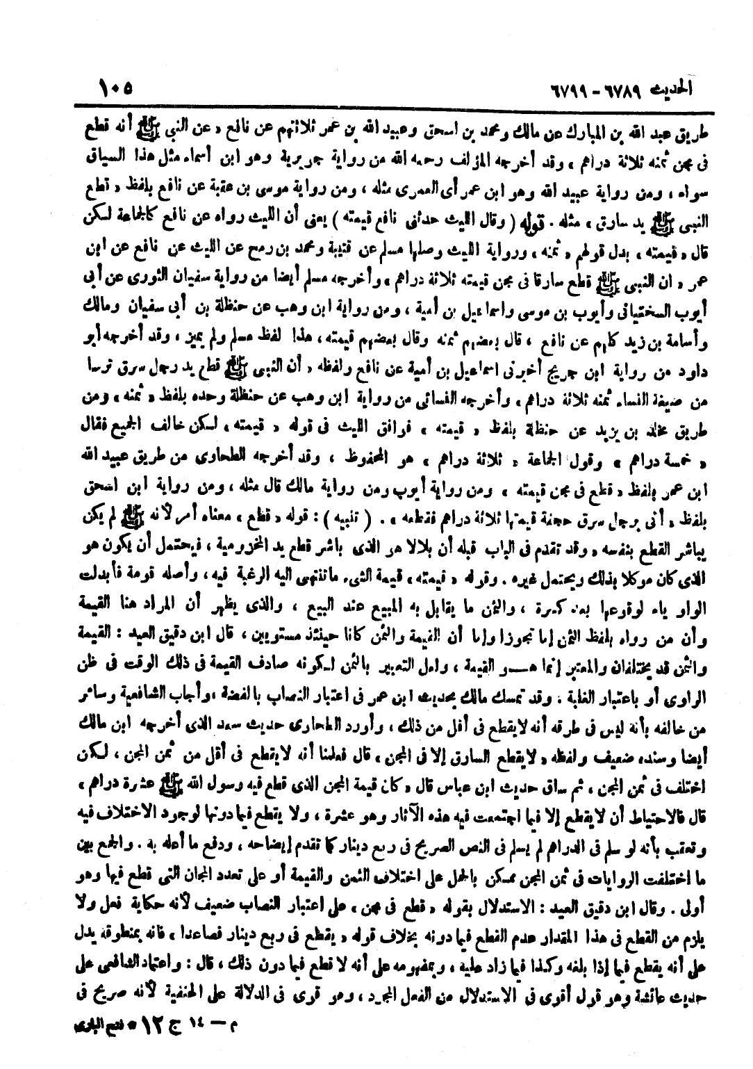 [6798] قَطَعَ النَّبِيُّ صَلَّى اللَّهُ عَلَيْهِ وَسَلَّمَ يَدَ سَارِقٍ مِثْلَهُ قَوْلُهُ وَقَالَ اللَّيْثُ حَدَّثَنِي نَافِعٌ قِيمَتُهُ يَعْنِي أَنَّ اللَّيْثَ رَوَاهُ عَنْ نَافِعٍ كَالْجَمَاعَةِ لَكِنْ قَالَ قِيمَتُهُ بَدَلَ قَوْلِهِمْ ثَمَنُهُ وَرِوَايَةُ اللَّيْثِ وَصَلَهَا مُسْلِمٌ عَنْ قُتَيْبَةَ وَمُحَمَّدِ بْنِ رُمْحٍ عَن اللَّيْث عَن نَافِع عَن بْنِ عُمَرَ أَنَّ النَّبِيَّ صَلَّى اللَّهُ عَلَيْهِ وَسَلَّمَ قَطَعَ سَارِقًا فِي مِجَنٍّ قِيمَتُهُ ثَلَاثَةُ دَرَاهِمَ وَأَخْرَجَهُ مُسْلِمٌ أَيْضًا مِنْ رِوَايَةِ سُفْيَانَ الثَّوْرِيِّ عَنْ أَبِي أَيُّوبَ السَّخْتِيَانِيِّ وَأَيُّوبَ بْنِ مُوسَى وَإِسْمَاعِيل بن أُميَّة وَمن رِوَايَة بن وَهْبٍ عَنْ حَنْظَلَةَ بْنِ أَبِي سُفْيَانَ وَمَالِكٍ وَأُسَامَةَ بْنِ زَيْدٍ كُلِّهِمْ عَنْ نَافِعٍ قَالَ بَعْضُهُمْ ثَمَنُهُ وَقَالَ بَعْضُهُمْ قِيمَتُهُ هَذَا لَفْظُ مُسْلِمٍ وَلَمْ يُمَيِّزْ وَقَدْ أَخْرَجَهُ أَبُو دَاوُدَ من رِوَايَة بن جُرَيْجٍ أَخْبَرَنِي إِسْمَاعِيلُ بْنُ أُمَيَّةَ عَنْ نَافِعٍ وَلَفْظُهُ أَنَّ النَّبِيَّ صَلَّى اللَّهُ عَلَيْهِ وَسَلَّمَ قطع يَد رجل سرق ترسا من صِيغَة النِّسَاءِ ثَمَنُهُ ثَلَاثَةُ دَرَاهِمَ وَأَخْرَجَهُ النَّسَائِيُّ مِنْ رِوَايَة بن وَهْبٍ عَنْ حَنْظَلَةَ وَحْدَهُ بِلَفْظِ ثَمَنُهُ وَمِنْ طَرِيقِ مَخْلَدِ بْنِ يَزِيدَ عَنْ حَنْظَلَةَ بِلَفْظِ قِيمَتُهُ فَوَافَقَ اللَّيْثَ فِي قَوْلِهِ قِيمَتُهُ لَكِنْ خَالَفَ الْجَمِيعَ فَقَالَ خَمْسَةُ دَرَاهِمَ وَقَوْلُ الْجَمَاعَةِ ثَلَاثَةُ دَرَاهِمَ هُوَ الْمَحْفُوظُ وَقَدْ أَخْرَجَهُ الطَّحَاوِيُّ مِنْ طَرِيقِ عُبَيْدِ اللَّهِ بْنِ عُمَرَ بِلَفْظِ قَطَعَ فِي مِجَنٍّ قِيمَتُهُ وَمِنْ رِوَايَةِ أَيُّوبَ وَمِنْ رِوَايَةِ مَالِكٍ قَالَ مِثْلَهُ وَمِنْ رِوَايَةِ بن إِسْحَاقَ بِلَفْظِ أُتِيَ بِرَجُلٍ سَرَقَ حَجَفَةً قِيمَتُهَا ثَلَاثَةُ دَرَاهِمَ فَقَطَعَهُ تَنْبِيهٌ قَوْلُهُ قَطَعَ مَعْنَاهُ أَمَرَ لِأَنَّهُ صَلَّى اللَّهُ عَلَيْهِ وَسَلَّمَ لَمْ يَكُنْ يُبَاشِرُ الْقَطْعَ بِنَفْسِهِ وَقَدْ تَقَدَّمَ فِي الْبَابِ قَبْلَهُ أَنَّ بِلَالًا هُوَ الَّذِي بَاشَرَ قَطْعَ يَدِ الْمَخْزُومِيَّةِ فَيَحْتَمِلُ أَنْ يَكُونَ هُوَ الَّذِي كَانَ مُوكَلًا بِذَلِكَ وَيَحْتَمِلُ غَيْرُهُ وَقَوْلُهُ قِيمَتُهُ قِيمَةُ الشَّيْءِ مَا تَنْتَهِي إِلَيْهِ الرَّغْبَةُ فِيهِ وَأَصْلُهُ قِوْمَةٌ فَأُبْدِلَتِ الْوَاوُ يَاءً لِوُقُوعِهَا بَعْدَ كَسْرَةٍ وَالثَّمَنُ مَا يُقَابَلُ بِهِ الْمَبِيعُ عِنْدَ الْبَيْعِ وَالَّذِي يَظْهَرُ أَنَّ الْمُرَادَ هُنَا الْقِيمَةُ وَأَنَّ مَنْ رَوَاهُ بِلَفْظِ الثَّمَنِ إِمَّا تَجَوُّزًا وَإِمَّا أَنَّ الْقِيمَةَ وَالثَّمَنَ كَانَا حِينَئِذٍ مستويين قَالَ بن دَقِيقِ الْعِيدِ الْقِيمَةُ وَالثَّمَنُ قَدْ يَخْتَلِفَانِ وَالْمُعْتَبَرُ إِنَّمَا هُوَ الْقِيمَةُ وَلَعَلَّ التَّعْبِيرَ بِالثَّمَنِ لِكَوْنِهِ صَادَفَ الْقِيمَةَ فِي ذَلِكَ الْوَقْتِ فِي ظَنِّ الرَّاوِي أَوْ بِاعْتِبَارِ الْغَلَبَةِ وَقَدْ تَمَسَّكَ مَالِكٌ بِحَدِيث بن عُمَرَ فِي اعْتِبَارِ النِّصَابِ بِالْفِضَّةِ وَأَجَابَ الشَّافِعِيَّةُ وَسَائِرُ مَنْ خَالَفَهُ بِأَنَّهُ لَيْسَ فِي طُرُقِهِ أَنَّهُ لَا يُقْطَعُ فِي أَقَلَّ مِنْ ذَلِكَ وَأورد الطَّحَاوِيّ حَدِيث سعد الَّذِي أخرجه بن مَالِكٍ أَيْضًا وَسَنَدُهُ ضَعِيفٌ وَلَفْظُهُ لَا يُقْطَعُ السَّارِقُ إِلَّا فِي الْمِجَنِّ قَالَ فَعَلِمْنَا أَنَّهُ لَا يُقْطَعُ فِي أَقَلَّ مِنْ ثَمَنِ الْمِجَنِّ لَكِن اخْتُلِفَ فِي ثَمَنِ الْمِجَنِّ ثُمَّ سَاقَ حَدِيثَ بن عَبَّاسٍ قَالَ كَانَ قِيمَةُ الْمِجَنِّ الَّذِي قَطَعَ فِي