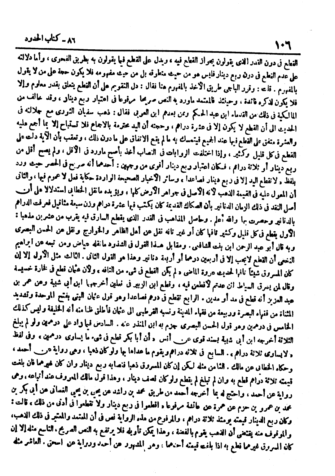 الْقَطْعِ فِي دُونِ الْقَدْرِ الَّذِي يَقُولُونَ بِجَوَازِ الْقَطْعِ فِيهِ وَيَدُلُّ عَلَى الْقَطْعِ فِيمَا يَقُولُونَ بِهِ بِطَرِيقِ الْفَحْوَى وَأَمَّا دَلَالَتُهُ عَلَى عَدَمِ الْقَطْعِ فِي دُونِ رُبْعِ دِينَارٍ فَلَيْسَ هُوَ مِنْ حَيْثُ مَنْطُوقُهُ بَلْ مِنْ حَيْثُ مَفْهُومُهُ فَلَا يَكُونُ حُجَّةً عَلَى مَنْ لَا يَقُولُ بِالْمَفْهُومِ قُلْتُ وَقَرَّرَ الْبَاجِيُّ طَرِيقَ الْأَخْذِ بِالْمَفْهُومِ هُنَا فَقَالَ دَلَّ التَّقْوِيمُ عَلَى أَنَّ الْقَطْعَ يَتَعَلَّقُ بِقَدْرٍ مَعْلُومٍ وَإِلَّا فَلَا يَكُونُ لِذِكْرِهِ فَائِدَةٌ وَحِينَئِذٍ فَالْمُعْتَمَدُ مَا وَرَدَ بِهِ النَّصُّ صَرِيحًا مَرْفُوعًا فِي اعْتِبَارِ رُبْعِ دِينَارٍ وَقَدْ خَالَفَ مِنَ الْمَالِكِيَّةِ فِي ذَلِكَ مِنَ الْقُدَمَاءِ بن عبد الحكم وَمِمَّنْ بعدهمْ بن الْعَرَبِيِّ فَقَالَ ذَهَبَ سُفْيَانُ الثَّوْرِيُّ مَعَ جَلَالَتِهِ فِي الْحَدِيثِ إِلَى أَنَّ الْقَطْعَ لَا يَكُونُ إِلَّا فِي عَشَرَةِ دَرَاهِمَ وَحُجَّتُهُ أَنَّ الْيَدَ مُحْتَرَمَةٌ بِالْإِجْمَاعِ فَلَا تُسْتَبَاحُ إِلَّا بِمَا أُجْمِعَ عَلَيْهِ وَالْعَشَرَةُ مُتَّفَقٌ عَلَى الْقَطْعِ فِيهَا عِنْدَ الْجَمِيعِ فَيُتَمَسَّكُ بِهِ مَا لَمْ يَقَعِ الِاتِّفَاقُ عَلَى مَا دُونَ ذَلِكَ وَتُعُقِّبَ بِأَنَّ الْآيَةَ دَلَّتْ عَلَى الْقَطْعِ فِي كُلِّ قَلِيلٍ وَكَثِيرٍ وَإِذَا اخْتَلَفَتِ الرِّوَايَاتُ فِي النِّصَابِ أُخِذَ بِأَصَحِّ مَا وَرَدَ فِي الْأَقَلِّ وَلَمْ يَصِحَّ أَقَلُّ مِنْ رُبْعِ دِينَارٍ أَوْ ثَلَاثَةِ دَرَاهِمَ فَكَانَ اعْتِبَارُ رُبْعِ دِينَارٍ أَقْوَى مِنْ وَجْهَيْنِ أَحَدُهُمَا أَنَّهُ صَرِيحٌ فِي الْحَصْرِ حَيْثُ وَرَدَ بِلَفْظِ لَا تُقْطَعُ الْيَدُ إِلَّا فِي رُبْعِ دِينَارٍ فَصَاعِدًا وَسَائِرُ الْأَخْبَارِ الصَّحِيحَةِ الْوَارِدَةِ حِكَايَةُ فِعْلٍ لَا عُمُومَ فِيهَا وَالثَّانِي أَنَّ الْمُعَوَّلَ عَلَيْهِ فِي الْقِيمَةِ الذَّهَبُ لِأَنَّهُ الْأَصْلُ فِي جَوَاهِرِ الْأَرْضِ كُلِّهَا وَيُؤَيِّدهُ مَا نَقَلَ الْخَطَّابِيُّ اسْتِدْلَالًا عَلَى أَنَّ أَصْلَ النَّقْدِ فِي ذَلِكَ الزَّمَانِ الدَّنَانِيرُ بِأَنَّ الصِّكَاكَ الْقَدِيمَةَ كَانَ يُكْتَبُ فِيهَا عَشَرَةُ دَرَاهِمَ وَزْنُ سَبْعَةِ مَثَاقِيلَ فَعُرِفَتِ الدَّرَاهِمُ بِالدَّنَانِيرِ وَحُصِرَتْ بِهَا وَاللَّهُ أَعْلَمُ وَحَاصِلُ الْمَذَاهِبِ فِي الْقَدْرِ الَّذِي يُقْطَعُ السَّارِقُ فِيهِ يَقْرُبُ مِنْ عِشْرِينَ مَذْهَبًا الْأَوَّلُ يُقْطَعُ فِي كُلِّ قَلِيلٍ وَكَثِيرٍ تَافِهًا كَانَ أَوْ غَيْرَ تَافِهٍ نُقِلَ عَنْ أَهْلِ الظَّاهِرِ وَالْخَوَارِجِ وَنُقِلَ عَنِ الْحَسَنِ الْبَصْرِيِّ وَبِهِ قَالَ أَبُو عَبْدِ الرَّحْمَنِ بْنُ بِنْتِ الشَّافِعِيِّ وَمُقَابِلُ هَذَا الْقَوْلِ فِي الشُّذُوذِ مَا نَقَلَهُ عِيَاضٌ وَمَنْ تَبِعَهُ عَنْ إِبْرَاهِيمَ النَّخَعِيِّ أَنَّ الْقَطْعَ لَا يَجِبُ إِلَّا فِي أَرْبَعِينَ دِرْهَمًا أَوْ أَرْبَعَةِ دَنَانِيرَ وَهَذَا هُوَ الْقَوْلُ الثَّانِي الثَّالِثُ مِثْلُ الْأَوَّلِ إِلَّا إِنْ كَانَ الْمَسْرُوقُ شَيْئًا تَافِهًا لِحَدِيثِ عُرْوَةَ الْمَاضِي لَمْ يَكُنِ الْقَطْعُ فِي شَيْءٍ مِنَ التَّافِهِ وَلِأَنَّ عُثْمَانَ قَطَعَ فِي فَخَّارَةٍ خَسِيسَةٍ وَقَالَ لِمَنْ يَسْرِقُ السِّيَاطَ لَئِنْ عُدْتُمْ لَأَقْطَعَنَّ فِيهِ وَقطع بن الزبير فِي نَعْلَيْنِ أخرجهُمَا بن أَبِي شَيْبَةَ وَعَنْ عُمَرَ بْنِ عَبْدِ الْعَزِيزِ أَنَّهُ قَطَعَ فِي مُدٍّ أَوْ مُدَّيْنِ الرَّابِعُ تُقْطَعُ فِي دِرْهَمٍ فَصَاعِدًا وَهُوَ قَوْلُ عُثْمَانَ الْبَتِّيِّ بِفَتْحِ الْمُوَحَّدَةِ وَتَشْدِيدِ الْمُثَنَّاةِ مِنْ فُقَهَاءِ الْبَصْرَةِ وَرَبِيعَ