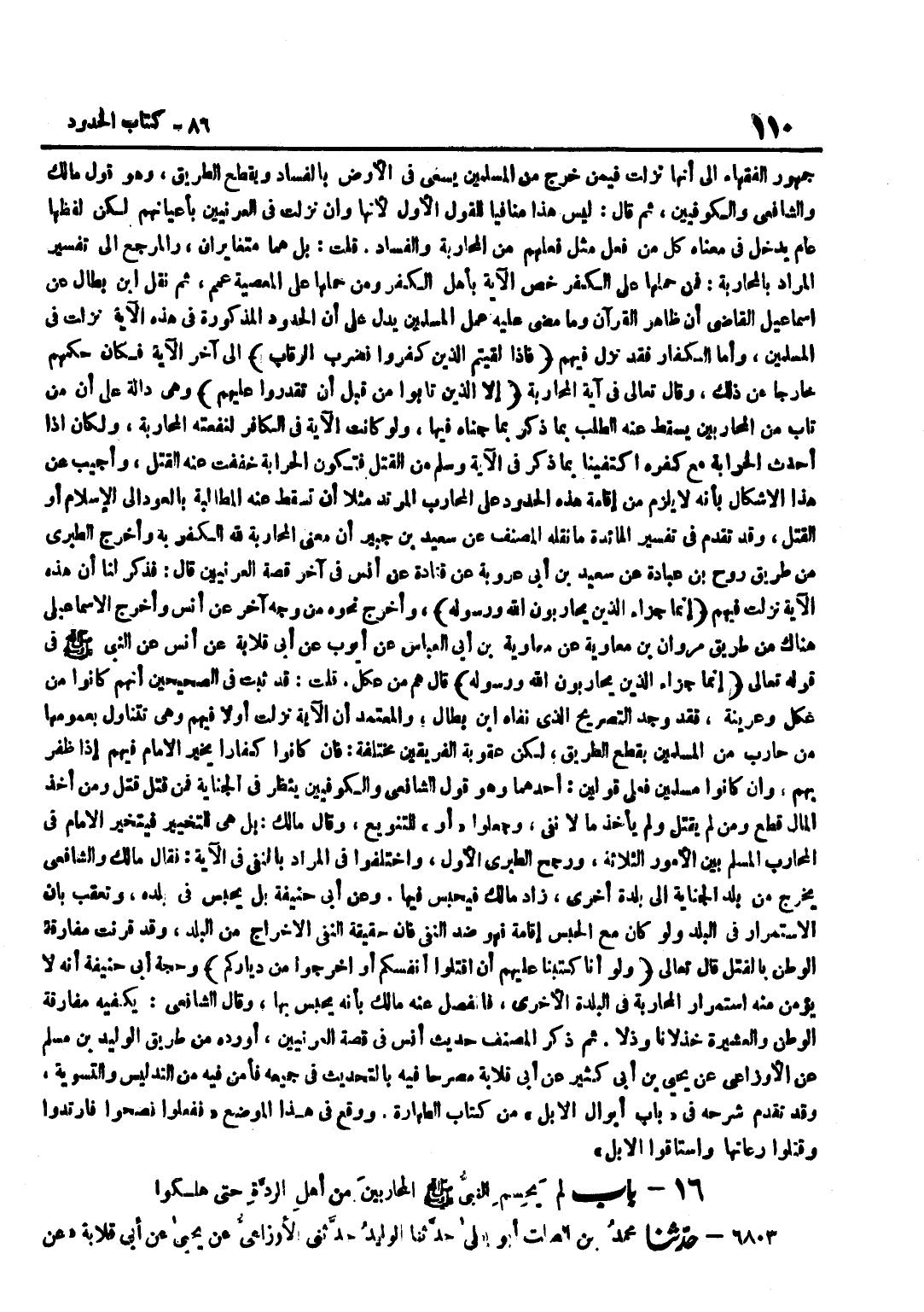 جُمْهُورُ الْفُقَهَاءِ إِلَى أَنَّهَا نَزَلَتْ فِيمَنْ خَرَجَ مِنَ الْمُسْلِمِينَ يَسْعَى فِي الْأَرْضِ بِالْفَسَادِ وَيَقْطَعُ الطَّرِيقَ وَهُوَ قَوْلُ مَالِكٍ وَالشَّافِعِيِّ وَالْكُوفِيِّينَ ثُمَّ قَالَ لَيْسَ هَذَا مُنَافِيًا لِلْقَوْلِ الْأَوَّلِ لِأَنَّهَا وَإِنْ نَزَلَتْ فِي الْعُرَنِيِّينَ بِأَعْيَانِهِمْ لَكِنَّ لَفْظَهَا عَامٌّ يَدْخُلُ فِي مَعْنَاهُ كُلُّ مَنْ فَعَلَ مِثْلَ فِعْلِهِمْ مِنَ الْمُحَارَبَةِ وَالْفَسَادِ قُلْتُ بَلْ هُمَا مُتَغَايِرَانِ وَالْمَرْجِعُ إِلَى تَفْسِيرِ الْمُرَادِ بِالْمُحَارَبَةِ فَمَنْ حَمَلَهَا عَلَى الْكُفْرِ خَصَّ الْآيَةَ بِأَهْلِ الْكُفْرِ وَمَنْ حَمَلَهَا عَلَى الْمَعْصِيَةِ عَمَّمَ ثُمَّ نقل بن بَطَّالٍ عَنْ إِسْمَاعِيلَ الْقَاضِي أَنَّ ظَاهِرَ الْقُرْآنِ وَمَا مَضَى عَلَيْهِ عَمَلُ الْمُسْلِمِينَ يَدُلُّ عَلَى أَنَّ الْحُدُودَ الْمَذْكُورَةَ فِي هَذِهِ الْآيَةِ نَزَلَتْ فِي الْمُسْلِمِينَ وَأَمَّا الْكُفَّارُ فَقَدْ نَزَلَ فِيهِمْ فَإِذا لَقِيتُم الَّذين كفرُوا فَضرب الرّقاب إِلَى آخِرِ الْآيَةِ فَكَانَ حُكْمُهُمْ خَارِجًا عَنْ ذَلِكَ وَقَالَ تَعَالَى فِي آيَةِ الْمُحَارَبَةِ إِلَّا الَّذِينَ تَابُوا مِنْ قَبْلِ أَنْ تَقْدِرُوا عَلَيْهِمْ وَهِيَ دَالَّةٌ عَلَى أَنَّ مَنْ تَابَ مِنَ الْمُحَارِبِينَ يَسْقُطُ عَنْهُ الطَّلَبُ بِمَا ذُكِرَ بِمَا جَنَاهُ فِيهَا وَلَوْ كَانَتِ الْآيَةُ فِي الْكَافِرِ لَنَفَعَتْهُ الْمُحَارَبَةُ وَلَكَانَ إِذَا أَحْدَثَ الْحِرَابَةَ مَعَ كُفْرِهِ اكْتَفَيْنَا بِمَا ذُكِرَ فِي الْآيَةِ وَسَلِمَ مِنَ الْقَتْلِ فَتَكُونُ الْحِرَابَةُ خَفَّفَتْ عَنْهُ الْقَتْلَ وَأُجِيبَ عَنْ هَذَا الْإِشْكَالِ بِأَنَّهُ لَا يَلْزَمُ مِنْ إِقَامَةِ هَذِهِ الْحُدُودِ عَلَى الْمُحَارِبِ الْمُرْتَدِّ مَثَلًا أَنْ تَسْقُطَ عَنْهُ الْمُطَالَبَةُ بِالْعَوْدِ إِلَى الْإِسْلَامِ أَوِ الْقَتْلِ وَقَدْ تَقَدَّمَ فِي تَفْسِيرِ الْمَائِدَةِ مَا نَقَلَهُ الْمُصَنِّفُ عَنْ سَعِيدِ بْنِ جُبَيْرٍ أَنَّ مَعْنَى الْمُحَارَبَةِ لِلَّهِ الْكُفْرُ بِهِ وَأَخْرَجَ الطَّبَرِيُّ مِنْ طَرِيقِ رَوْحِ بْنِ عُبَادَةَ عَنْ سَعِيدِ بْنِ أَبِي عَرُوبَةَ عَنْ قَتَادَةَ عَنْ أَنَسٍ فِي آخِرِ قِصَّةِ الْعُرَنِيِّينَ قَالَ فَذَكَرَ لَنَا أَنَّ هَذِهِ الْآيَةَ نَزَلَتْ فِيهِمْ إِنَّمَا جَزَاء الَّذين يُحَاربُونَ الله وَرَسُوله وَأَخْرَجَ نَحْوَهُ مِنْ وَجْهٍ آخَرَ عَنْ أَنَسٍ وَأَخْرَجَ الْإِسْمَاعِيلِيُّ هُنَاكَ مِنْ طَرِيقِ مَرْوَانَ بْنِ مُعَاوِيَةَ عَنْ مُعَاوِيَةَ بْنِ أَبِي الْعَبَّاسِ عَنْ أَيُّوبَ عَنْ أَبِي قِلَابَةَ عَنْ أَنَسٌ عَنْ النَّبِيِّ صَلَّى اللَّهُ عَلَيْهِ وَسَلَّمَ فِي قَوْلِهِ تَعَالَى إِنَّمَا جَزَاءُ الَّذِينَ يُحَارِبُونَ اللَّهَ وَرَسُولَهُ قَالَ هُمْ مِنْ عُكْلٍ قُلْتُ قَدْ ثَبَتَ فِي الصَّحِيحَيْنِ أَنَّهُمْ كَانُوا مِنْ عُكْلٍ وَعُرَيْنَةَ فقد وجد التَّصْرِيح الَّذِي نَفَاهُ بن بَطَّالٍ وَالْمُعْتَمَدُ أَنَّ الْآيَةَ نَزَلَتْ أَوَّلًا فِيهِمْ وَهِيَ تَتَنَاوَلُ بِعُمُومِهَا مَنْ حَارَبَ مِنَ الْمُسْلِمِينَ بِقَطْعِ الطَّرِيقِ لَكِنَّ عُقُوبَةَ الْفَرِيقَيْنِ مُخْتَلِفَةٌ فَإِنْ كَانُوا كُفَّارًا يُخَيَّرُ الْإِمَامُ فِيهِمْ إِذَا ظَفِرَ بِهِمْ وَإِنْ كَانُوا مُسْلِمِينَ فَعَلَى قَوْلَيْنِ أَحَدُهُمَا وَهُوَ قَوْلُ الشَّافِعِيِّ وَالْكُوفِيِّينَ يُنْظَرُ فِي الْجِنَايَةِ فَمَنْ قَتَلَ قُتِلَ وَمَنْ أَخَذَ الْمَالَ قُطِعَ وَمَنْ لَمْ يَقْتُلْ وَلَمْ يَأْخُذْ مَالًا نُفِيَ وَجَعَلُوا أَوْ لِلتَّنْوِيعِ وَقَالَ مَالِكٌ بَلْ هِيَ لِلتَّخْيِيرِ فَيَتَخَيَّرُ الْإِمَامُ فِي الْمُحَارِبِ الْ