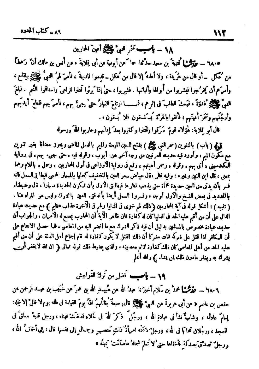 بِفَتْحِ السِّينِ الْمُهْمَلَةِ وَالْمِيمِ بِالْفِعْلِ الْمَاضِي وَيَجُوزُ مُضَافًا بِغَيْرِ تَنْوِينٍ مَعَ سُكُونِ الْمِيمِ وَأَوْرَدَ فِيهِ حَدِيثَ الْعُرَنِيِّينَ مِنْ وَجْهٍ آخَرَ عَنْ أَيُّوبَ وَقَوْلُهُ فِيهِ حَتَّى جِيءَ بِهِمْ فِي رِوَايَةِ الْكُشْمِيهَنِيِّ أُتِيَ بِهِمْ وَقَوْلُهُ وَسَمَرَ أَعْيُنَهُمْ وَقَعَ فِي رِوَايَةِ الْأَوْزَاعِيِّ فِي أَوَّلِ الْمُحَارِبِينَ وَسَمَلَ بِاللَّامِ وَهُمَا بِمَعْنًى قَالَ بن التِّينِ وَغَيْرُهُ وَفِيهِ نَظَرٌ قَالَ عِيَاضٌ سَمَرَ الْعَيْنَ بِالتَّخْفِيفِ كَحَلَهَا بِالْمِسْمَارِ الْمَحْمِيِّ فَيُطَابِقُ السَّمْلَ فَإِنَّهُ فُسِّرَ بِأَنْ يُدْنَى مِنَ الْعَيْنِ حَدِيدَةٌ مُحْمَاةٌ حَتَّى يَذْهَبُ نَظَرُهَا فَيُطَابِقُ الْأَوَّلَ بِأَنْ تَكُونَ الْحَدِيدَةُ مِسْمَارًا قَالَ وَضَبَطْنَاهُ بِالتَّشْدِيدِ فِي بَعْضِ النُّسَخِ وَالْأَوَّلُ أَوْجَهُ وَفَسَّرُوا السَّمْلَ أَيْضًا بِأَنَّهُ فَقْءُ الْعَيْنِ بِالشَّوْكِ وَلَيْسَ هُوَ الْمُرَادَ تَنْبِيهٌ أَشْكَلَ قَوْلُهُ فِي آيَةِ الْمُحَارِبِينَ ذَلِكَ لَهُمْ خِزْيٌ فِي الدُّنْيَا وَلَهُمْ فِي الْآخِرَةِ عَذَاب عَظِيم مَعَ حَدِيثِ عُبَادَةَ الدَّالِّ عَلَى أَنَّ مَنْ أُقِيمَ عَلَيْهِ الْحَدُّ فِي الدُّنْيَا كَانَ لَهُ كَفَّارَةً فَإِنَّ ظَاهِرَ الْآيَةِ أَنَّ الْمُحَارِبَ يُجْمَعُ لَهُ الْأَمْرَانِ وَالْجَوَابُ أَنَّ حَدِيثَ عُبَادَةَ مَخْصُوصٌ بِالْمُسْلِمِينَ بِدَلِيلِ أَنَّ فِيهِ ذِكْرَ الشِّرْكِ مَعَ مَا انْضَمَّ إِلَيْهِ مِنَ الْمَعَاصِي فَلَمَّا حَصَلَ الْإِجْمَاعُ عَلَى أَنَّ الْكَافِرَ إِذَا قُتِلَ عَلَى شِرْكِهِ فَمَاتَ مُشْرِكًا أَنَّ ذَلِكَ الْقَتْلَ لَا يَكُونُ كَفَّارَةً لَهُ قَامَ إِجْمَاعُ أَهْلِ السُّنَّةِ عَلَى أَنَّ مَنْ أُقِيمَ عَلَيْهِ الْحَدُّ مِنْ أَهْلِ الْمَعَاصِي كَانَ ذَلِكَ كَفَّارَةً لِإِثْمِ مَعْصِيَتِهِ وَالَّذِي يَضْبِطُ ذَلِكَ قَوْلِهِ تَعَالَى إِنَّ اللَّهَ لَا يَغْفِرُ أَنْ يُشْرَكَ بِهِ وَيَغْفِرُ مَا دُونَ ذَلِكَ لِمَنْ يَشَاءُ وَالله أعلم