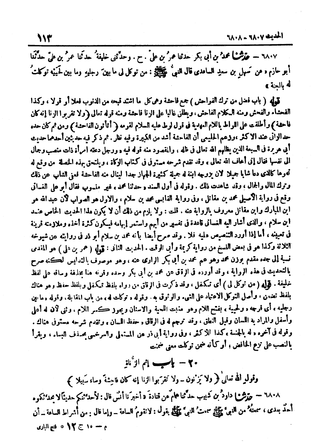 جَمْعُ فَاحِشَةٍ وَهِيَ كُلُّ مَا اشْتَدَّ قُبْحُهُ مِنَ الذُّنُوبِ فِعْلًا أَوْ قَوْلًا وَكَذَا الْفَحْشَاءُ وَالْفُحْشُ وَمِنْهُ الْكَلَامُ الْفَاحِشُ وَيُطْلَقُ غَالِبًا عَلَى الزِّنَا فَاحِشَةً وَمِنْهُ قَوْلُهُ تَعَالَى وَلَا تَقْرَبُوا الزِّنَا إِنَّه كَانَ فَاحِشَة وَأُطْلِقَتْ عَلَى اللِّوَاطِ بِاللَّامِ الْعَهْدِيَّةِ فِي قَوْلِ لوط عَلَيْهِ السَّلَام لِقَوْمِهِ أتأتون الْفَاحِشَة وَمِنْ ثَمَّ كَانَ حَدُّهُ حَدَّ الزَّانِي عِنْدَ الْأَكْثَرِ وَزَعَمَ الْحَلِيمِيُّ أَنَّ الْفَاحِشَةَ أَشَدُّ مِنَ الْكَبِيرَةِ وَفِيهِ نَظَرٌ ثُمَّ ذَكَرَ فِيهِ حَدِيثَيْنِ أَحَدُهُمَا حَدِيثُ أَبِي هُرَيْرَةَ فِي السَّبْعَةِ الَّذِينَ يُظِلُّهُمُ اللَّهُ تَعَالَى فِي ظِلِّهِ وَالْمَقْصُودُ مِنْهُ قَوْلُهُ فِيهِ وَرَجُلٌ دَعَتْهُ امْرَأَةٌ ذَاتُ مَنْصِبٍ وَجَمَالٍ إِلَى نَفْسِهَا فَقَالَ إِنِّي أَخَافُ اللَّهَ تَعَالَى وَقَدْ تَقَدَّمَ شَرْحُهُ مُسْتَوْفًى فِي كِتَابِ الزَّكَاةِ وَيَلْتَحِقُ بِهَذِهِ الْخَصْلَةِ مَنْ وَقَعَ لَهُ نَحْوُهَا كَالَّذِي دَعَا شَابًّا جَمِيلًا لِأَنْ يُزَوِّجَهُ ابْنَةً لَهُ جَمِيلَةً كَثِيرَةَ الْجِهَازِ جِدًّا لِيَنَالَ مِنْهُ الْفَاحِشَة فعفى الشَّابُّ عَنْ ذَلِكَ وَتَرَكَ الْمَالَ وَالْجَمَالَ وَقَدْ شَاهَدْتُ ذَلِكَ وَقَوْلُهُ فِي أَوَّلِ السَّنَدِ حَدَّثَنَا مُحَمَّدٌ غَيْرُ مَنْسُوبٍ فَقَالَ أَبُو عَلِيٍّ الْغَسَّانِيُّ وَقَعَ فِي رِوَايَةِ الْأَصِيلِيِّ مُحَمَّدُ بْنُ مُقَاتِلٍ وَفِي رِوَايَةِ الْقَابِسِيِّ مُحَمَّدُ بْنُ سَلَّامٍ وَالْأَوَّلُ هُوَ الصَّوَاب لِأَن عبد الله هُوَ بن الْمُبَارك وبن مُقَاتِلٍ مَعْرُوفٌ بِالرِّوَايَةِ عَنْهُ قُلْتُ وَلَا يَلْزَمُ مِنْ ذَلِكَ أَنْ لَا يَكُونَ هَذَا الْحَدِيثُ الْخَاص عِنْد بن سَلَّامٍ وَالَّذِي أَشَارَ إِلَيْهِ الْغَسَّانِيُّ قَاعِدَةً فِي تَفْسِيرِ مَنْ أُبْهِمَ وَاسْتَمَرَّ إِبْهَامُهُ فَيَكُونُ كَثْرَةُ أَخْذِهِ وَمُلَازَمَتِهِ قَرِينَةً فِي تَعْيِينِهِ أَمَّا إِذَا أَوْرَدَ التَّنْصِيصَ عَلَيْهِ فَلَا وَقَدْ صَرَّحَ أَيْضًا بِأَنَّهُ مُحَمَّدُ بْنُ سَلَّامٍ أَبُو ذَرٍّ فِي رِوَايَتِهِ عَنْ شُيُوخِهِ الثَّلَاثَةِ وَكَذَا هُوَ فِي بَعْضِ النُّسَخِ مِنْ رِوَايَةِ كَرِيمَةَ وَأَبِي الْوَقْتِ الحَدِيث الثَّانِي قَوْلُهُ عُمَرُ بْنُ عَلِيٍّ هُوَ الْمُقَدَّمِيُّ نِسْبَةً إِلَى جَدِّهِ مُقَدَّمٍ بِوَزْنِ مُحَمَّدٍ وَهُوَ عَمُّ مُحَمَّدِ بْنِ أَبِي بَكْرٍ الرَّاوِي عَنْهُ وَهُوَ مَوْصُوفٌ بِالتَّدْلِيسِ لَكِنَّهُ صَرَّحَ بِالتَّحْدِيثِ فِي هَذِهِ الرِّوَايَةِ وَقَدْ أَوْرَدَهُ فِي الرِّقَاقِ عَنْ مُحَمَّدِ بْنِ أَبِي بَكْرٍ وَحْدَهُ وَقَرَنَهُ هُنَا بِخَلِيفَةَ وَسَاقَهُ عَلَى لَفْظِ خَلِيفَةَ قَوْلُهُ مَنْ تَوَكَّلَ لِي أَيْ تَكَفَّلَ وَقَدْ ذَكَرْتُ فِي الرِّقَاقِ مَنْ رَوَاهُ بِلَفْظِ تَكَفَّلَ وَبِلَفْظِ حَفِظَ وَهُوَ هُنَاكَ بِلَفْظِ تَضَمَّنَ وَأَصْلُ التَّوَكُّلِ الِاعْتِمَادُ عَلَى الشَّيْءِ وَالْوُثُوقُ بِهِ وَقَوْلُهُ تَوَكَّلْتُ لَهُ مِنْ بَابِ الْمُقَابَلَةِ وَقَوْلُهُ مَا بَيْنَ رِجْلَيْهِ أَيْ فَرْجِهِ وَلَحْيَيْهِ بِفَتْحِ اللَّامِ وَهُوَ مَنْبَتُ اللِّحْيَةِ وَالْأَسْنَانِ وَيَجُوزُ كَسْرُ اللَّامِ وَثُنِّيَ لِأَنَّ لَهُ أَعْلَى وَأَسْفَلَ وَالْمُرَادُ بِهِ اللِّسَانُ وَقِيلَ النُّطْقُ وَقَدْ تَرْجَمَ لَهُ فِي الرِّقَاقِ حِفْظَ اللِّسَانِ وَتَقَدَّمَ شَرْحُهُ مُسْتَوْفًى هُنَاكَ وَقَوْلُهُ فِي آخِرِهِ لَهُ بِالْجَنَّةِ كَذَا لِلْأَكْثَرِ وَفِي رِوَايَةِ أَبِي ذَرٍّ عَنْ الْمُسْتَمْلِي وَالسَّرَخْسِيِّ بِحَذْفِ الْبَاءِ وَيُقْرَأُ بِالنَّصْبِ عَلَى نَ