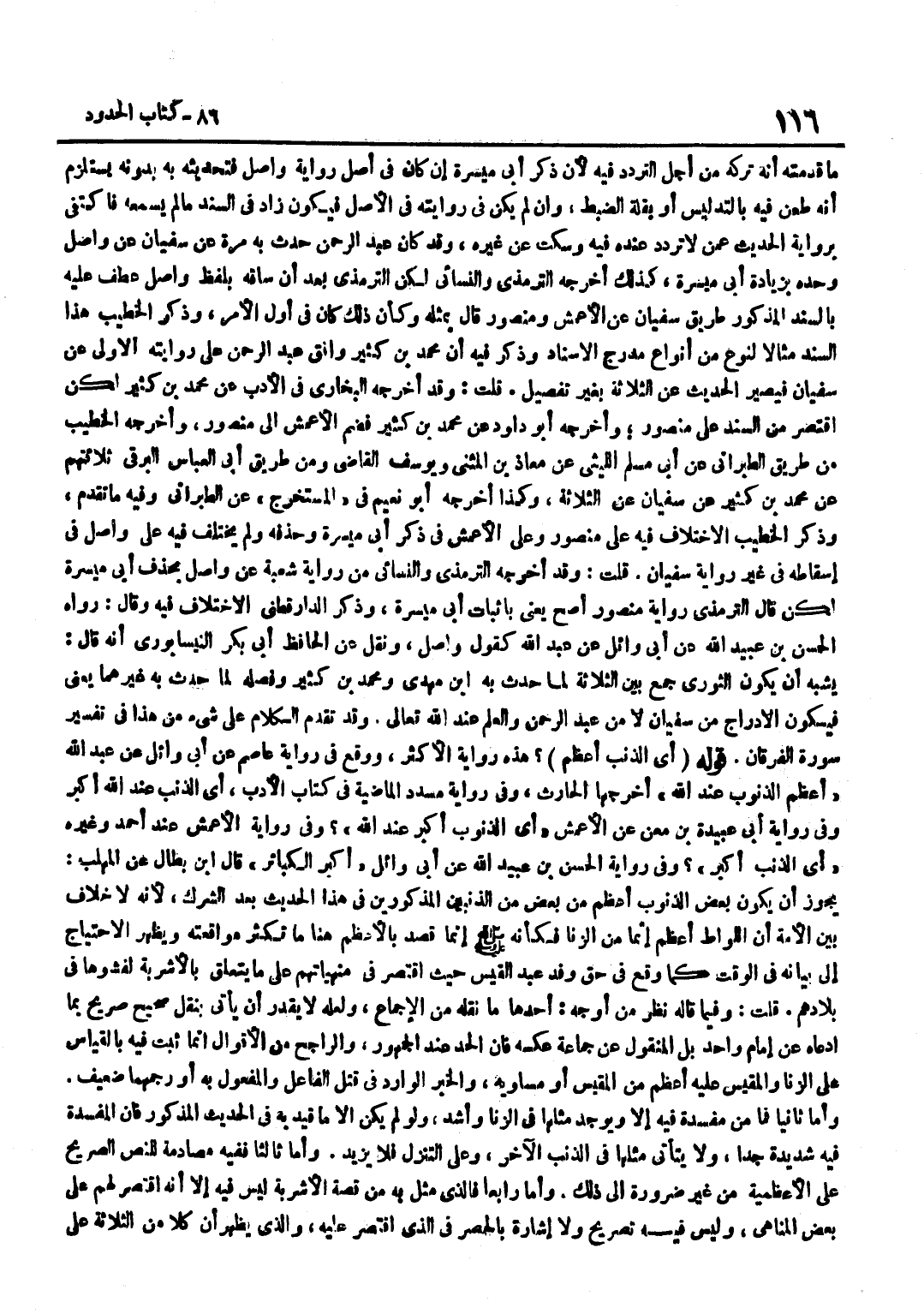 مَا قَدَّمْتُهُ أَنَّهُ تَرَكَهُ مِنْ أَجْلِ التَّرَدُّدِ فِيهِ لِأَنَّ ذِكْرَ أَبِي مَيْسَرَةَ إِنْ كَانَ فِي أَصْلِ رِوَايَةِ وَاصِلٍ فَتَحْدِيثُهُ بِهِ بِدُونِهِ يَسْتَلْزِمُ أَنَّهُ طَعْنٌ فِيهِ بِالتَّدْلِيسِ أَوْ بِقِلَّةِ الضَّبْطِ وَإِنْ لَمْ يَكُنْ فِي رِوَايَتِهِ فِي الْأَصْلِ فَيَكُونُ زَادَ فِي السَّنَدِ مَا لَمْ يَسْمَعْهُ فَاكْتَفَى بِرِوَايَةِ الْحَدِيثِ عَمَّنْ لَا تَرَدُّدَ عِنْدَهُ فِيهِ وَسَكَتَ عَنْ غَيْرِهِ وَقَدْ كَانَ عَبْدُ الرَّحْمَنِ حَدَّثَ بِهِ مَرَّةً عَنْ سُفْيَانَ عَنْ وَاصِلٍ وَحْدَهُ بِزِيَادَةِ أَبِي مَيْسَرَةَ كَذَلِكَ أَخْرَجَهُ التِّرْمِذِيُّ وَالنَّسَائِيُّ لَكِنَّ التِّرْمِذِيَّ بَعْدَ أَنْ سَاقَهُ بِلَفْظِ وَاصِلٍ عَطَفَ عَلَيْهِ بِالسَّنَدِ الْمَذْكُورِ طَرِيقَ سُفْيَانَ عَنِ الْأَعْمَشِ وَمَنْصُورٍ قَالَ بِمِثْلِهِ وَكَأَنَّ ذَلِكَ كَانَ فِي أَوَّلِ الْأَمْرِ وَذَكَرَ الْخَطِيبُ هَذَا السَّنَدَ مِثَالًا لِنَوْعٍ مِنْ أَنْوَاعِ مُدْرَجِ الْإِسْنَادِ وَذَكَرَ فِيهِ أَنَّ مُحَمَّدَ بْنَ كَثِيرٍ وَافَقَ عَبْدَ الرَّحْمَنِ عَلَى رِوَايَتِهِ الْأُولَى عَنْ سُفْيَانَ فَيَصِيرُ الْحَدِيثُ عَنِ الثَّلَاثَةِ بِغَيْرِ تَفْصِيلٍ قُلْتُ وَقَدْ أَخْرَجَهُ الْبُخَارِيُّ فِي الْأَدَبِ عَن مُحَمَّد بن كثير لَكِن اقْتصر من السَّنَدِ عَلَى مَنْصُورٍ وَأَخْرَجَهُ أَبُو دَاوُدَ عَنْ مُحَمَّدِ بْنِ كَثِيرٍ فَضَمَّ الْأَعْمَشَ إِلَى مَنْصُورٍ وَأَخْرَجَهُ الْخَطِيبُ مِنْ طَرِيقِ الطَّبَرَانِيِّ عَنْ أَبِي مُسْلِمٍ اللَّيْثِيِّ عَنْ مَعَاذِ بْنِ الْمُثَنَّى وَيُوسُفَ الْقَاضِي وَمِنْ طَرِيقِ أَبِي الْعَبَّاسِ الْبَرْقِيِّ ثَلَاثَتُهُمْ عَنْ مُحَمَّدِ بْنِ كَثِيرٍ عَنْ سُفْيَانَ عَنِ الثَّلَاثَةِ وَكَذَا أَخْرَجَهُ أَبُو نُعَيْمٍ فِي الْمُسْتَخْرَجِ عَنْ الطَّبَرَانِيِّ وَفِيهِ مَا تَقَدَّمَ وَذَكَرَ الْخَطِيبُ الِاخْتِلَافَ فِيهِ عَلَى مَنْصُورٍ وَعَلَى الْأَعْمَشِ فِي ذِكْرِ أَبِي مَيْسَرَةَ وَحَذْفِهِ وَلَمْ يُخْتَلَفْ فِيهِ عَلَى وَاصِلٍ فِي إِسْقَاطِهِ فِي غَيْرِ رِوَايَةِ سُفْيَانَ قُلْتُ وَقَدْ أَخْرَجَهُ التِّرْمِذِيُّ وَالنَّسَائِيُّ مِنْ رِوَايَةِ شُعْبَةَ عَنْ وَاصِلٍ بِحَذْفِ أَبِي مَيْسَرَةَ لَكِنْ قَالَ التِّرْمِذِيُّ رِوَايَةُ مَنْصُورٍ أَصَحُّ يَعْنِي بِإِثْبَاتِ أَبِي مَيْسَرَةَ وَذَكَرَ الدَّارَقُطْنِيُّ الِاخْتِلَافَ فِيهِ وَقَالَ رَوَاهُ الْحَسَنُ بْنُ عُبَيْدِ اللَّهِ عَنْ أَبِي وَائِلٍ عَنْ عَبْدِ اللَّهِ كَقَوْلِ وَاصِلٍ وَنُقِلَ عَنِ الْحَافِظِ أَبِي بَكْرٍ النَّيْسَابُورِيِّ أَنَّهُ قَالَ يُشْبِهُ أَنْ يَكُونَ الثَّوْرِيُّ جَمَعَ بَيْنَ الثَّلَاثَة لما حدث بِهِ بن مَهْدِيٍّ وَمُحَمَّدُ بْنُ كَثِيرٍ وَفَصَّلَهُ لَمَّا حَدَّثَ بِهِ غَيْرُهُمَا يَعْنِي فَيَكُونُ الْإِدْرَاجُ مِنْ سُفْيَانَ لَا مِنْ عَبْدِ الرَّحْمَنِ وَالْعِلْمُ عِنْدَ اللَّهِ تَعَالَى وَقَدْ تَقَدَّمَ الْكَلَامُ عَلَى شَيْءٍ مِنْ هَذَا فِي تَفْسِيرِ سُورَةِ الْفُرْقَانِ قَوْلُهُ أَيُّ الذَّنْبِ أَعْظَمُ هَذِهِ رِوَايَةُ الْأَكْثَرِ وَوَقَعَ فِي رِوَايَةِ عَاصِمٍ عَنْ أَبِي وَائِلٍ عَنْ عَبْدِ اللَّهِ أَعْظَمُ الذُّنُوبِ عِنْدَ اللَّهِ أَخْرَجَهَا الْحَارِثُ وَفِي رِوَايَةِ مُسَدَّدٍ الْمَاضِيَةِ فِي كِتَابِ الْأَدَبِ أَيُّ الذَّنْبِ عِنْدَ اللَّهِ أَكْبَرُ وَفِي رِوَايَةِ أَبِي عُبَيْدَةَ بْنِ مَعْنٍ عَنِ الْأَعْمَشِ أَيُّ الذُّنُوبِ أَكْبَرُ عِنْدَ اللَّهِ وَفِي رِوَايَةِ الْأَعْمَشِ عِنْدَ أَحْمَدَ وَغَيْرِهِ أَيُّ الذَّنْبِ أَكْبَرُ وَفِي رِوَايَةِ الْحَسَنِ بْنِ عُبَيْدِ اللَّهِ عَنْ أَبِي وَائِل أكبر الْكَبَائِر قَالَ بن 