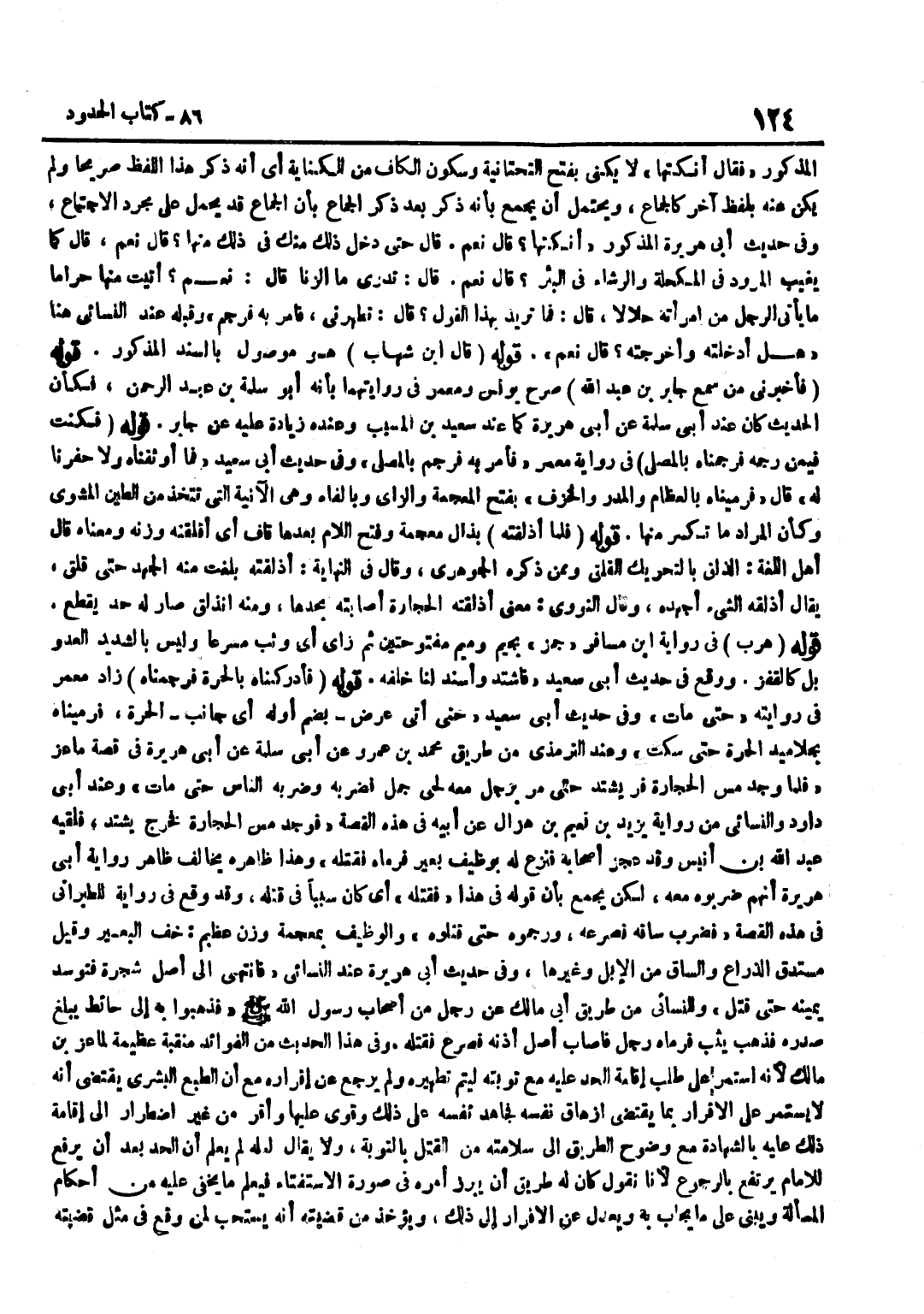 الْمَذْكُورِ فَقَالَ أَنِكْتَهَا لَا يَكْنِي بِفَتْحِ التَّحْتَانِيَّةِ وَسُكُونِ الْكَافِ مِنَ الْكِنَايَةِ أَيْ أَنَّهُ ذَكَرَ هَذَا اللَّفْظَ صَرِيحًا وَلَمْ يَكْنِ عَنْهُ بِلَفْظٍ آخَرَ كَالْجِمَاعِ وَيَحْتَمِلُ أَنْ يُجْمَعَ بِأَنَّهُ ذَكَرَ بَعْدَ ذِكْرِ الْجِمَاعِ بِأَنَّ الْجِمَاعَ قَدْ يُحْمَلُ عَلَى مُجَرَّدِ الِاجْتِمَاعِ وَفِي حَدِيثِ أَبِي هُرَيْرَةَ الْمَذْكُورِ أَنِكْتَهَا قَالَ نَعَمْ قَالَ حَتَّى دَخَلَ ذَلِكَ مِنْكَ فِي ذَلِكَ مِنْهَا قَالَ نَعَمْ قَالَ كَمَا يَغِيبُ الْمِرْوَدُ فِي الْمُكْحُلَةِ وَالرِّشَاءُ فِي الْبِئْرِ قَالَ نَعَمْ قَالَ تَدْرِي مَا الزِّنَا قَالَ نَعَمْ أَتَيْتُ مِنْهَا حَرَامًا مَا يَأْتِي الرَّجُلُ مِنِ امْرَأَتِهِ حَلَالًا قَالَ فَمَا تُرِيدُ بِهَذَا الْقَوْلِ قَالَ تُطَهِّرُنِي فَأَمَرَ بِهِ فَرُجِمَ وَقَبْلَهُ عِنْدَ النَّسَائِيِّ هُنَا هَلْ أَدْخَلْتَهُ وأخرجته قَالَ نعم قَوْله قَالَ بن شِهَابٍ هُوَ مَوْصُولٌ بِالسَّنَدِ الْمَذْكُورِ قَوْلُهُ فَأَخْبَرَنِي مَنْ سَمِعَ جَابِرَ بْنَ عَبْدِ اللَّهِ صَرَّحَ يُونُسُ وَمَعْمَرٌ فِي رِوَايَتِهِمَا بِأَنَّهُ أَبُو سَلَمَةَ بْنُ عَبْدِ الرَّحْمَنِ فَكَأَنَّ الْحَدِيثَ كَانَ عِنْدَ أَبِي سَلَمَةَ عَنْ أَبِي هُرَيْرَةَ كَمَا عِنْدَ سَعِيدِ بْنِ الْمُسَيَّبِ وَعِنْدَهُ زِيَادَةٌ عَلَيْهِ عَنْ جَابِرٍ قَوْلُهُ فَكُنْتُ فِيمَنْ رَجَمَهُ فَرَجَمْنَاهُ بِالْمُصَلَّى فِي رِوَايَةِ مَعْمَرٍ فَأَمَرَ بِهِ فَرُجِمَ بِالْمُصَلَّى وَفِي حَدِيثِ أَبِي سَعِيدٍ فَمَا أَوْثَقْنَاهُ وَلَا حَفَرْنَا لَهُ قَالَ فَرَمَيْنَاهُ بِالْعِظَامِ وَالْمَدَرِ وَالْخَزَفِ بِفَتْحِ الْمُعْجَمَةِ وَالزَّايِ وَبِالْفَاءِ وَهِيَ الْآنِيَةُ الَّتِي تُتَّخَذُ مِنَ الطِّينِ الْمَشْوِيِّ وَكَأَنَّ الْمُرَادَ مَا تَكَسَّرَ مِنْهَا قَوْلُهُ فَلَمَّا أَذْلَقَتْهُ بِذَالٍ مُعْجَمَةٍ وَفَتْحِ اللَّامِ بَعْدَهَا قَافٌ أَيْ أَقْلَقَتْهُ وَزْنُهُ وَمَعْنَاهُ قَالَ أَهْلُ اللُّغَةِ الذَّلَقُ بِالتَّحْرِيكِ الْقَلَقُ وَمِمَّنْ ذَكَرَهُ الْجَوْهَرِيُّ وَقَالَ فِي النِّهَايَةِ أَذْلَقَتْهُ بَلَغَتْ مِنْهُ الْجَهْدَ حَتَّى قَلِقَ يُقَالُ أَذْلَقَهُ الشَّيْءُ أَجْهَدَهُ وَقَالَ النَّوَوِيُّ مَعْنَى أَذْلَقَتْهُ الْحِجَارَةُ أَصَابَتْهُ بِحَدِّهَا وَمِنْهُ انْذَلَقَ صَارَ لَهُ حَدٌّ يقطع قَوْله هرب فِي رِوَايَة بن مُسَافِرٍ جَمَزَ بِجِيمٍ وَمِيمٍ مَفْتُوحَتَيْنِ ثُمَّ زَايٍ أَيْ وَثَبَ مُسْرِعًا وَلَيْسَ بِالشَّدِيدِ الْعَدْوِ بَلْ كَالْقَفْزِ وَوَقَعَ فِي حَدِيثِ أَبِي سَعِيدٍ فَاشْتَدَّ وَأَسْنَدَ لَنَا خَلْفَهُ قَوْلُهُ فَأَدْرَكْنَاهُ بِالْحَرَّةِ فَرَجَمْنَاهُ زَادَ مَعْمَرٌ فِي رِوَايَتِهِ حَتَّى مَاتَ وَفِي حَدِيثِ أَبِي سَعِيدٍ حَتَّى أَتَى عُرْضَ بِضَمِّ أَوَّلِهِ أَيْ جَانِبَ الْحَرَّةِ فَرَمَيْنَاهُ بِجَلَامِيدِ الْحَرَّةِ حَتَّى سَكَتَ وَعِنْدَ التِّرْمِذِيِّ مِنْ طَرِيقِ مُحَمَّدِ بْنِ عَمْرٍو عَنْ أَبِي سَلَمَةَ عَنْ أَبِي هُرَيْرَةَ فِي قِصَّةِ مَاعِزٍ فَلَمَّا وَجَدَ مَسَّ الْحِجَارَةِ فَرَّ يَشْتَدُّ حَتَّى مَرَّ بِرَجُلٍ مَعَهُ لَحْيُ جَمَلٍ فَضَرَبَهُ وَضَرَبَهُ النَّاسُ حَتَّى مَاتَ وَعِنْدَ أَبِي دَاوُدَ وَالنَّسَائِيِّ مِنْ رِوَايَةِ يَزِيدَ بْنِ نُعَيْمِ بْنِ هَزَّالٍ عَنْ أَبِيهِ فِي هَذِهِ الْقِصَّةِ فَوَجَدَ مَسَّ الْحِجَارَةِ فَخَرَجَ يَشْتَدُّ فَلَقِيَهُ عَبْدُ اللَّهِ بْنُ أُنَيْسٍ وَقَدْ عَجَزَ أَصْحَابُهُ فَنَزَعَ لَهُ بِوَظِيفِ بَعِيرٍ فَرَمَاهُ فَقَتَلَهُ وَهَذَا ظَاهِرُهُ يُخَالِفُ ظَاهِرَ رِوَايَةِ أَبِي هُرَيْرَةَ أَنَّهُمْ ضَرَبُوهُ مَعَهُ لَكِنْ يُجْمَعُ بِأَ