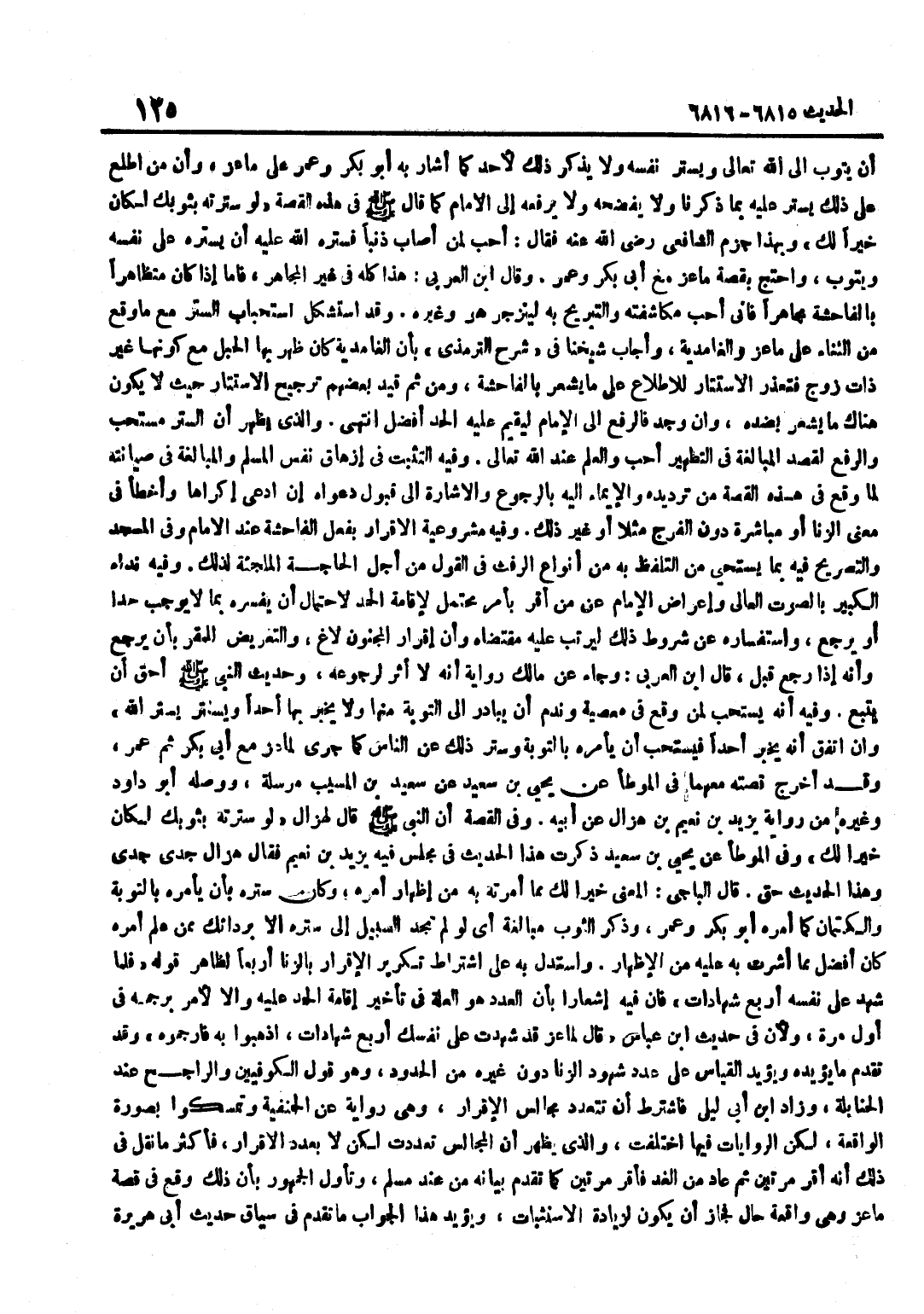أَنْ يَتُوبَ إِلَى اللَّهِ تَعَالَى وَيَسْتُرَ نَفْسَهُ وَلَا يَذْكُرُ ذَلِكَ لِأَحَدٍ كَمَا أَشَارَ بِهِ أَبُو بَكْرٍ وَعُمَرُ عَلَى مَاعِزٍ وَأَنَّ مَنِ اطَّلَعَ عَلَى ذَلِكَ يَسْتُرُ عَلَيْهِ بِمَا ذَكَرْنَا وَلَا يَفْضَحُهُ وَلَا يَرْفَعُهُ إِلَى الْإِمَامِ كَمَا قَالَ صَلَّى اللَّهُ عَلَيْهِ وَسَلَّمَ فِي هَذِهِ الْقِصَّةِ لَوْ سَتَرْتَهُ بِثَوْبِكَ لَكَانَ خَيْرًا لَكَ وَبِهَذَا جَزَمَ الشَّافِعِيُّ رَضِيَ اللَّهُ عَنْهُ فَقَالَ أُحِبُّ لِمَنْ أَصَابَ ذَنْبًا فَسَتَرَهُ اللَّهُ عَلَيْهِ أَنْ يَسْتُرَهُ عَلَى نَفْسِهِ وَيَتُوبَ وَاحْتَجَّ بِقِصَّةِ مَاعِز مَعَ أبي بكر وَعمر وَقَالَ بن الْعَرَبِيِّ هَذَا كُلُّهُ فِي غَيْرِ الْمُجَاهِرِ فَأَمَّا إِذَا كَانَ مُتَظَاهِرًا بِالْفَاحِشَةِ مُجَاهِرًا فَإِنِّي أُحِبُّ مُكَاشَفَتَهُ وَالتَّبْرِيحَ بِهِ لِيَنْزَجِرَ هُوَ وَغَيْرُهُ وَقَدِ اسْتُشْكِلَ اسْتِحْبَابُ السَّتْرِ مَعَ مَا وَقَعَ مِنَ الثَّنَاءِ عَلَى مَاعِزٍ وَالْغَامِدِيَّةِ وَأَجَابَ شَيْخُنَا فِي شَرْحِ التِّرْمِذِيِّ بِأَنَّ الْغَامِدِيَّةَ كَانَ ظَهَرَ بِهَا الْحَبَلُ مَعَ كَوْنِهَا غَيْرَ ذَاتِ زَوْجٍ فَتَعَذَّرَ الِاسْتِتَارُ لِلِاطِّلَاعِ عَلَى مَا يُشْعِرُ بِالْفَاحِشَةِ وَمِنْ ثَمَّ قَيَّدَ بَعْضُهُمْ تَرْجِيحَ الِاسْتِتَارِ حَيْثُ لَا يَكُونُ هُنَاكَ مَا يُشْعِرُ بِضِدِّهِ وَإِنْ وُجِدَ فَالرَّفْعُ إِلَى الْإِمَامِ لِيُقِيمَ عَلَيْهِ الْحَدَّ أَفْضَلُ انْتَهَى وَالَّذِي يَظْهَرُ أَنَّ السَّتْرَ مُسْتَحَبٌّ وَالرَّفْعَ لِقَصْدِ الْمُبَالَغَةِ فِي التَّطْهِيرِ أَحَبُّ وَالْعِلْمُ عِنْدَ اللَّهِ تَعَالَى وَفِيهِ التَّثَبُّتُ فِي إِزْهَاقِ نَفْسِ الْمُسْلِمِ وَالْمُبَالَغَةُ فِي صِيَانَتِهِ لِمَا وَقَعَ فِي هَذِهِ الْقِصَّةِ مِنْ تَرْدِيدِهِ وَالْإِيمَاءِ إِلَيْهِ بِالرُّجُوعِ وَالْإِشَارَةِ إِلَى قَبُولِ دَعْوَاهُ إِنِ ادَّعَى إِكْرَاهًا وَأَخْطَأ فِي مَعْنَى الزِّنَا أَوْ مُبَاشَرَةٍ دُونَ الْفَرْجِ مَثَلًا أَوْ غَيْرِ ذَلِكَ وَفِيهِ مَشْرُوعِيَّةُ الْإِقْرَارِ بِفِعْلِ الْفَاحِشَةِ عِنْدَ الْإِمَامِ وَفِي الْمَسْجِدِ وَالتَّصْرِيحُ فِيهِ بِمَا يستحي مِنَ التَّلَفُّظِ بِهِ مِنْ أَنْوَاعِ الرَّفَثِ فِي الْقَوْلِ مِنْ أَجْلِ الْحَاجَةِ الْمُلْجِئَةِ لِذَلِكَ وَفِيهِ نِدَاءُ الْكَبِيرِ بِالصَّوْتِ الْعَالِي وَإِعْرَاضُ الْإِمَامِ عَنْ مَنْ أَقَرَّ بِأَمْرٍ مُحْتَمَلٍ لِإِقَامَةِ الْحَدِّ لِاحْتِمَالِ أَنْ يُفَسِّرَهُ بِمَا لَا يُوجِبُ حَدًّا أَوْ يَرْجِعُ وَاسْتِفْسَارُهُ عَنْ شُرُوطِ ذَلِكَ لِيُرَتِّبَ عَلَيْهِ مُقْتَضَاهُ وَأَنَّ إِقْرَارَ الْمَجْنُونِ لَاغٍ وَالتَّعْرِيضَ لِلْمُقِرِّ بِأَنْ يَرْجِعَ وَأَنَّهُ إِذَا رَجَعَ قُبِلَ قَالَ بن الْعَرَبِيِّ وَجَاءَ عَنْ مَالِكٍ رِوَايَةُ أَنَّهُ لَا أَثَرَ لِرُجُوعِهِ وَحَدِيثُ النَّبِيِّ صَلَّى اللَّهُ عَلَيْهِ وَسَلَّمَ أَحَقُّ أَنْ يُتَّبَعَ وَفِيهِ أَنَّهُ يُسْتَحَبُّ لِمَنْ وَقَعَ فِي مَعْصِيَةٍ وَنَدِمَ أَنْ يُبَادِرَ إِلَى التَّوْبَةِ مِنْهَا وَلَا يُخْبِرُ بِهَا أَحَدًا وَيَسْتَتِرَ بِسِتْرِ اللَّهِ وَإِنِ اتَّفَقَ أَنَّهُ يُخْبِرُ أَحَدًا فَيُسْتَحَبُّ أَنْ يَأْمُرَهُ بِالتَّوْبَةِ وَسَتْرِ ذَلِكَ عَنِ النَّاسِ كَمَا جَرَى لِمَاعِزٍ مَعَ أَبِي بَكْرٍ ثُمَّ عُمَرَ وَقَدْ أَخْرَجَ قِصَّتَهُ مَعَهُمَا فِي الْمُوَطَّأِ عَنْ يَحْيَى بْنِ سَعِيدٍ عَنْ سَعِيدِ بْنِ الْمُسَيَّبِ مُرْسَلَةً وَوَصَلَهُ أَبُو دَاوُدَ وَغَيْرُهُ مِنْ رِوَايَةِ يَزِيدَ بْنِ نُعَيْمِ بْنِ هَزَّالٍ عَنْ أَبِيهِ وَفِي الْقِصَّةِ أَنَّ النَّبِيَّ صَلَّى اللَّهُ عَلَيْهِ وَسَلَّمَ قَالَ لِهَزَّالٍ 
