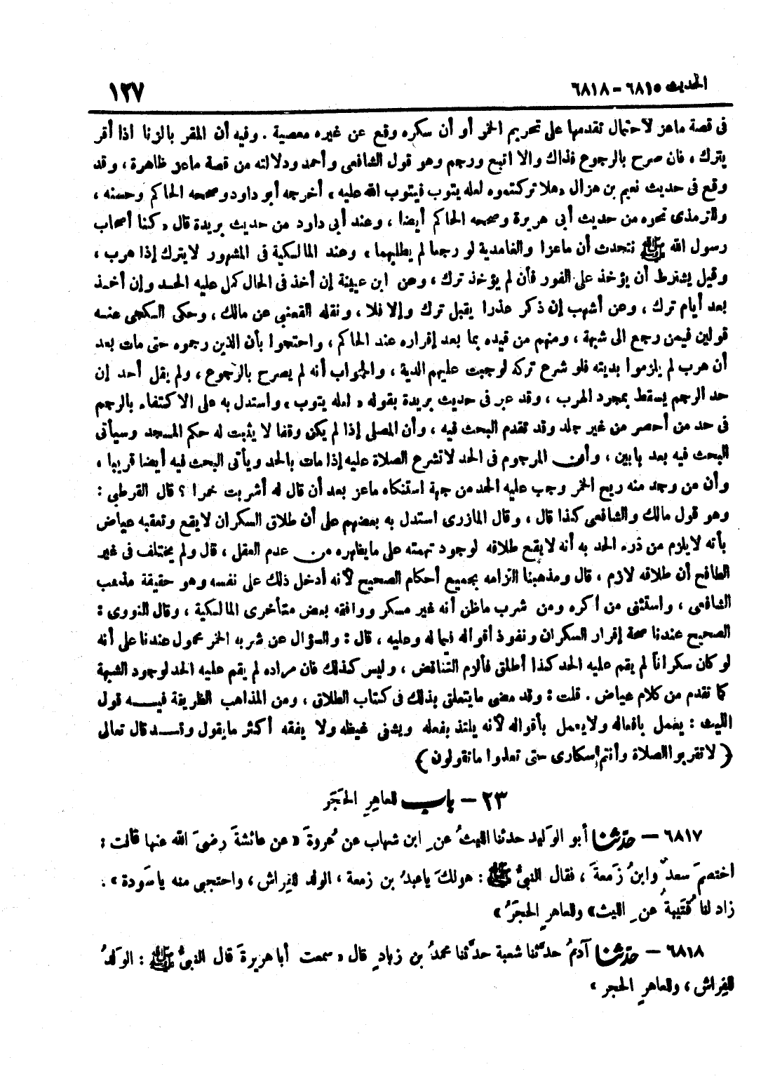 فِي قِصَّةِ مَاعِزٍ لِاحْتِمَالِ تَقَدُّمِهَا عَلَى تَحْرِيمِ الْخَمْرِ أَوْ أَنَّ سُكْرَهُ وَقَعَ عَنْ غَيْرِ مَعْصِيَةٍ وَفِيهِ أَنَّ الْمُقِرَّ بِالزِّنَا إِذَا أَقَرَّ يُتْرَكُ فَإِنْ صَرَّحَ بِالرُّجُوعِ فَذَاكَ وَإِلَّا اتُّبِعَ وَرُجِمَ وَهُوَ قَوْلُ الشَّافِعِيِّ وَأَحْمَدَ وَدَلَالَتُهُ مِنْ قِصَّةِ مَاعِزٍ ظَاهِرَةٌ وَقَدْ وَقَعَ فِي حَدِيثِ نُعَيْمِ بْنِ هَزَّالٍ هَلَّا تَرَكْتُمُوهُ لَعَلَّهُ يَتُوبُ فَيَتُوبَ اللَّهُ عَلَيْهِ أَخْرَجَهُ أَبُو دَاوُدَ وَصَحَّحَهُ الْحَاكِمُ وَحَسَّنَهُ وَلِلتِّرْمِذِيِّ نَحْوُهُ مِنْ حَدِيثِ أَبِي هُرَيْرَةَ وَصَحَّحَهُ الْحَاكِمُ أَيْضًا وَعِنْدَ أَبِي دَاوُدَ مِنْ حَدِيثِ بُرَيْدَةَ قَالَ كُنَّا أَصْحَابِ رَسُولِ اللَّهِ صَلَّى اللَّهُ عَلَيْهِ وَسَلَّمَ نَتَحَدَّثُ أَنَّ مَاعِزًا وَالْغَامِدِيَّةَ لَوْ رَجَعَا لَمْ يَطْلُبْهُمَا وَعِنْدَ الْمَالِكِيَّةِ فِي الْمَشْهُورِ لَا يُتْرَكُ إِذَا هَرَبَ وَقِيلَ يُشْتَرَطُ أَنْ يُؤْخَذَ عَلَى الْفَوْرِ فَإِنْ لم يُؤْخَذ ترك وَعَن بن عُيَيْنَةَ إِنْ أُخِذَ فِي الْحَالِ كُمِّلَ عَلَيْهِ الْحَدُّ وَإِنْ أُخِذَ بَعْدَ أَيَّامٍ تُرِكَ وَعَنْ أَشْهَبَ إِنْ ذَكَرَ عُذْرًا يُقْبَلُ تُرِكَ وَإِلَّا فَلَا وَنَقَلَهُ الْقَعْنَبِيُّ عَنْ مَالِكٍ وَحَكَى الْكَجِّيُّ عَنْهُ قَوْلَيْنِ فِيمَنْ رَجَعَ إِلَى شُبْهَةٍ وَمِنْهُمْ مَنْ قَيَّدَهُ بِمَا بَعْدَ إِقْرَارِهِ عِنْدَ الْحَاكِمِ وَاحْتَجُّوا بِأَنَّ الَّذِينَ رَجَمُوهُ حَتَّى مَاتَ بَعْدَ أَنْ هَرَبَ لَمْ يُلْزَمُوا بِدِيَتِهِ فَلَوْ شُرِعَ تَرْكُهُ لَوَجَبَتْ عَلَيْهِمُ الدِّيَةُ وَالْجَوَابُ أَنَّهُ لَمْ يُصَرِّحْ بِالرُّجُوعِ وَلَمْ يَقُلْ أَحَدٌ إِنَّ حَدَّ الرَّجْمِ يَسْقُطُ بِمُجَرَّدِ الْهَرَبِ وَقَدْ عَبَّرَ فِي حَدِيثِ بُرَيْدَةَ بِقَوْلِهِ لَعَلَّهُ يَتُوبُ وَاسْتُدِلَّ بِهِ عَلَى الِاكْتِفَاءِ بِالرَّجْمِ فِي حَدِّ مَنْ أُحْصِرَ مِنْ غَيْرِ جَلْدٍ وَقَدْ تَقَدَّمَ الْبَحْثُ فِيهِ وَأَنَّ الْمُصَلَّى إِذَا لَمْ يَكُنْ وَقْفًا لَا يَثْبُتُ لَهُ حُكْمُ الْمَسْجِدِ وَسَيَأْتِي الْبَحْثُ فِيهِ بَعْدَ بَابَيْنِ وَأَنَّ الْمَرْجُومَ فِي الْحَدِّ لَا تُشْرَعُ الصَّلَاةُ عَلَيْهِ إِذَا مَاتَ بِالْحَدِّ وَيَأْتِي الْبَحْثُ فِيهِ أَيْضًا قَرِيبًا وَأَنَّ مَنْ وُجِدَ مِنْهُ رِيحُ الْخَمْرِ وَجَبَ عَلَيْهِ الْحَدُّ مِنْ جِهَةِ اسْتِنْكَاهِ مَاعِزٍ بَعْدَ أَنْ قَالَ لَهُ أَشَرِبْتَ خَمْرًا قَالَ الْقُرْطُبِيُّ وَهُوَ قَوْلُ مَالِكٍ وَالشَّافِعِيِّ كَذَا قَالَ وَقَالَ الْمَازِرِيُّ اسْتَدَلَّ بِهِ بَعْضُهُمْ عَلَى أَنَّ طَلَاقَ السَّكْرَانِ لَا يَقَعُ وَتَعَقَّبَهُ عِيَاضٌ بِأَنَّهُ لَا يَلْزَمُ مِنْ دَرْءِ الْحَدِّ بِهِ أَنَّهُ لَا يَقَعُ طَلَاقُهُ لِوُجُودِ تُهْمَتِهِ عَلَى مَا يُظْهِرُهُ مِنْ عَدَمِ الْعَقْلِ قَالَ وَلَمْ يُخْتَلَفْ فِي غَيْرِ الطَّافِحِ أَنَّ طَلَاقَهُ لَازِمٌ قَالَ وَمَذْهَبُنَا الْتِزَامُهُ بِجَمِيعِ أَحْكَامِ الصَّحِيحِ لِأَنَّهُ أَدْخَلَ ذَلِكَ عَلَى نَفْسِهِ وَهُوَ حَقِيقَةُ مَذْهَبِ الشَّافِعِيِّ وَاسْتَثْنَى مَنْ أُكْرِهَ وَمَنْ شَرِبَ مَا ظَنَّ أَنَّهُ غَيْرُ مُسْكِرٍ وَوَافَقَهُ بَعْضُ مُتَأَخِّرِي الْمَالِكِيَّةِ وَقَالَ النَّوَوِيُّ الصَّحِيحُ عِنْدَنَا صِحَّةُ إِقْرَارِ السَّكْرَان وَنُفُوذُ أَقْوَالِهِ فِيمَا لَهُ وَعَلَيْهِ قَالَ وَالسُّؤَالُ عَنْ شُرْبِهِ الْخَمْرَ مَحْمُولٌ عندنَا على أَنه لَو كَانَ سكرانا لَمْ يُقَمْ عَلَيْهِ الْحَدُّ كَذَا أَطْلَقَ فَأَلْزَمَ التَّنَاقُضَ وَلَيْسَ كَذَلِكَ فَإِنَّ مُرَادَهُ لَمْ يُقَمْ عَلَيْهِ الْحَدُّ لِوُجُودِ الشُّبْهَةِ كَمَا تَقَد