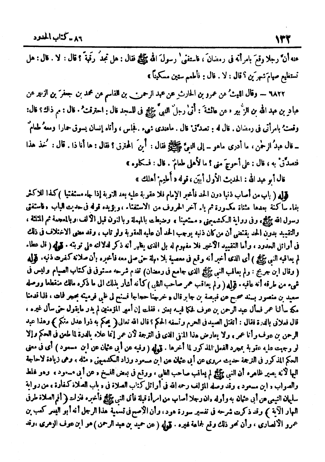 إِذَا جَاءَ مُسْتَفْتِيًا كَذَا لِلْأَكْثَرِ بِفَاءٍ سَاكِنَةٍ بَعْدَهَا مُثَنَّاةٌ مَكْسُورَةٌ ثُمَّ يَاءٌ آخِرُ الْحُرُوفِ مِنَ الِاسْتِفْتَاءِ وَيُؤَيِّدُهُ قَوْلُهُ فِي حَدِيثِ الْبَابِ فَاسْتَفْتَى رَسُولُ اللَّهِ صَلَّى اللَّهُ عَلَيْهِ وَسَلَّمَ وَفِي رِوَايَة الْكشميهني مستعينا وضبطت بِمُهْملَة وَبِالنُّونِ قَبْلَ الْأَلِفِ وَبِالْمُعْجَمَةِ ثُمَّ الْمُثَلَّثَةِ وَالتَّقْيِيدُ بِدُونِ الْحَدِّ يَقْتَضِي أَنَّ مَنْ كَانَ ذَنْبُهُ يُوجِبُ الْحَدَّ أَنَّ عَلَيْهِ الْعُقُوبَةَ وَلَوْ تَابَ وَقَدْ مَضَى الِاخْتِلَافُ فِي ذَلِكَ فِي أَوَائِلِ الْحُدُودِ وَأَمَّا التَّقْيِيدُ الْأَخِيرُ فَلَا مَفْهُومَ لَهُ بَلِ الَّذِي يَظْهَرُ أَنَّهُ ذُكِرَ لِدَلَالَتِهِ عَلَى تَوْبَتِهِ قَوْلُهُ قَالَ عَطَاءٌ لَمْ يُعَاقِبْهُ النَّبِيِّ صَلَّى اللَّهُ عَلَيْهِ وَسَلَّمَ أَيِ الَّذِي أَخْبَرَ أَنَّهُ وَقَعَ فِي مَعْصِيَةٍ بِلَا مُهْلَةٍ حَتَّى صَلَّى مَعَهُ فَأَخْبَرَهُ بِأَنَّ صَلَاتَهُ كَفَّرَتْ ذَنْبَهُ قَوْله وَقَالَ بن جُرَيْجٍ وَلَمْ يُعَاقِبِ النَّبِيُّ صَلَّى اللَّهُ عَلَيْهِ وَسَلَّمَ الَّذِي جَامَعَ فِي رَمَضَانَ تَقَدَّمَ شَرْحُهُ مُسْتَوْفًى فِي كِتَابِ الصِّيَامِ وَلَيْسَ فِي شَيْءٍ مِنْ طُرُقِهِ أَنَّهُ عَاقَبَهُ قَوْلُهُ وَلَمْ يُعَاقِبْ عُمَرُ صَاحِبَ الظَّبْيِ كَأَنَّهُ أَشَارَ بِذَلِكَ إِلَى مَا ذَكَرَهُ مَالِكٌ مُنْقَطِعًا وَوَصَلَهُ سَعِيدُ بْنُ مَنْصُورٍ بِسَنَدٍ صَحِيحٍ عَنْ قَبِيصَةَ بْنِ جَابِرٍ قَالَ خَرَجْنَا حُجَّاجًا فَسَنَحَ لِي ظَبْيٌ فَرَمَيْتُهُ بِحَجَرٍ فَمَاتَ فَلَمَّا قَدِمْنَا مَكَّةَ سَأَلْنَا عُمَرَ فَسَأَلَ عَبْدَ الرَّحْمَنِ بْنَ عَوْفٍ فَحَكَمَا فِيهِ بِعَنْزٍ فَقُلْتُ إِنَّ أَمِيرَ الْمُؤْمِنِينَ لَمْ يَدْرِ مَا يَقُولُ حَتَّى سَأَلَ غَيْرَهُ قَالَ فَعَلَانِي بِالدِّرَّةِ فَقَالَ أَتَقْتُلُ الصَّيْدَ فِي الْحَرَمِ وَتُسَفِّهُ الْحَكَمَ قَالَ اللَّهُ تَعَالَى يَحْكُمُ بِهِ ذَوَا عدل مِنْكُم وَهَذَا عَبْدُ الرَّحْمَنِ بْنُ عَوْفٍ وَأَنَا عُمَرُ وَلَا يُعَارِضُ هَذَا الْمَنْفِيَّ الَّذِي فِي التَّرْجَمَةِ لِأَنَّ عُمَرَ إِنَّمَا عَلَاهُ بِالدِّرَّةِ لَمَّا طَعَنَ فِي الْحَكَمِ وَإِلَّا لَوْ وَجَبَتْ عَلَيْهِ عُقُوبَةٌ بِمُجَرَّدِ الْفِعْلِ الْمَذْكُورِ لَمَا أَخَّرَهَا قَوْلُهُ وَفِيهِ عَن أبي عُثْمَان عَن بن مَسْعُودٍ أَيْ فِي مَعْنَى الْحُكْمِ الْمَذْكُورِ فِي التَّرْجَمَةِ حَدِيثٌ مَرْوِيٌّ عَنْ أَبِي عُثْمَانَ عَنِ بن مَسْعُودٍ وَزَادَ الْكُشْمِيهَنِيُّ مِثْلَهُ وَهِيَ زِيَادَةٌ لَا حَاجَةَ إِلَيْهَا لِأَنَّهُ يَصِيرُ ظَاهِرُهُ أَنَّ النَّبِيَّ صَلَّى اللَّهُ عَلَيْهِ وَسَلَّمَ لَمْ يُعَاقِبْ صَاحِبَ الظَّبْيِ وَوَقَعَ فِي بَعْضِ النُّسَخِ عَنْ أَبِي مَسْعُود وَهُوَ غلط وَالصَّوَاب بن مَسْعُودٍ وَقَدْ وَصَلَهُ الْمُؤَلِّفُ رَحِمَهُ اللَّهُ فِي أَوَائِلِ كِتَابِ الصَّلَاةِ فِي بَابٌ الصَّلَاةُ كَفَّارَةٌ مِنْ رِوَايَةِ سُلَيْمَانَ التَّيْمِيِّ عَنْ أَبِي عُثْمَانَ بِهِ وَأَوَّلُهُ إِنَّ رَجُلًا أَصَابَ مِنِ امْرَأَةٍ قُبْلَةً فَأَتَى النَّبِيَّ صَلَّى اللَّهُ عَلَيْهِ وَسَلَّمَ فَأَخْبَرَهُ فَنزلت أقِم الصَّلَاة طرفِي النَّهَار الْآيَةَ وَقَدْ ذَكَرْتُ شَرْحَهُ فِي تَفْسِيرِ سُورَةِ هُودٍ وَأَنَّ الْأَصَحَّ فِي تَسْمِيَةِ هَذَا الرَّجُلِ أَنَّهُ أَبُو الْيَسَرِ كَعْبُ بْنُ عَمْرٍو الْأَنْصَارِيُّ وَأَنَّ نَحْوَ ذَلِكَ وَقَعَ لِجَمَاعَةٍ غَيْرِهِ
