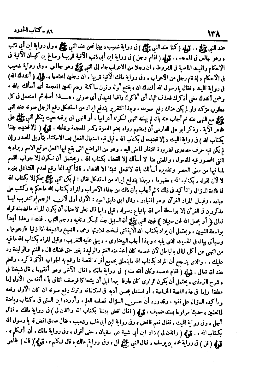 عِنْدَ النَّبِيِّ صَلَّى اللَّهُ عَلَيْهِ وَسَلَّمَ قَوْلُهُ كُنَّا عِنْدَ النَّبِيِّ صَلَّى اللَّهُ عَلَيْهِ وَسَلَّمَ فِي رِوَايَةِ شُعَيْبٍ بَيْنَمَا نَحْنُ عِنْدَ النَّبِيِّ صَلَّى اللَّهُ عَلَيْهِ وَسَلَّمَ وَفِي رِوَايَةِ بن أَبِي ذِئْبٍ وَهُوَ جَالِسٌ فِي الْمَسْجِدِ قَوْلُهُ فَقَامَ رجل فِي رِوَايَة بن أَبِي ذِئْبٍ الْآتِيَةِ قَرِيبًا وَصَالِحِ بْنِ كَيْسَانَ الْآتِيَةِ فِي الْأَحْكَامِ وَاللَّيْثِ الْمَاضِيَةِ فِي الشُّرُوطِ أَنَّ رَجُلًا مِنَ الْأَعْرَابِ جَاءَ إِلَى النَّبِيِّ صَلَّى اللَّهُ عَلَيْهِ وَسَلَّمَ وَهُوَ جَالِسٌ وَفِي رِوَايَةِ شُعَيْبٍ فِي الْأَحْكَامِ إِذْ قَامَ رَجُلٌ مِنَ الْأَعْرَابِ وَفِي رِوَايَةِ مَالِكٍ الْآتِيَةِ قَرِيبًا أَنَّ رَجُلَيْنِ اخْتَصَمَا قَوْلُهُ أَنْشُدُكَ اللَّهَ فِي رِوَايَةِ اللَّيْثِ فَقَالَ يَا رَسُولَ اللَّهِ أَنْشُدُكَ اللَّهَ بِفَتْحِ أَوَّلِهِ وَنُونٍ سَاكِنَةٍ وَضَمِّ الشِّينِ الْمُعْجَمَةِ أَيْ أَسْأَلُكَ بِاللَّهِ وَضَمَّنَ أَنْشُدُكَ مَعْنَى أذكرك فَحذف الْبَاء أَي أذكرك رَافعا نشيدتي أَيْ صَوْتِي هَذَا أَصْلُهُ ثُمَّ اسْتُعْمِلَ فِي كُلِّ مَطْلُوبٍ مُؤَكَّدٍ وَلَوْ لَمْ يَكُنْ هُنَاكَ رَفْعُ صَوْتٍ وَبِهَذَا التَّقْرِيرِ يَنْدَفِعُ إِيرَادُ مَنِ اسْتَشْكَلَ رَفْعَ الرَّجُلِ صَوْتَهُ عِنْدَ النَّبِيِّ صَلَّى اللَّهُ عَلَيْهِ وَسَلَّمَ مَعَ النَّهْيِ عَنْهُ ثُمَّ أَجَابَ عَنْهُ بِأَنَّهُ لَمْ يَبْلُغْهُ النَّهْيُ لِكَوْنِهِ أَعْرَابِيًّا أَوِ النَّهْيُ لِمَنْ يَرْفَعُهُ حَيْثُ يَتَكَلَّمُ النَّبِيِّ صَلَّى اللَّهُ عَلَيْهِ وَسَلَّمَ عَلَى ظَاهِرِ الْآيَةِ وَذَكَرَ أَبُو عَلِيٍّ الْفَارِسِيُّ أَنَّ بَعْضَهُمْ رَوَاهُ بِضَمِّ الْهَمْزَةِ وَكَسْرِ الْمُعْجَمَةِ وَغَلَّطَهُ قَوْلُهُ إِلَّا قَضَيْتَ بَيْنَنَا بِكِتَابِ اللَّهِ فِي رِوَايَةِ اللَّيْثِ إِلَّا قَضَيْتَ لِي بِكِتَابِ اللَّهِ قِيلَ فِيهِ اسْتِعْمَالُ الْفِعْلِ بَعْدَ الِاسْتِثْنَاءِ بِتَأْوِيلِ الْمَصْدَرِ وَإِنْ لَمْ يَكُنْ فِيهِ حَرْفٌ مَصْدَرِيٌّ لِضَرُورَةِ افْتِقَارِ الْمَعْنَى إِلَيْهِ وَهُوَ مِنَ الْمَوَاضِعِ الَّتِي يَقَعُ فِيهَا الْفِعْلُ مَوْقِعَ الِاسْمِ وَيُرَادُ بِهِ النَّفْيُ الْمَحْصُورُ فِيهِ الْمَفْعُولُ وَالْمَعْنَى هُنَا لَا أَسْأَلُكَ إِلَّا الْقَضَاءَ بِكِتَابِ اللَّهِ وَيَحْتَمِلُ أَنْ تَكُونَ إِلَّا جَوَابَ الْقَسَمِ لِمَا فِيهَا مِنْ مَعْنَى الْحَصْرِ وَتَقْدِيرُهُ أَسْأَلُكَ بِاللَّهِ لَا تَفْعَلْ شَيْئًا إِلَّا الْقَضَاءَ فَالتَّأْكِيدُ إِنَّمَا وَقَعَ لِعَدَمِ التَّشَاغُلِ بِغَيْرِهِ لَا لِأَنَّ لِقَوْلِهِ بِكِتَابِ اللَّهِ مَفْهُومًا وَبِهَذَا يَنْدَفِعُ إِيرَادُ مَنِ اسْتَشْكَلَ فَقَالَ لَمْ يَكُنِ النَّبِيُّ صَلَّى اللَّهُ عَلَيْهِ وَسَلَّمَ يَحْكُمُ إِلَّا بِكِتَابِ اللَّهِ فَمَا فَائِدَةُ السُّؤَالِ وَالتَّأْكِيدِ فِي ذَلِكَ ثُمَّ أَجَابَ بِأَنَّ ذَلِكَ مِنْ جُفَاةِ الْأَعْرَابِ وَالْمُرَادُ بِكِتَابِ اللَّهِ مَا حَكَمَ بِهِ وَكَتَبَ عَلَى عِبَادِهِ وَقِيلَ الْمُرَادُ الْقُرْآن وَهُوَ الْمُتَبَادر وَقَالَ بن دَقِيقِ الْعِيدِ الْأَوَّلُ أَوْلَى لِأَنَّ الرَّجْمَ وَالتَّغْرِيبَ لَيْسَا مَذْكُورَيْنِ فِي الْقُرْآنِ إِلَّا بِوَاسِطَةِ أَمْرِ اللَّهِ بِاتِّبَاعِ رَسُولِهِ قِيلَ وَفِيمَا قَالَ نَظَرٌ لِاحْتِمَالِ أَنْ يَكُونَ الْمُرَادُ مَا تَضَمَّنَهُ قَوْلُهُ تَعَالَى أَو يَجْعَل الله لَهُنَّ سَبِيلا فَبَيَّنَ النَّبِيُّ صَلَّى اللَّهُ عَلَيْهِ وَسَلَّمَ أَنَّ السَّبِيلَ جَلْدُ الْبِكْرِ وَنَفْيُهُ وَرَجْمُ الثَّيِّبِ قُلْتُ وَهَذَا أَيْضًا بِوَاسِطَةِ التَّبْيِينِ وَيَحْتَمِلُ أَنْ يُر