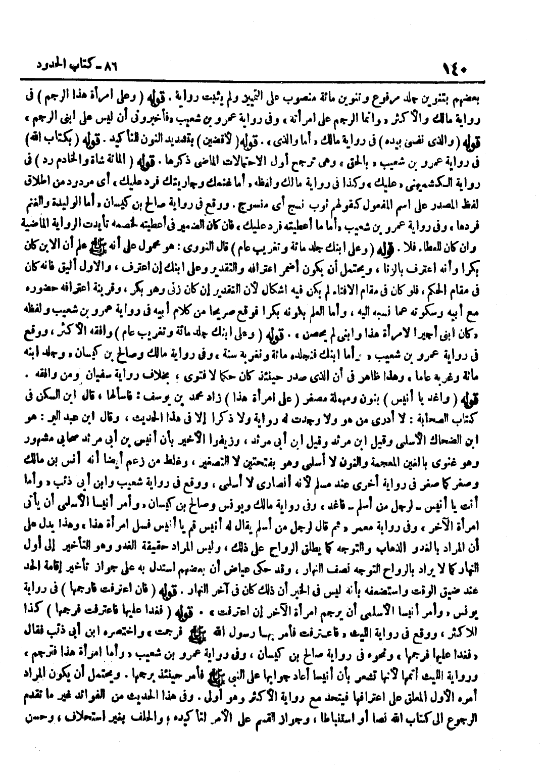 بَعْضُهُمْ بِتَنْوِينِ جَلْدٍ مَرْفُوعٍ وَتَنْوِينِ مِائَةٍ مَنْصُوبٍ عَلَى التَّمْيِيزِ وَلَمْ يَثْبُتْ رِوَايَةً قَوْلُهُ وَعَلَى امْرَأَةِ هَذَا الرَّجْمُ فِي رِوَايَةِ مَالِكٍ وَالْأَكْثَرُ وَإِنَّمَا الرَّجْمُ عَلَى امْرَأَتِهِ وَفِي رِوَايَةِ عَمْرِو بْنِ شُعَيْبٍ فَأَخْبَرُونِي أَنْ لَيْسَ عَلَى ابْنِي الرَّجْمُ قَوْلُهُ وَالَّذِي نَفْسِي بِيَدِهِ فِي رِوَايَةِ مَالِكٍ أَمَا وَالَّذِي قَوْلُهُ لَأَقْضِيَنَّ بِتَشْدِيدِ النُّونِ لِلتَّأْكِيدِ قَوْلُهُ بِكِتَابِ اللَّهِ فِي رِوَايَةِ عَمْرِو بْنِ شُعَيْبٍ بِالْحَقِّ وَهِيَ تُرَجِّحُ أَوَّلَ الِاحْتِمَالَاتِ الْمَاضِيَ ذِكْرُهَا قَوْلُهُ الْمِائَةُ شَاةٍ وَالْخَادِمُ رَدٌّ فِي رِوَايَةِ الْكُشْمِيهَنِيِّ عَلَيْكَ وَكَذَا فِي رِوَايَةِ مَالِكٍ وَلَفْظُهُ أَمَّا غَنَمُكَ وَجَارِيَتُكَ فَرَدٌّ عَلَيْكَ أَيْ مَرْدُودٌ مِنْ إِطْلَاقِ لَفْظِ الْمَصْدَرِ عَلَى اسْمِ الْمَفْعُولِ كَقَوْلِهِمْ ثَوْبٌ نَسْجٌ أَيْ مَنْسُوجٌ وَوَقَعَ فِي رِوَايَةِ صَالِحِ بْنِ كَيْسَانَ أَمَّا الْوَلِيدَةُ وَالْغَنَمُ فَرُدَّهَا وَفِي رِوَايَةِ عَمْرِو بْنِ شُعَيْبٍ أَمَّا مَا أَعْطَيْتَهُ فَرَدٌّ عَلَيْكَ فَإِنْ كَانَ الضَّمِيرُ فِي أَعْطَيْتَهُ لِخَصْمِهِ تَأَيَّدَتِ الرِّوَايَةُ الْمَاضِيَةُ وَإِنْ كَانَ لِلْعَطَاءِ فَلَا قَوْلُهُ وَعَلَى ابْنِكَ جَلْدُ مِائَةٍ وَتَغْرِيبُ عَامٍ قَالَ النَّوَوِيُّ هُوَ مَحْمُولٌ عَلَى أَنَّهُ صَلَّى اللَّهُ عَلَيْهِ وَسَلَّمَ عَلِمَ أَنَّ الِابْنَ كَانَ بِكْرًا وَأَنَّهُ اعْتَرَفَ بِالزِّنَا وَيَحْتَمِلُ أَنْ يَكُونَ أَضْمَرَ اعْتِرَافَهُ وَالتَّقْدِيرُ وَعَلَى ابْنِكَ إِنِ اعْتَرَفَ وَالْأَوَّلُ أَلْيَقُ فَإِنَّهُ كَانَ فِي مَقَامِ الْحُكْمِ فَلَوْ كَانَ فِي مَقَامِ الْإِفْتَاءِ لَمْ يَكُنْ فِيهِ إِشْكَالٌ لِأَنَّ التَّقْدِيرَ إِنْ كَانَ زَنَى وَهُوَ بِكْرٌ وَقَرِينَةُ اعْتِرَافِهِ حُضُورُهُ مَعَ أَبِيهِ وَسُكُوتُهُ عَمَّا نَسَبَهُ إِلَيْهِ وَأَمَّا الْعِلْمُ بِكَوْنِهِ بِكْرًا فَوَقَعَ صَرِيحًا مِنْ كَلَامِ أَبِيهِ فِي رِوَايَةِ عَمْرِو بْنِ شُعَيْبٍ وَلَفْظُهُ كَانَ ابْنِي أَجِيرًا لِامْرَأَةِ هَذَا وَابْنِي لَمْ يُحْصَنْ قَوْلُهُ وَعَلَى ابْنِكَ جَلْدُ مِائَةٍ وَتَغْرِيبُ عَامٍ وَافَقَهُ الْأَكْثَرُ وَوَقَعَ فِي رِوَايَةِ عَمْرِو بْنِ شُعَيْبٍ وَأَمَّا ابْنُكَ فَنَجْلِدُهُ مِائَةً وَنُغَرِّبُهُ سَنَةً وَفِي رِوَايَةِ مَالِكٍ وَصَالِحِ بْنِ كَيْسَانَ وَجَلَدَ ابْنَهُ مِائَةً وَغَرَّبَهُ عَامًا وَهَذَا ظَاهِرٌ فِي أَنَّ الَّذِي صَدَرَ حِينَئِذٍ كَانَ حُكْمًا لَا فَتْوَى بِخِلَافِ رِوَايَةِ سُفْيَانَ وَمَنْ وَافَقَهُ قَوْلُهُ وَاغْدُ يَا أُنَيْسُ بِنُونٍ وَمُهْمَلَةٍ مُصَغَّرٌ عَلَى امْرَأَةِ هَذَا زَادَ مُحَمَّد بن يُوسُف فاسألها قَالَ بن السَّكَنِ فِي كِتَابِ الصَّحَابَةِ لَا أَدْرِي مَنْ هُوَ وَلَا وَجَدْتُ لَهُ رِوَايَةً وَلَا ذِكْرًا إِلَّا فِي هَذَا الحَدِيث وَقَالَ بن عبد الْبر هُوَ بن الضَّحَّاك الْأَسْلَمِيّ وَقيل بن مرْثَد وَقيل بن أَبِي مَرْثَدٍ وَزَيَّفُوا الْأَخِيرَ بِأَنَّ أُنَيْسَ بْنَ أَبِي مَرْثَدٍ صَحَابِيٌّ مَشْهُورٌ وَهُوَ غَنَوِيٌّ بِالْغَيْنِ الْمُعْجَمَةِ وَالنُّونِ لَا أَسْلَمِيٌّ وَهُوَ بِفَتْحَتَيْنِ لَا التَّصْغِيرِ وَغَلِطَ مَنْ زَعَمَ أَيْضًا أَنَّهُ أَنَسُ بْنُ مَالِكٍ وَصُغِّرَ كَمَا صُغِّرَ فِي رِوَايَةٍ أُخْرَى عِنْدَ مُسْلِمٍ لِأَنَّهُ أَنْصَارِيٌّ لَا أَسْلَمِيٌّ وَوَقع فِي رِوَايَة شُعَيْب وبن أَبِي ذِئْبٍ وَأَمَّا أَنْتَ يَا أُنَيْسُ لِرَجُلٍ مِنْ أَسْلَمَ فَاغْدُ وَفِي رِوَايَةِ مَالِكٍ وَيُونُسَ وَصَالِحِ بْنِ كَيْسَانَ وَأَمَرَ أُن