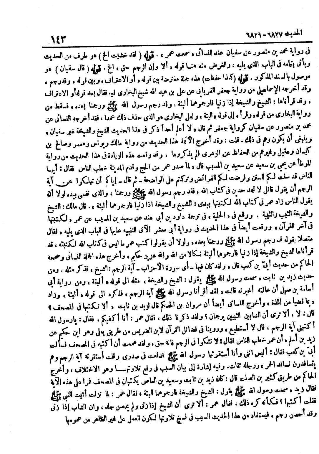 فِي رِوَايَةِ مُحَمَّدِ بْنِ مَنْصُورٍ عَنْ سُفْيَانَ عِنْدَ النَّسَائِيِّ سَمِعْتُ عُمَرَ قَوْلُهُ لَقَدْ خَشِيتُ إِلَخْ هُوَ طَرَفٌ مِنَ الْحَدِيثِ وَيَأْتِي بِتَمَامِهِ فِي الْبَابِ الَّذِي يَلِيهِ وَالْغَرَضُ مِنْهُ هُنَا قَوْلُهُ أَلَا وَإِنَّ الرَّجْمَ حَقٌّ إِلَخْ قَوْلُهُ قَالَ سُفْيَانُ هُوَ مَوْصُولٌ بِالسَّنَدِ الْمَذْكُورِ قَوْلُهُ كَذَا حَفِظْتُ هَذِهِ جُمْلَةٌ مُعْتَرِضَةٌ بَيْنَ قَوْلِهِ أَوْ الِاعْتِرَافُ وَبَيْنَ قَوْلِهِ وَقَدْ رَجَمَ وَقَدْ أَخْرَجَهُ الْإِسْمَاعِيلِيُّ مِنْ رِوَايَةِ جَعْفَرٍ الْفِرْيَابِيِّ عَنْ عَلِيِّ بْنِ عَبْدِ اللَّهِ شَيْخُ الْبُخَارِيِّ فِيهِ فَقَالَ بَعْدَ قَوْلِهِ أَوْ الِاعْتِرَافُ وَقَدْ قَرَأْنَاهَا الشَّيْخُ وَالشَّيْخَةُ إِذَا زَنَيَا فَارْجُمُوهُمَا الْبَتَّةَ وَقَدْ رَجَمَ رَسُولُ اللَّهِ صَلَّى اللَّهُ عَلَيْهِ وَسَلَّمَ وَرَجَمْنَا بَعْدَهُ فَسَقَطَ مِنْ رِوَايَةِ الْبُخَارِيِّ مِنْ قَوْلِهِ وَقَرَأَ إِلَى قَوْلِهِ الْبَتَّةَ وَلَعَلَّ الْبُخَارِيَّ هُوَ الَّذِي حَذَفَ ذَلِكَ عَمْدًا فَقَدْ أَخْرَجَهُ النَّسَائِيُّ عَنْ مُحَمَّدِ بْنِ مَنْصُورٍ عَنْ سُفْيَانَ كَرِوَايَةِ جَعْفَرٍ ثُمَّ قَالَ لَا أَعْلَمُ أَحَدًا ذَكَرَ فِي هَذَا الْحَدِيثِ الشَّيْخَ وَالشَّيْخَةَ غَيْرَ سُفْيَانَ وَيَنْبَغِي أَنْ يَكُونَ وَهِمَ فِي ذَلِكَ قُلْتُ وَقَدْ أَخْرَجَ الْأَئِمَّةُ هَذَا الْحَدِيثَ مِنْ رِوَايَةِ مَالِكٍ وَيُونُسَ وَمَعْمَرٍ وَصَالِحِ بْنِ كَيْسَانَ وَعُقَيْلٍ وَغَيْرِهِمْ مِنَ الْحُفَّاظِ عَنِ الزُّهْرِيِّ فَلَمْ يَذْكُرُوهَا وَقَدْ وَقَعَتْ هَذِهِ الزِّيَادَةُ فِي هَذَا الْحَدِيثِ مِنْ رِوَايَةِ الْمُوَطَّإِ عَنْ يَحْيَى بْنِ سَعِيدٍ عَنْ سَعِيدِ بْنِ الْمُسَيَّبِ قَال لَمَّا صَدَرَ عُمَرُ مِنَ الْحَجِّ وَقَدِمَ الْمَدِينَةَ خَطَبَ النَّاسَ فَقَالَ أَيُّهَا النَّاسُ قَدْ سُنَّتْ لَكُمُ السُّنَنُ وَفُرِضَتْ لَكُمُ الْفَرَائِضُ وَتُرِكْتُمْ عَلَى الْوَاضِحَةِ ثُمَّ قَالَ إِيَّاكُمْ أَنْ تَهْلِكُوا عَنْ آيَةِ الرَّجْمِ أَنْ يَقُولَ قَائِلٌ لَا نَجِدُ حَدَّيْنِ فِي كِتَابِ اللَّهِ فَقَدْ رَجَمَ رَسُولُ اللَّهِ صَلَّى اللَّهُ عَلَيْهِ وَسَلَّمَ وَرَجَمْنَا وَالَّذِي نَفْسِي بِيَدِهِ لَوْلَا أَنْ يَقُولَ النَّاسُ زَادَ عُمَرُ فِي كِتَابِ اللَّهِ لَكَتَبْتُهَا بِيَدِي الشَّيْخُ وَالشَّيْخَةُ إِذَا زَنَيَا فَارْجُمُوهُمَا الْبَتَّةَ قَالَ مَالِكٌ الشَّيْخُ وَالشَّيْخَةُ الثَّيِّبُ وَالثَّيِّبَةُ وَوَقَعَ فِي الْحِلْيَةِ فِي تَرْجَمَةِ دَاوُدَ بْنِ أَبِي هِنْدٍ عَنْ سَعِيدِ بْنِ الْمُسَيَّبِ عَنْ عُمَرَ لَكَتَبْتُهَا فِي آخِرِ الْقُرْآنِ وَوَقَعَتْ أَيْضًا فِي هَذَا الْحَدِيثِ فِي رِوَايَةِ أَبِي مَعْشَرٍ الْآتِي التَّنْبِيهُ عَلَيْهَا فِي الْبَابِ الَّذِي يَلِيهِ فَقَالَ مُتَّصِلًا بِقَوْلِهِ قَدْ رَجَمَ رَسُولُ اللَّهِ صَلَّى اللَّهُ عَلَيْهِ وَسَلَّمَ وَرَجَمْنَا بَعْدَهُ وَلَوْلَا أَنْ يَقُولُوا كَتَبَ عُمَرُ مَا لَيْسَ فِي كِتَابِ اللَّهِ لَكَتَبْتُهُ قَدْ قَرَأْنَاهَا الشَّيْخُ وَالشَّيْخَةُ إِذَا زَنَيَا فَارْجُمُوهُمَا الْبَتَّةَ نَكَالًا مِنَ اللَّهِ وَاللَّهُ عَزِيزٌ حَكِيمٌ وَأَخْرَجَ هَذِهِ الْجُمْلَةَ النَّسَائِيُّ وَصَحَّحَهُ الْحَاكِمُ مِنْ حَدِيثِ أُبَيِّ بْنِ كَعْبٍ قَالَ وَلَقَدْ كَانَ فِيهَا أَيْ سُورَةِ الْأَحْزَابِ آيَةُ الرَّجْمِ الشَّيْخُ فَذَكَرَ مِثْلَهُ وَمِنْ حَدِيثِ زَيْدِ بْنِ ثَابِتٍ سَمِعْتُ رَسُولَ اللَّهِ صَلَّى اللَّهُ عَلَيْهِ وَسَلَّمَ يَقُولُ الشَّيْخُ وَالشَّيْخَةُ مِثْلَهُ إِلَى قَوْلِهِ الْبَتَّةَ وَمِنْ رِوَايَةِ أَبِي أُسَامَةَ بْنِ سَهْلٍ أَنَّ خَا