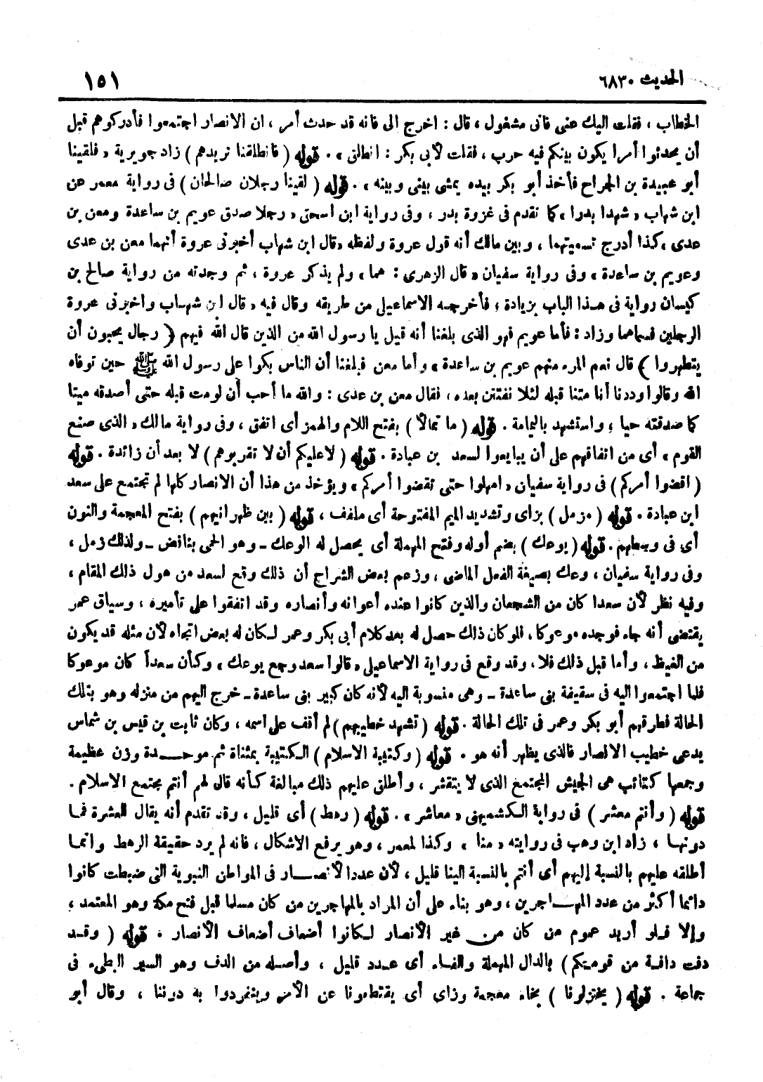 الْخَطَّابِ فَقُلْتُ إِلَيْكَ عَنِّي فَإِنِّي مَشْغُولٌ قَالَ اخْرُجْ إِلَيَّ فَإِنَّهُ قَدْ حَدَثَ أَمْرٌ إِنَّ الْأَنْصَارَ اجْتَمَعُوا فَأَدْرِكُوهُمْ قَبْلَ أَنْ يُحْدِثُوا أَمْرًا يَكُونُ بَيْنَكُمْ فِيهِ حَرْبٌ فَقُلْتُ لِأَبِي بَكْرٍ انْطَلِقْ قَوْلُهُ فَانْطَلَقْنَا نُرِيدُهُمْ زَادَ جُوَيْرِيَةُ فَلَقِيَنَا أَبُو عُبَيْدَةَ بْنُ الْجَرَّاحِ فَأَخَذَ أَبُو بَكْرٍ بِيَدِهِ يَمْشِي بَيْنِي وَبَيْنَهُ قَوْلُهُ لَقِيَنَا رَجُلَانِ صالحان فِي رِوَايَة معمر عَن بن شِهَابٍ شَهِدَا بَدْرًا كَمَا تَقَدَّمَ فِي غَزْوَةِ بدر وَفِي رِوَايَة بن إِسْحَاقَ رَجُلَا صِدْقٍ عُوَيْمَ بْنَ سَاعِدَةَ وَمَعْنَ بْنَ عَدِيٍّ كَذَا أَدْرَجَ تَسْمِيَتَهُمَا وَبَيَّنَ مَالِكٌ أَنه قَول عُرْوَة وَلَفظه قَالَ بن شِهَابٍ أَخْبَرَنِي عُرْوَةُ أَنَّهُمَا مَعْنُ بْنُ عَدِيٍّ وَعُوَيْمُ بْنُ سَاعِدَةَ وَفِي رِوَايَةِ سُفْيَانَ قَالَ الزُّهْرِيُّ هُمَا وَلَمْ يَذْكُرْ عُرْوَةَ ثُمَّ وَجَدْتُهُ مِنْ رِوَايَةِ صَالِحِ بْنِ كَيْسَانَ رِوَايَةً فِي هَذَا الْبَابِ بِزِيَادَةٍ فَأَخْرَجَهُ الْإِسْمَاعِيلِيُّ مِنْ طَرِيقِهِ وَقَالَ فِيهِ قَالَ بن شِهَابٍ وَأَخْبَرَنِي عُرْوَةُ الرَّجُلَيْنِ فَسَمَّاهُمَا وَزَادَ فَأَمَّا عُوَيْمٌ فَهُوَ الَّذِي بَلَغَنَا أَنَّهُ قِيلَ يَا رَسُولَ اللَّهِ مَنِ الَّذِينَ قَالَ اللَّهُ فِيهِمْ رجال يحبونَ أَن يَتَطَهَّرُوا قَالَ نِعْمَ الْمَرْءُ مِنْهُمْ عُوَيْمُ بْنُ سَاعِدَةَ وَأَمَّا مَعْنٌ فَبَلَغَنَا أَنَّ النَّاسَ بَكَوْا عَلَى رَسُولِ اللَّهِ صَلَّى اللَّهُ عَلَيْهِ وَسَلَّمَ حِينَ تَوَفَّاهُ اللَّهُ وَقَالُوا وَدِدْنَا أَنَّا مِتْنَا قَبْلَهُ لِئَلَّا نُفْتَتَنَ بَعْدَهُ فَقَالَ مَعْنُ بْنُ عَدِيٍّ وَاللَّهِ مَا أُحِبُّ أَنْ لَوْ مِتُّ قَبْلَهُ حَتَّى أُصَدِّقَهُ مَيِّتًا كَمَا صَدَّقْتُهُ حَيًّا وَاسْتُشْهِدَ بِالْيَمَامَةِ قَوْلُهُ مَا تَمَالَأَ بِفَتْحِ اللَّامِ وَالْهَمْزِ أَيِ اتَّفَقَ وَفِي رِوَايَةِ مَالِكٍ الَّذِي صَنَعَ الْقَوْمُ أَيْ مِنِ اتِّفَاقِهِمْ عَلَى أَنْ يُبَايِعُوا لِسَعْدِ بْنِ عُبَادَةَ قَوْلُهُ لَا عَلَيْكُمْ أَنْ لَا تَقْرَبُوهُمْ لَا بَعْدَ أَنْ زَائِدَةٌ قَوْلُهُ اقْضُوا أَمْرَكُمْ فِي رِوَايَةِ سُفْيَانَ امْهَلُوا حَتَّى تَقْضُوا أَمْرَكُمْ وَيُؤْخَذُ مِنْ هَذَا أَنَّ الْأَنْصَارَ كُلَّهَا لَمْ تَجْتَمِعْ عَلَى سَعْدِ بْنِ عُبَادَةَ قَوْلُهُ مُزَمَّلٌ بِزَايٍ وَتَشْدِيدِ الْمِيمِ الْمَفْتُوحَةِ أَيْ مُلَفَّفٌ قَوْلُهُ بَيْنَ ظَهْرَانَيْهِمْ بِفَتْحِ الْمُعْجَمَةِ وَالنُّونِ أَيْ فِي وَسَطِهِمْ قَوْلُهُ يُوعَكُ بِضَمِّ أَوَّلِهِ وَفَتْحِ الْمُهْمَلَةِ أَيْ يَحْصُلُ لَهُ الْوَعْكُ وَهُوَ الْحُمَّى بِنَافِضٍ وَلِذَلِكَ زُمِّلَ وَفِي رِوَايَةِ سُفْيَانَ وُعِكَ بِصِيغَةِ الْفِعْلِ الْمَاضِي وَزَعَمَ بَعْضُ الشُّرَّاحِ أَنَّ ذَلِكَ وَقَعَ لِسَعْدٍ مِنْ هَوْلِ ذَلِكَ الْمَقَامِ وَفِيهِ نَظَرٌ لِأَنَّ سَعْدًا كَانَ مِنَ الشُّجْعَانِ وَالَّذِينَ كَانُوا عِنْدَهُ أَعْوَانَهُ وَأَنْصَارَهُ وَقَدِ اتَّفَقُوا عَلَى تَأْمِيرِهِ وَسِيَاقُ عُمَرَ يَقْتَضِي أَنَّهُ جَاءَ فَوَجَدَهُ مَوْعُوكًا فَلَوْ كَانَ ذَلِكَ حَصَلَ لَهُ بَعْدَ كَلَامِ أَبِي بَكْرٍ وَعُمَرَ لَكَانَ لَهُ بَعْضُ اتِّجَاهٍ لِأَنَّ مِثْلَهُ قَدْ يَكُونُ مِنَ الْغَيْظِ وَأَمَّا قَبْلَ ذَلِكَ فَلَا وَقَدْ وَقَعَ فِي رِوَايَةِ الْإِسْمَاعِيلِيِّ قَالُوا سَعْدٌ وُجِعَ يُوعَكُ وَكَأَنَّ سَعْدًا كَانَ مَوْعُوكًا فَلَمَّا اجْتَمَعُوا إِلَيْهِ فِي سَقِيفَة بني سَاعِدَة وَهِي مَنْسُوبَةٌ إِلَيْهِ لِأَنَّهُ كَانَ كَبِيرَ بَنِي سَاعِدَةَ خَرَجَ إِلَيْهِمْ مِنْ مَن
