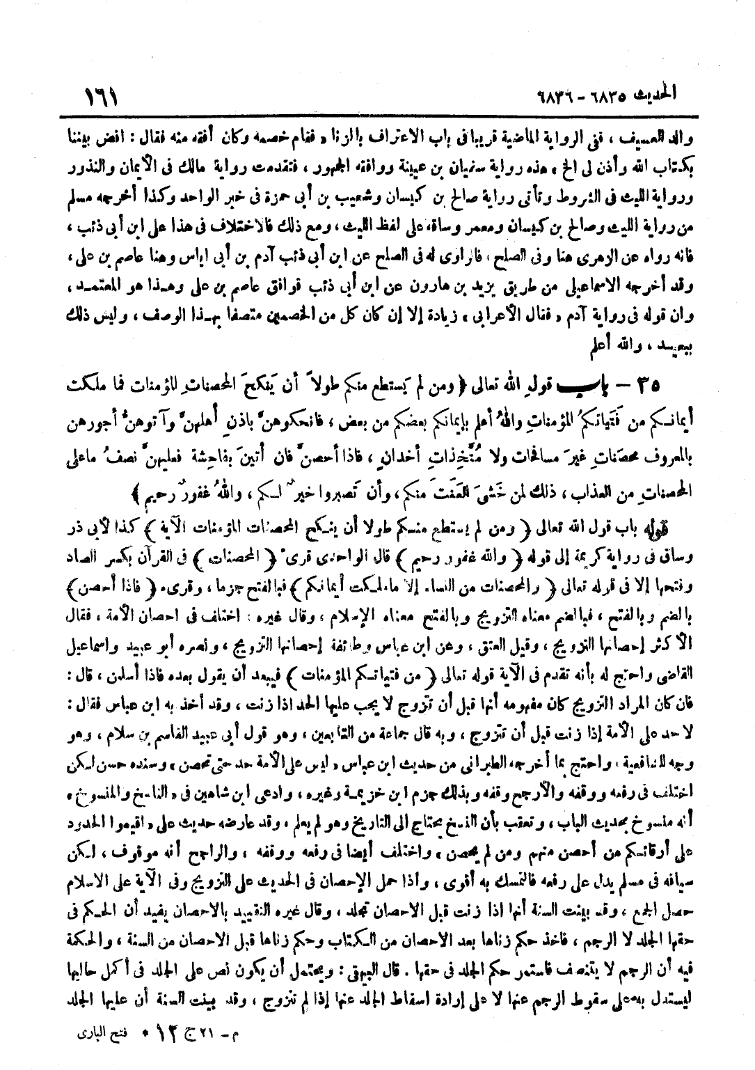 كَذَا لِأَبِي ذَرٍّ وَسَاقَ فِي رِوَايَةِ كَرِيمَةَ إِلَى قَوْله وَالله غَفُور رَحِيم قَالَ الْوَاحِدِيُّ قُرِئَ الْمُحْصَنَاتِ فِي الْقُرْآنِ بِكَسْرِ الصَّادِ وَفَتْحِهَا إِلَّا فِي قَوْلِهِ تَعَالَى وَالْمُحْصَنَاتُ مِنَ النِّسَاءِ إِلَّا مَا ملكت أَيْمَانكُم فَبِالْفَتْحِ جَزْمًا وَقُرِئَ فَإِذَا أُحْصِنَّ بِالضَّمِّ وَبِالْفَتْحِ فَبِالضَّمِّ مَعْنَاهُ التَّزْوِيجُ وَبِالْفَتْحِ مَعْنَاهُ الْإِسْلَامُ وَقَالَ غَيْرُهُ اخْتُلِفَ فِي إِحْصَانِ الْأَمَةِ فَقَالَ الْأَكْثَرُ إحصانها التَّزْوِيج وَقيل الْعتْق وَعَن بن عَبَّاسٍ وَطَائِفَةٍ إِحْصَانُهَا التَّزْوِيجُ وَنَصَرَهُ أَبُو عُبَيْدٍ وَإِسْمَاعِيلُ الْقَاضِي وَاحْتَجَّ لَهُ بِأَنَّهُ تَقَدَّمَ فِي الْآيَة قَوْله تَعَالَى من فَتَيَاتكُم الْمُؤْمِنَات فَيَبْعُدُ أَنْ يَقُولَ بَعْدَهُ فَإِذَا أَسْلَمْنَ قَالَ فَإِنْ كَانَ الْمُرَادُ التَّزْوِيجَ كَانَ مَفْهُومُهُ أَنَّهَا قَبْلَ أَنْ تَتَزَوَّجَ لَا يَجِبُ عَلَيْهَا الْحَدُّ إِذا زنت وَقد أَخذ بِهِ بن عَبَّاسٍ فَقَالَ لَا حَدَّ عَلَى الْأَمَةِ إِذَا زَنَتْ قَبْلَ أَنْ تَتَزَوَّجَ وَبِهِ قَالَ جَمَاعَةٌ مِنَ التَّابِعِينَ وَهُوَ قَوْلُ أَبِي عُبَيْدٍ الْقَاسِمِ بْنِ سَلَّامٍ وَهُوَ وَجْهٌ لِلشَّافِعِيَّةِ وَاحْتَجَّ بِمَا أخرجه الطَّبَرَانِيّ من حَدِيث بن عَبَّاسٍ لَيْسَ عَلَى الْأَمَةِ حَدٌّ حَتَّى تُحْصَنَ وَسَنَدُهُ حَسَنٌ لَكِنِ اخْتُلِفَ فِي رَفْعِهِ وَوَقْفِهِ والأرجح وَقفه وَبِذَلِك جزم بن خُزَيْمَة وَغَيره وَادّعى بن شَاهِينَ فِي النَّاسِخِ وَالْمَنْسُوخِ أَنَّهُ مَنْسُوخٌ بِحَدِيثِ الْبَابِ وَتُعُقِّبَ بِأَنَّ النَّسْخَ يَحْتَاجُ إِلَى التَّارِيخِ وَهُوَ لَمْ يُعْلَمْ وَقَدْ عَارَضَهُ حَدِيثُ عَلِيٍّ أَقِيمُوا الْحُدُودَ عَلَى أَرِقَّائِكُمْ مَنْ أُحْصِنَ مِنْهُمْ وَمَنْ لَمْ يُحْصَنْ وَاخْتُلِفَ أَيْضًا فِي رَفْعِهِ وَوَقْفِهِ وَالرَّاجِحُ أَنَّهُ مَوْقُوفٌ لَكِنَّ سِيَاقَهُ فِي مُسْلِمٍ يَدُلُّ عَلَى رَفْعِهِ فَالتَّمَسُّكُ بِهِ أَقْوَى وَإِذَا حُمِلَ الْإِحْصَانُ فِي الْحَدِيثِ عَلَى التَّزْوِيجِ وَفِي الْآيَةِ عَلَى الْإِسْلَامِ حَصَلَ الْجَمْعُ وَقَدْ بَيَّنَتِ السُّنَّةُ أَنَّهَا إِذَا زَنَتْ قَبْلَ الْإِحْصَانِ تُجْلَدُ وَقَالَ غَيْرُهُ التَّقْيِيدُ بِالْإِحْصَانِ يُفِيدُ أَنَّ الْحُكْمَ فِي حَقِّهَا الْجَلْدُ لَا الرَّجْمُ فَأُخِذَ حُكْمُ زِنَاهَا بَعْدَ الْإِحْصَانِ مِنَ الْكِتَابِ وَحُكْمُ زِنَاهَا قَبْلَ الْإِحْصَانِ مِنَ السُّنَّةِ وَالْحِكْمَةُ فِيهِ أَنَّ الرَّجْمَ لَا يَتَنَصَّفُ فَاسْتَمَرَّ حُكْمُ الْجَلْدِ فِي حَقِّهَا قَالَ الْبَيْهَقِيُّ وَيَحْتَمِلُ أَنْ يَكُونَ نُصَّ عَلَى الْجَلْدِ فِي أَكْمَلِ حَالَيْهَا لِيُسْتَدَلَّ بِهِ عَلَى سُقُوطِ الرَّجْمِ عَنْهَا لَا عَلَى إِرَادَةِ إِسْقَاطِ الْجَلْدِ عَنْهَا إِذَا لَمْ تَتَزَوَّجْ وَقَدْ بَيَّنَتِ السُّنَّةُ أَنَّ عَلَيْهَا الْجَلْدَ