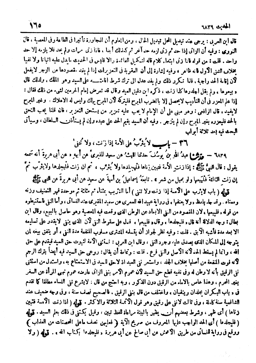 [6839] قَوْلُهُ إِذَا زَنَتِ الْأَمَةُ فَتَبَيَّنَ زِنَاهَا أَيْ ظَهَرَ وَشَرَطَ بَعْضُهُمْ أَنْ يَظْهَرَ بِالْبَيِّنَةِ مُرَاعَاةً لِلَفْظِ تَبَيَّنَ وَقِيلَ يُكْتَفَى فِي ذَلِكَ بِعِلْمِ السَّيِّدِ قَوْلُهُ فَلْيَجْلِدْهَا أَيِ الْحَدَّ الْوَاجِبَ عَلَيْهَا الْمَعْرُوفُ مِنْ صَرِيحِ الْآيَةِ فَعَلَيْهِنَّ نصف مَا على الْمُحْصنَات من الْعَذَاب وَوَقع فِي رِوَايَة للنسائي مِنْ طَرِيقِ الْأَعْمَشِ عَنْ أَبِي صَالِحٍ عَنْ أَبِي هُرَيْرَةَ فَلْيَجْلِدْهَا بِكِتَابِ اللَّهِ قَوْلُهُ وَلَا