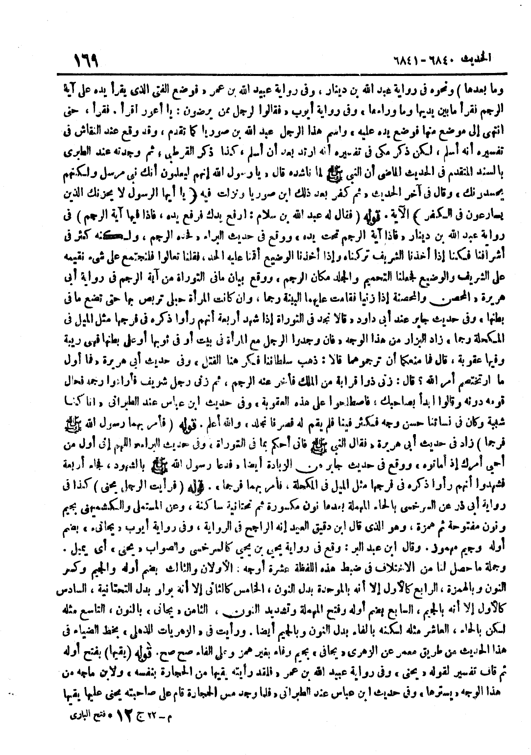 وَمَا بَعْدَهَا وَنَحْوُهُ فِي رِوَايَةِ عَبْدِ اللَّهِ بْنِ دِينَارٍ وَفِي رِوَايَةِ عُبَيْدِ اللَّهِ بْنِ عُمَرَ فَوَضَعَ الْفَتَى الَّذِي يَقْرَأُ يَدَهُ عَلَى آيَةِ الرَّجْمِ فَقَرَأَ مَا بَيْنَ يَدَيْهَا وَمَا وَرَاءَهَا وَفِي رِوَايَةِ أَيُّوبَ فَقَالُوا لِرَجُلٍ مِمَّنْ يَرْضَوْنَ يَا أَعْوَرُ اقْرَأْ فَقَرَأَ حَتَّى انْتَهَى إِلَى مَوْضِعٍ مِنْهَا فَوَضَعَ يَدَهُ عَلَيْهِ وَاسْمُ هَذَا الرَّجُلِ عَبْدُ اللَّهِ بْنُ صُورِيَّا كَمَا تَقَدَّمَ وَقَدْ وَقَعَ عِنْدَ النَّقَّاشِ فِي تَفْسِيرِهِ أَنَّهُ أَسْلَمَ لَكِنْ ذَكَرَ مَكِّيٌّ فِي تَفْسِيرِهِ أَنَّهُ ارْتَدَّ بَعْدَ أَنْ أَسْلَمَ كَذَا ذَكَرَ الْقُرْطُبِيُّ ثُمَّ وَجَدْتُهُ عِنْدَ الطَّبَرِيِّ بِالسَّنَدِ الْمُتَقَدِّمِ فِي الْحَدِيثِ الْمَاضِي أَنَّ النَّبِيَّ صَلَّى اللَّهُ عَلَيْهِ وَسَلَّمَ لَمَّا نَاشَدَهُ قَالَ يَا رَسُولَ اللَّهِ إِنَّهُمْ لَيَعْلَمُونَ أَنَّكَ نَبِيٌّ مُرْسَلٌ وَلَكِنَّهُمْ يَحْسُدُونَكَ وَقَالَ فِي آخِرِ الْحَدِيثِ ثُمَّ كَفَرَ بعد ذَلِك بن صُورِيَّا وَنَزَلَتْ فِيهِ يَا أَيُّهَا الرَّسُولُ لَا يحزنك الَّذين يُسَارِعُونَ فِي الْكفْر الْآيَةَ قوَلْهُ فَقَالَ لَهُ عَبْدُ اللَّهِ بْنُ سَلَامٍ ارْفَعْ يَدَكَ فَرَفَعَ يَدَهُ فَإِذَا فِيهَا آيَةُ الرَّجْمِ فِي رِوَايَةِ عَبْدِ اللَّهِ بْنِ دِينَارٍ فَإِذَا آيَةُ الرَّجْمِ تَحْتَ يَدِهِ وَوَقَعَ فِي حَدِيثِ الْبَرَاءِ فَحَدُّهُ الرَّجْمُ وَلَكِنَّهُ كَثُرَ فِي أَشْرَافِنَا فَكُنَّا إِذَا أَخَذْنَا الشَّرِيفَ تَرَكْنَاهُ وَإِذَا أَخَذْنَا الْوَضِيعَ أَقَمْنَا عَلَيْهِ الْحَدَّ فَقُلْنَا تَعَالَوْا فَلْنَجْتَمِعْ عَلَى شَيْءٍ نُقِيمُهُ عَلَى الشَّرِيفِ وَالْوَضِيعِ فَجَعَلْنَا التَّحْمِيمَ وَالْجَلْدَ مَكَانَ الرَّجْمِ وَوَقَعَ بَيَانُ مَا فِي التَّوْرَاةِ مِنْ آيَةِ الرَّجْمِ فِي رِوَايَةِ أَبِي هُرَيْرَةَ الْمُحْصَنُ وَالْمُحْصَنَةُ إِذَا زَنَيَا فَقَامَتْ عَلَيْهِمَا الْبَيِّنَةُ رُجِمَا وَإِنْ كَانَتِ الْمَرْأَةُ حُبْلَى تُرُبِّصَ بِهَا حَتَّى تَضَعَ مَا فِي بَطْنِهَا وَفِي حَدِيثِ جَابِرٍ عِنْدَ أَبِي دَاوُدَ قَالَا نَجِدُ فِي التَّوْرَاةِ إِذَا شَهِدَ أَرْبَعَةٌ أَنَّهُمْ رَأَوْا ذَكَرَهُ فِي فَرْجِهَا مِثْلَ الْمِيلِ فِي الْمُكْحُلَةِ رُجِمَا زَادَ الْبَزَّارُ مِنْ هَذَا الْوَجْهِ فَإِنْ وَجَدُوا الرَّجُلَ مَعَ الْمَرْأَةِ فِي بَيْتٍ أَوْ فِي ثَوْبِهَا أَوْ عَلَى بَطْنِهَا فَهِيَ رِيبَةٌ وَفِيهَا عُقُوبَةٌ قَالَ فَمَا مَنَعَكُمَا أَنْ تَرْجُمُوهُمَا قَالَا ذَهَبَ سُلْطَانُنَا فَكَرِهْنَا الْقَتْلَ وَفِي حَدِيثِ أَبِي هُرَيْرَةَ فَمَا أَوَّلُ مَا أرتخصتم أَمر الله قَالَ زنى ذَوا قَرَابَةٍ مِنَ الْمَلِكِ فَأَخَّرَ عَنْهُ الرَّجْمَ ثُمَّ زَنَى رَجُلٌ شَرِيفٌ فَأَرَادُوا رَجْمَهُ فَحَالَ قَوْمُهُ دُونَهُ وَقَالُوا ابْدَأْ بِصَاحِبِكَ فَاصْطَلَحُوا عَلَى هَذِهِ الْعقُوبَة وَفِي حَدِيث بن عَبَّاسٍ عِنْدَ الطَّبَرَانِيِّ إِنَّا كُنَّا شَبَبَةً وَكَانَ فِي نِسَائِنَا حُسْنُ وَجْهٍ فَكَثُرَ فِينَا فَلَمْ يُقَمْ لَهُ فَصِرْنَا نَجْلِدُ وَاللَّهُ أَعْلَمُ قَوْلُهُ فَأَمَرَ بِهِمَا رَسُولُ اللَّهِ صَلَّى اللَّهُ عَلَيْهِ وَسَلَّمَ فَرُجِمَا زَادَ فِي حَدِيثِ أَبِي هُرَيْرَةَ فَقَالَ النَّبِيُّ صَلَّى اللَّهُ عَلَيْهِ وَسَلَّمَ فَإِنِّي أَحْكُمُ بِمَا فِي التَّوْرَاةِ وَفِي حَدِيثِ الْبَرَاءِ اللَّهُمَّ إِنِّي أَوَّلُ مَنْ أُحْيِي أَمْرَكَ إِذْ أَمَاتُوهُ وَوَقَعَ فِي حَدِيثِ جَابِرٍ مِنَ الزِّيَادَةِ أَيْضًا فَدَعَا رَسُولُ اللَّهِ صَلَّى اللَّهُ عَلَيْهِ وَسَلَّمَ بِالشُّهُودِ فَجَاءَ أَرْبَعَةٌ فَشَهِدُوا أَنَّهُم