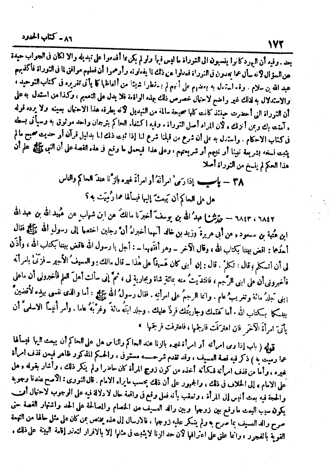 بُعْدٌ وَفِيهِ أَنَّ الْيَهُودَ كَانُوا يَنْسُبُونَ إِلَى التَّوْرَاةِ مَا لَيْسَ فِيهَا وَلَوْ لَمْ يَكُنْ مِمَّا أَقْدَمُوا عَلَى تَبْدِيلِهِ وَإِلَّا لَكَانَ فِي الْجَوَابِ حَيْدَةٌ عَنِ السُّؤَالِ لِأَنَّهُ سَأَلَ عَمَّا يَجِدُونَ فِي التَّوْرَاةِ فَعَدَلُوا عَنْ ذَلِكَ لِمَا يَفْعَلُونَهُ وَأَوْهَمُوا أَنَّ فِعْلَهُمْ مُوَافِقٌ لِمَا فِي التَّوْرَاةِ فَأَكْذَبَهُمْ عَبْدُ اللَّهِ بْنُ سَلَامٍ وَقَدِ اسْتَدَلَّ بِهِ بَعْضُهُمْ عَلَى أَنَّهُمْ لَمْ يُسْقِطُوا شَيْئًا مِنْ أَلْفَاظِهَا كَمَا يَأْتِي تَقْرِيرُهُ فِي كِتَابِ التَّوْحِيدِ وَالِاسْتِدْلَالُ بِهِ لِذَلِكَ غَيْرُ وَاضِحٍ لِاحْتِمَالِ خُصُوصِ ذَلِكَ بِهَذِهِ الْوَاقِعَةِ فَلَا يَدُلُّ عَلَى التَّعْمِيمِ وَكَذَا مَنِ اسْتَدَلَّ بِهِ عَلَى أَنَّ التَّوْرَاةَ الَّتِي أُحْضِرَتْ حِينَئِذٍ كَانَتْ كُلُّهَا صَحِيحَةً سَالِمَةً مِنَ التَّبْدِيلِ لِأَنَّهُ يَطْرُقُهُ هَذَا الِاحْتِمَالَ بِعَيْنِهِ وَلَا يَرُدُّهُ قَوْلُهُ آمَنْتُ بِكَ وَبِمَنْ أَنْزَلَكَ لِأَنَّ الْمُرَادَ أَصْلُ التَّوْرَاةُ وَفِيهِ اكْتِفَاءُ الْحَاكِمِ بِتُرْجُمَانٍ وَاحِدٍ مَوْثُوقٍ بِهِ وَسَيَأْتِي بَسْطُهُ فِي كِتَابِ الْأَحْكَامِ وَاسْتَدَلَّ بِهِ عَلَى أَنَّ شَرْعَ مَنْ قَبْلَنَا شَرْعٌ لَنَا إِذَا ثَبت ذَلِك إِمَّا بِدَلِيلِ قُرْآنٍ أَوْ حَدِيثٍ صَحِيحٍ مَا لَمْ يَثْبُتْ نَسْخُهُ بِشَرِيعَةِ نَبِيِّنَا أَوْ نَبِيِّهِمْ أَوْ شَرِيعَتِهِمْ وَعَلَى هَذَا فَيُحْمَلُ مَا وَقَعَ فِي هَذِهِ الْقِصَّةِ عَلَى أَنَّ النَّبِيَّ صَلَّى اللَّهُ عَلَيْهِ وَسَلَّمَ عَلِمَ أَنَّ هَذَا الْحُكْمَ لَمْ ينْسَخ من التَّوْرَاة أصلا
