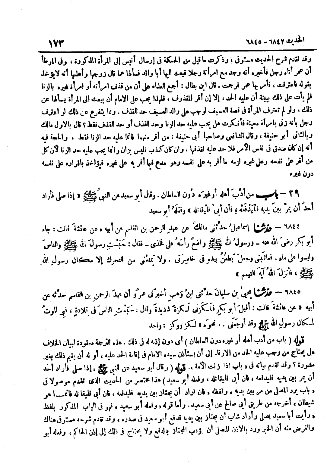 أَيْ دُونَ إِذْنِهِ لَهُ فِي ذَلِكَ هَذِهِ التَّرْجَمَةُ مَعْقُودَةٌ لِبَيَانِ الْخِلَافِ هَلْ يَحْتَاجُ مَنْ وَجَبَ عَلَيْهِ الْحَدُّ مِنَ الْأَرِقَّاءِ إِلَى أَنْ يَسْتَأْذِنَ سَيِّدُهُ الْإِمَامَ فِي إِقَامَةِ الْحَدِّ عَلَيْهِ أَوْ لَهُ أَنْ يُقِيمَ ذَلِكَ بِغَيْرِ مَشُورَةٍ وَقَدْ تَقَدَّمَ بَيَانُهُ فِي بَابِ إِذَا زَنَتِ الْأَمَةُ قَوْلُهُ وَقَالَ أَبُو سَعِيدٍ عَنِ النَّبِيُّ صَلَّى اللَّهُ عَلَيْهِ وَسَلَّمَ إِذَا صَلَّى فَأَرَادَ أَحَدٌ أَنْ يَمُرَّ بَيْنَ يَدَيْهِ فَلْيَدْفَعْهُ فَإِنْ أَبَى فَلْيُقَاتِلْهُ وَفَعَلَهُ أَبُو سَعِيدٍ هَذَا مُخْتَصَرٌ مِنَ الْحَدِيثِ الَّذِي تَقَدَّمَ مَوْصُولًا فِي بَابِ يَرُدُّ الْمُصَلِّي مَنْ مَرَّ بَيْنَ يَدَيْهِ وَلَفْظُهُ فَإِنْ أَرَادَ أَنْ يَجْتَازَ بَيْنَ يَدَيْهِ فَلْيَدْفَعْهُ فَإِنْ أَبَى فَلْيُقَاتِلْهُ فَإِنَّمَا هُوَ شَيْطَانٌ أَخْرَجَهُ مِنْ طَرِيقِ أَبِي صَالِحٍ عَنْ أَبِي سَعِيدٍ وَأَمَّا قَوْلُهُ وَفَعَلَهُ أَبُو سَعِيدٍ فَهُوَ فِي الْبَابِ الْمَذْكُورِ بِلَفْظِ رَأَيْتُ أَبَا سَعِيدٍ يُصَلِّي وَأَرَادَ شَابٌّ أَنْ يَجْتَازَ بَيْنَ يَدَيْهِ فَدفع أَبُو سَعِيدٍ فِي صَدْرِهِ وَقَدْ تَقَدَّمَ شَرْحُهُ مُسْتَوْفًى هُنَاكَ وَالْغَرَضُ مِنْهُ أَنَّ الْخَبَرَ وَرَدَ بِالْإِذْنِ لِلْمُصَلِّي أَنْ يُؤَدِّبَ الْمُجْتَازَ بِالدَّفْعِ وَلَا يَحْتَاجُ فِي ذَلِكَ إِلَى إِذْنِ الْحَاكِمِ وَفَعَلَهُ أَبُو