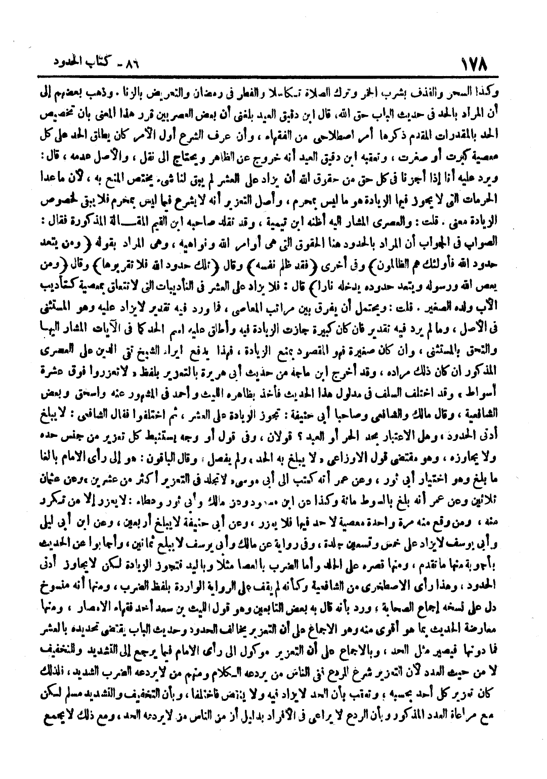 وَكَذَا السِّحْرُ وَالْقَذْفُ بِشُرْبِ الْخَمْرِ وَتَرْكُ الصَّلَاةِ تَكَاسُلًا وَالْفِطْرُ فِي رَمَضَانَ وَالتَّعْرِيضُ بِالزِّنَا وَذَهَبَ بَعْضُهُمْ إِلَى أَنَّ الْمُرَادَ بِالْحَدِّ فِي حَدِيثِ الْبَاب حق الله قَالَ بن دَقِيقِ الْعِيدِ بَلَغَنِي أَنَّ بَعْضَ الْعَصْرِيِّينَ قَرَّرَ هَذَا الْمَعْنَى بِأَنَّ تَخْصِيصَ الْحَدِّ بِالْمُقَدَّرَاتِ الْمُقَدَّمِ ذِكْرُهَا أَمْرٌ اصْطِلَاحِيٌّ مِنَ الْفُقَهَاءِ وَأَنَّ عُرْفَ الشَّرْعِ أَوَّلَ الْأَمْرِ كَانَ يُطْلِقُ الْحَدَّ عَلَى كل مَعْصِيّة كَبرت أَو صغرت وَتعقبه بن دَقِيقِ الْعِيدِ أَنَّهُ خُرُوجٌ عَنِ الظَّاهِرِ وَيَحْتَاجُ إِلَى نَقْلٍ وَالْأَصْلُ عَدَمُهُ قَالَ وَيَرُدُّ عَلَيْهِ أَنَّا إِذَا أَجَزْنَا فِي كُلِّ حَقٍّ مِنْ حُقُوقِ اللَّهِ أَنْ يُزَادَ عَلَى الْعَشْرِ لَمْ يَبْقَ لَنَا شَيْءٌ يَخْتَصُّ الْمَنْعُ بِهِ لِأَنَّ مَا عَدَا الْحُرُمَاتِ الَّتِي لَا يَجُوزُ فِيهَا الزِّيَادَةُ هُوَ مَا لَيْسَ بِمُحَرَّمٍ وَأَصْلُ التَّعْزِيرِ أَنَّهُ لَا يُشْرَعُ فِيمَا لَيْسَ بِمُحَرَّمٍ فَلَا يَبْقَى لِخُصُوصِ الزِّيَادَةِ مَعْنًى قُلْتُ وَالْعَصْرِيُّ الْمُشَارُ إِلَيْهِ أَظُنهُ بن تَيْمِية وَقد تقلد صَاحبه بن الْقَيِّمِ الْمَقَالَةَ الْمَذْكُورَةَ فَقَالَ الصَّوَابُ فِي الْجَوَابِ أَنَّ الْمُرَادَ بِالْحُدُودِ هُنَا الْحُقُوقُ الَّتِي هِيَ أَوَامِرُ اللَّهِ وَنَوَاهِيهِ وَهِيَ الْمُرَادُ بِقولِهِ وَمَنْ يَتَعَدَّ حُدُودَ اللَّهِ فَأُولَئِكَ هُمُ الظَّالِمُونَ وَفِي أُخْرَى فقد ظلم نَفسه وَقَالَ تِلْكَ حُدُود الله فَلَا تقربوها وَقَالَ وَمَنْ يَعْصِ اللَّهَ وَرَسُولَهُ وَيَتَعَدَّ حُدُودَهُ يدْخلهُ نَارا قَالَ فَلَا يُزَادُ عَلَى الْعَشْرِ فِي التَّأْدِيبَاتِ الَّتِي لَا تَتَعَلَّقُ بِمَعْصِيَةٍ كَتَأْدِيبِ الْأَبِ وَلَدَهُ الصَّغِيرَ قُلْتُ وَيَحْتَمِلُ أَنْ يُفَرَّقَ بَيْنَ مَرَاتِبِ الْمَعَاصِي فَمَا وَرَدَ فِيهِ تَقْدِيرٌ لَا يُزَادُ عَلَيْهِ وَهُوَ الْمُسْتَثْنَى فِي الْأَصْلِ وَمَا لَمْ يَرِدْ فِيهِ تَقْدِيرٌ فَإِنْ كَانَ كَبِيرَةً جَازَتِ الزِّيَادَةُ فِيهِ وَأُطْلِقَ عَلَيْهِ اسْمُ الْحَدِّ كَمَا فِي الْآيَاتِ الْمُشَارِ إِلَيْهَا وَالْتَحَقَ بِالْمُسْتَثْنَى وَإِنْ كَانَ صَغِيرَةً فَهُوَ الْمَقْصُودُ بِمَنْعِ الزِّيَادَةِ فَهَذَا يَدْفَعُ إِيرَادَ الشَّيْخِ تَقِيِّ الدِّينِ عَلَى الْعَصْرِيِّ الْمَذْكُورِ إِنْ كَانَ ذَلِكَ مُرَادَهُ وَقَدْ أَخْرَجَ بن مَاجَهْ مِنْ حَدِيثِ أَبِي هُرَيْرَةَ بِالتَّعْزِيرِ بِلَفْظِ لَا تُعَزِّرُوا فَوْقَ عَشَرَةِ أَسْوَاطٍ وَقَدِ اخْتَلَفَ السَّلَفُ فِي مَدْلُولِ هَذَا الْحَدِيثِ فَأَخَذَ بِظَاهِرِهِ اللَّيْثُ وَأَحْمَدُ فِي الْمَشْهُورِ عَنْهُ وَإِسْحَاقُ وَبَعْضُ الشَّافِعِيَّةِ وَقَالَ مَالِكٌ وَالشَّافِعِيُّ وَصَاحِبَا أَبِي حَنِيفَةَ تَجُوزُ الزِّيَادَةُ عَلَى الْعَشْرِ ثُمَّ اخْتَلَفُوا فَقَالَ الشَّافِعِيُّ لَا يَبْلُغُ أَدْنَى الْحُدُودِ وَهَلِ الِاعْتِبَارُ بِحَدِّ الْحُرِّ أَوِ الْعَبْدِ قَوْلَانِ وَفِي قَوْلٍ أَوْ وَجْهٍ يُسْتَنْبَطُ كُلُّ تَعْزِيرٍ مِنْ جِنْسِ حَدِّهِ وَلَا يُجَاوِزُهُ وَهُوَ مُقْتَضَى قَوْلِ الْأَوْزَاعِيِّ لَا يَبْلُغُ بِهِ الْحَدُّ وَلَمْ يُفَصِّلْ وَقَالَ الْبَاقُونَ هُوَ إِلَى رَأْيِ الْإِمَامِ بَالِغًا مَا بَلَغَ وَهُوَ اخْتِيَارُ أَبِي ثَوْرٍ وَعَنْ عُمَرَ أَنَّهُ كَتَبَ إِلَى أَبِي مُوسَى لَا تَجْلِدْ فِي التَّعْزِيرِ أَكْثَرَ مِنْ عِشْرِينَ وَعَنْ عُثْمَانَ ثَلَاثِينَ وَعَنْ عُمَرَ أَنَّهُ بَلَغَ بِالسَّوْطِ مِائَةً وَكَذَا عَن بن مَسْعُودٍ وَعَنْ مَالِكٍ وَأَبِي ثَوْرٍ وَعَطَاءٍ لَا يُعَزَّرُ إِلَّا مَنْ ت