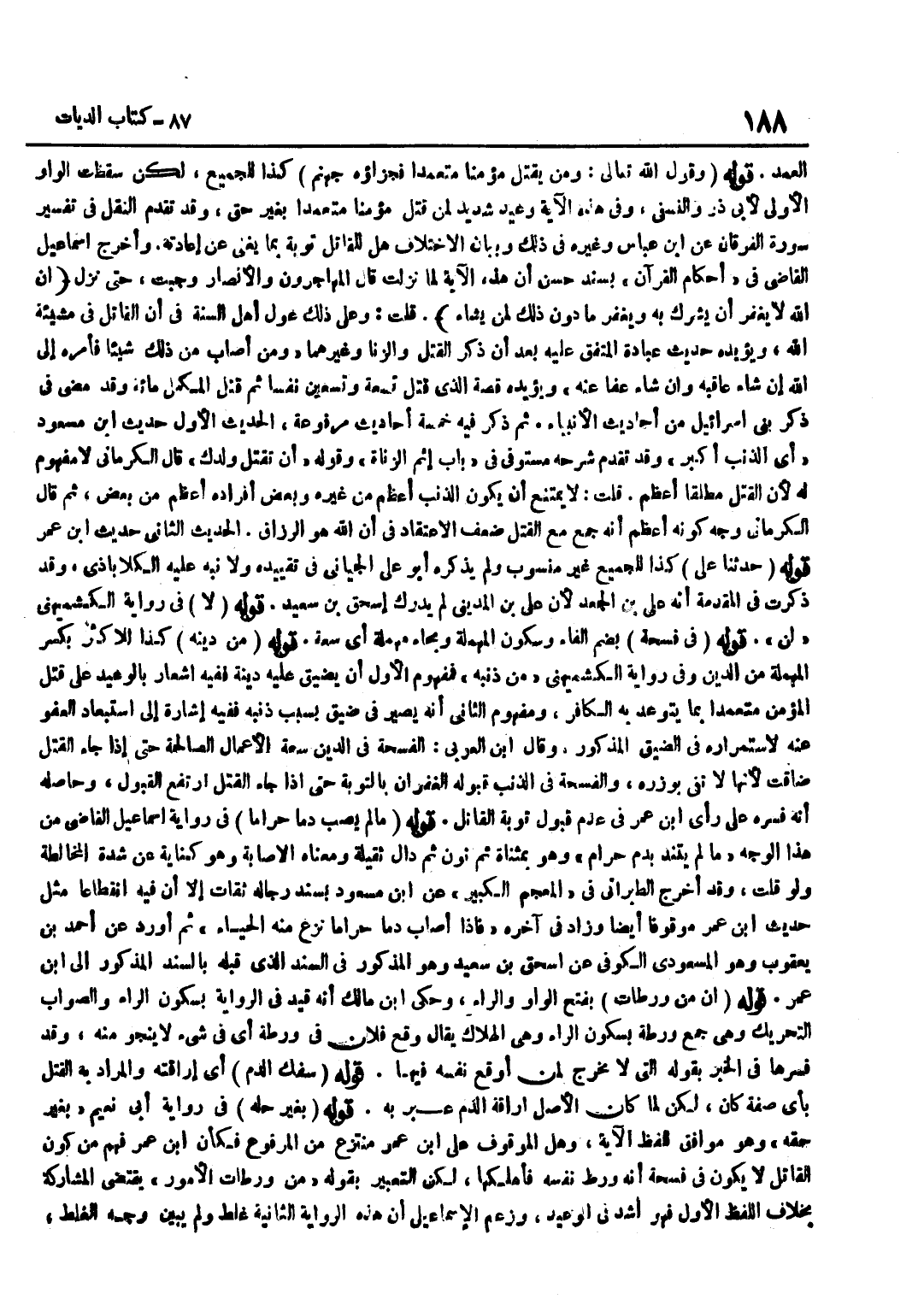 الْعَمْدِ قَوْلُهُ وَقَوْلُ اللَّهِ تَعَالَى وَمَنْ يَقْتُلْ مُؤْمِنًا مُتَعَمِّدًا فَجَزَاؤُهُ جَهَنَّمُ كَذَا لِلْجَمِيعِ لَكِنْ سَقَطَتِ الْوَاوُ الْأُولَى لِأَبِي ذَرٍّ وَالنَّسَفِيِّ وَفِي هَذِهِ الْآيَةِ وَعِيدٌ شَدِيدٌ لِمَنْ قَتَلَ مُؤْمِنًا مُتَعَمِّدًا بِغَيْرِ حَقٍّ وَقَدْ تَقَدَّمَ النَّقْلُ فِي تَفْسِيرِ سُورَةِ الْفُرْقَانِ عَنِ بن عَبَّاسٍ وَغَيْرِهِ فِي ذَلِكَ وَبَيَانُ الِاخْتِلَافِ هَلْ لِلْقَاتِلِ تَوْبَةٌ بِمَا يُغْنِي عَنْ إِعَادَتِهِ وَأَخْرَجَ اسْما عيل الْقَاضِي فِي أَحْكَامِ الْقُرْآنِ بِسَنَدٍ حَسَنٍ أَنَّ هَذِهِ الْآيَةَ لَمَّا نَزَلَتْ قَالَ الْمُهَاجِرُونَ وَالْأَنْصَارُ وَجَبَتْ حَتَّى نَزَلَ إِنَّ اللَّهَ لَا يَغْفِرُ أَنْ يُشْرَكَ بِهِ وَيَغْفِرُ مَا دُونَ ذَلِكَ لمن يَشَاء قُلْتُ وَعَلَى ذَلِكَ عَوَّلَ أَهْلُ السُّنَّةِ فِي أَنَّ الْقَاتِلَ فِي مَشِيئَةِ اللَّهِ وَيُؤَيِّدُهُ حَدِيثُ عُبَادَةَ الْمُتَّفَقُ عَلَيْهِ بَعْدَ أَنْ ذَكَرَ الْقَتْلَ وَالزِّنَا وَغَيْرَهُمَا وَمَنْ أَصَابَ مِنْ ذَلِكَ شَيْئًا فَأَمْرُهُ إِلَى اللَّهِ إِنْ شَاءَ عَاقَبَهُ وَإِنْ شَاءَ عَفَا عَنْهُ وَيُؤَيِّدُهُ قِصَّةُ الَّذِي قَتَلَ تِسْعَةً وَتِسْعِينَ نَفْسًا ثُمَّ قَتَلَ الْمُكَمِّلَ مِائَةً وَقَدْ مَضَى فِي ذِكْرِ بَنِي إِسْرَائِيلَ مِنْ أَحَادِيثِ الْأَنْبِيَاءِ ثُمَّ ذَكَرَ فِيهِ خَمْسَةَ أَحَادِيثَ مَرْفُوعَة الحَدِيث الأول حَدِيث بن مَسْعُودٍ