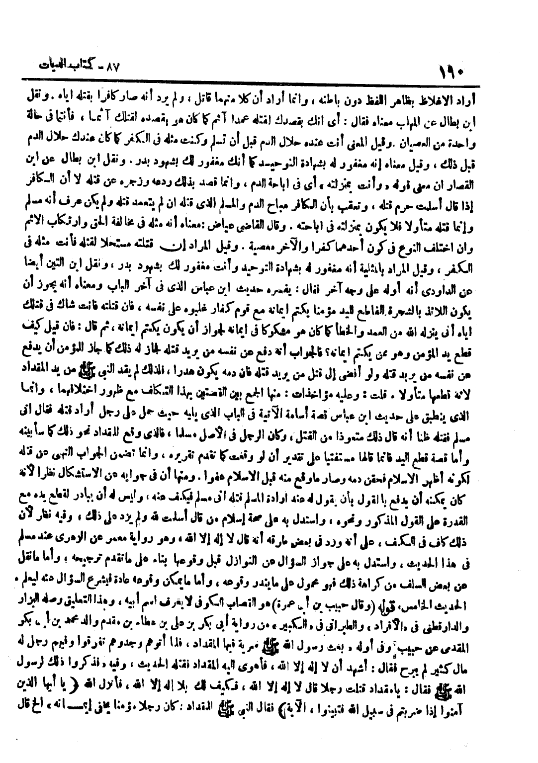 أَرَادَ الْإِغْلَاظَ بِظَاهِرِ اللَّفْظِ دُونَ بَاطِنِهِ وَإِنَّمَا أَرَادَ أَنَّ كُلًّا مِنْهُمَا قَاتِلٌ وَلَمْ يُرِدْ أَنه صَار كَافِرًا بقتْله إِيَّاه وَنقل بن بَطَّالٍ عَنِ الْمُهَلَّبِ مَعْنَاهُ فَقَالَ أَيْ أَنَّكَ بِقَصْدِكَ لِقَتْلِهِ عَمْدًا آثِمٌ كَمَا كَانَ هُوَ بِقَصْدِهِ لِقَتْلِكَ آثِمًا فَأَنْتُمَا فِي حَالَةٍ وَاحِدَةٍ مِنَ الْعِصْيَانِ وَقِيلَ الْمَعْنَى أَنْتَ عِنْدَهُ حَلَالُ الدَّمِ قَبْلَ أَنْ تُسْلِمَ وَكُنْتَ مِثْلَهُ فِي الْكُفْرِ كَمَا كَانَ عِنْدَكَ حَلَالَ الدَّمِ قَبْلَ ذَلِكَ وَقِيلَ مَعْنَاهُ أَنَّهُ مَغْفُورٌ لَهُ بِشَهَادَةِ التَّوْحِيدِ كَمَا أَنَّكَ مَغْفُورٌ لَكَ بِشُهُودِ بَدْرٍ وَنقل بن بطال عَن بن الْقَصَّارِ أَنَّ مَعْنَى قَوْلِهِ وَأَنْتَ بِمَنْزِلَتِهِ أَيْ فِي إِبَاحَةِ الدَّمِ وَإِنَّمَا قَصَدَ بِذَلِكَ رَدْعَهُ وَزَجْرَهُ عَنْ قَتْلِهِ لَا أَنَّ الْكَافِرَ إِذَا قَالَ أَسْلَمْتُ حَرُمَ قَتْلُهُ وَتُعُقِّبَ بِأَنَّ الْكَافِرَ مُبَاحُ الدَّمِ وَالْمُسْلِمَ الَّذِي قَتَلَهُ إِنْ لَمْ يَتَعَمَّدْ قَتْلَهُ وَلَمْ يَكُنْ عَرَفَ أَنَّهُ مُسْلِمٌ وَإِنَّمَا قَتَلَهُ مُتَأَوِّلًا فَلَا يَكُونُ بِمَنْزِلَتِهِ فِي إِبَاحَتِهِ وَقَالَ الْقَاضِي عِيَاضٌ مَعْنَاهُ أَنَّهُ مِثْلُهُ فِي مُخَالَفَةِ الْحَقِّ وَارْتِكَابِ الْإِثْمِ وَإِنِ اخْتَلَفَ النَّوْعُ فِي كَوْنِ أَحَدِهِمَا كُفْرًا وَالْآخَرِ مَعْصِيَةً وَقِيلَ الْمُرَادُ إِنْ قَتَلْتَهُ مُسْتَحِلًّا لِقَتْلِهِ فَأَنْتَ مِثْلُهُ فِي الْكُفْرِ وَقِيلَ الْمُرَادُ بِالْمِثْلِيَّةِ أَنَّهُ مَغْفُورٌ لَهُ بِشَهَادَةِ التَّوْحِيدِ وَأَنْتَ مَغْفُورٌ لَكَ بِشُهُود بدر وَنقل بن التِّينِ أَيْضًا عَنِ الدَّاوُدِيِّ أَنَّهُ أَوَّلَهُ عَلَى وَجه آخر فَقَالَ يفسره حَدِيث بن عَبَّاسٍ الَّذِي فِي آخِرِ الْبَابِ وَمَعْنَاهُ أَنَّهُ يَجُوزُ أَنْ يَكُونَ اللَّائِذُ بِالشَّجَرَةِ الْقَاطِعُ لِلْيَدِ مُؤْمِنًا يَكْتُمُ إِيمَانَهُ مَعَ قَوْمٍ كُفَّارٍ غَلَبُوهُ عَلَى نَفْسِهِ فَإِنْ قَتَلْتَهُ فَأَنْتَ شَاكٌّ فِي قَتْلِكَ إِيَّاهُ أَنَّى يُنْزِلُهُ اللَّهُ مِنَ الْعَمْدِ وَالْخَطَإِ كَمَا كَانَ هُوَ مَشْكُوكًا فِي إِيمَانِهِ لِجَوَازِ أَنْ يَكُونَ يَكْتُمُ إِيمَانَهُ ثُمَّ قَالَ فَإِنْ قِيلَ كَيْفَ قَطَعَ يَدَ الْمُؤْمِنِ وَهُوَ مِمَّنْ يَكْتُمُ إِيمَانَهُ فَالْجَوَابُ أَنَّهُ دَفَعَ عَنْ نَفْسِهِ مَنْ يُرِيدُ قَتْلَهُ فَجَازَ لَهُ ذَلِكَ كَمَا جَازَ لِلْمُؤْمِنِ أَنْ يَدْفَعَ عَنْ نَفْسِهِ مَنْ يُرِيدُ قَتْلَهُ وَلَوْ أَفْضَى إِلَى قَتْلِ مَنْ يُرِيدُ قَتْلَهُ فَإِنَّ دَمَهُ يَكُونُ هَدَرًا فَلِذَلِكَ لَمْ يُقِدِ النَّبِيُّ صَلَّى اللَّهُ عَلَيْهِ وَسَلَّمَ مِنْ يَدِ الْمِقْدَادِ لِأَنَّهُ قَطَعَهَا مُتَأَوِّلًا قُلْتُ وَعَلَيْهِ مُؤَاخَذَاتٌ مِنْهَا الْجَمْعُ بَيْنَ الْقِصَّتَيْنِ بِهَذَا التَّكَلُّفِ مَعَ ظُهُورِ اخْتِلَافِهِمَا وَإِنَّمَا الَّذِي ينطبق على حَدِيث بن عَبَّاسٍ قِصَّةُ أُسَامَةَ الْآتِيَةُ فِي الْبَابِ الَّذِي يَلِيهِ حَيْثُ حَمَلَ عَلَى رَجُلٍ أَرَادَ قَتْلَهُ فَقَالَ إِنِّي مُسْلِمٌ فَقَتَلَهُ ظَنًّا أَنَّهُ قَالَ ذَلِكَ مُتَعَوِّذًا مِنَ الْقَتْلِ وَكَانَ الرَّجُلُ فِي الْأَصْلِ مُسْلِمًا فَالَّذِي وَقَعَ لِلْمِقْدَادِ نَحْوُ ذَلِكَ كَمَا سَأُبَيِّنُهُ وَأَمَّا قِصَّةُ قَطْعِ الْيَدِ فَإِنَّمَا قَالَهَا مُسْتَفْتِيًا عَلَى تَقْدِيرِ أَنْ لَوْ وَقَعَتْ كَمَا تَقَدَّمَ تَقْرِيرُهُ وَإِنَّمَا تَضَمَّنَ الْجَوَابُ النَّهْيَ عَنْ قَتْلِهِ لِكَوْنِهِ أَظْهَرَ الْإِسْلَامَ فَحُقِنَ دَمُهُ وَصَارَ مَا وَقَعَ مِنْهُ قَبْلَ الْإِسْلَامِ عَفْوًا وَمِنْهَا أَنَّ 
