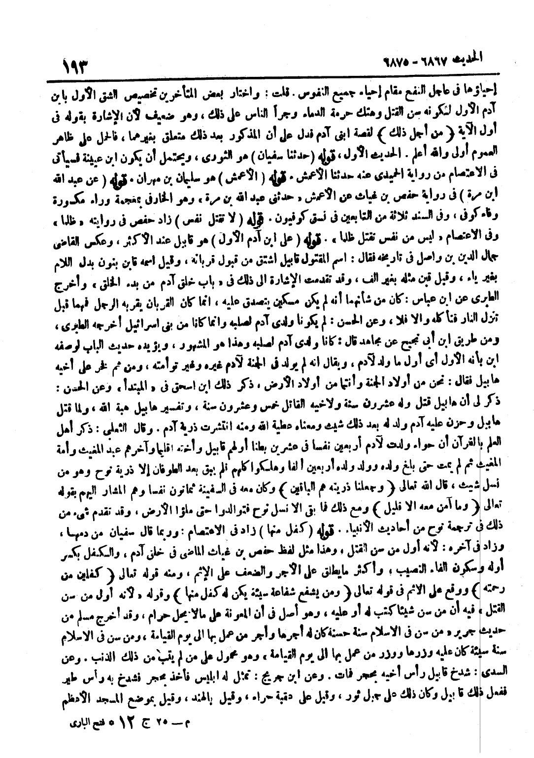 [6867] قَوْلُهُ حَدَّثَنَا سُفْيَانُ هُوَ الثَّوْرِيُّ وَيَحْتَمِلُ أَنْ يكون بن عُيَيْنَةَ فَسَيَأْتِي فِي الِاعْتِصَامِ مِنْ رِوَايَةِ الْحُمَيْدِيِّ عَنْهُ حَدَّثَنَا الْأَعْمَشُ قَوْلُهُ الْأَعْمَشُ هُوَ سُلَيْمَانُ بْنُ مِهْرَانَ قَوْلُهُ عَنْ عَبْدِ اللَّهِ بْنِ مُرَّةَ فِي رِوَايَةِ حَفْصِ بْنِ غِيَاثٍ عَنِ الْأَعْمَشِ حَدَّثَنِي عَبْدُ اللَّهِ بْنُ مُرَّةَ وَهُوَ الْخَارِفِيُّ بِمُعْجَمَةٍ وَرَاءٍ مَكْسُورَةٍ وَفَاءٍ كُوفِيٌّ وَفِي السَّنَدِ ثَلَاثَةٌ مِنَ التَّابِعِينَ فِي نَسَقٍ كُوفِيُّونَ قَوْلُهُ لَا تُقْتَلُ نَفْسٌ زَادَ حَفْصٌ فِي رِوَايَتِهِ ظُلْمًا وَفِي الِاعْتِصَامِ لَيْسَ مِنْ نَفْسٍ تقتل ظلما قَوْله على بن آدَمَ الْأَوَّلِ هُوَ قَابِيلُ عِنْدَ الْأَكْثَرِ وَعَكَسَ الْقَاضِي جَمَالُ الدِّينِ بْنُ وَاصِلٍ فِي تَارِيخِهِ فَقَالَ اسْمُ الْمَقْتُولِ قَابِيلُ اشْتُقَّ مِنْ قَبُولِ قُرْبَانِهِ وَقِيلَ اسْمُهُ قَابِنُ بِنُونٍ بَدَلَ اللَّامِ بِغَيْرِ يَاءٍ وَقِيلَ قَبِنُ مِثْلُهُ بِغَيْرِ أَلِفٍ وَقَدْ تَقَدَّمَتِ الْإِشَارَةُ إِلَى ذَلِكَ فِي بَابِ خَلْقِ آدَمَ مِنْ بَدْءِ الْخَلْقِ وَأَخْرَجَ الطَّبَرِيُّ عَن بن عَبَّاسٍ كَانَ مِنْ شَأْنِهِمَا أَنَّهُ لَمْ يَكُنْ مِسْكِينٌ يَتَصَدَّقُ عَلَيْهِ إِنَّمَا كَانَ الْقُرْبَانُ يُقَرِّبُهُ الرجل فمهما قُبِلَ تَنْزِلُ النَّارُ فَتَأْكُلُهُ وَإِلَّا فَلَا وَعَنِ الْحَسَنِ لَمْ يَكُونَا وَلَدَيْ آدَمَ لِصُلْبِهِ وَإِنَّمَا كَانَا مِنْ بَنِي إِسْرَائِيلَ أَخْرَجَهُ الطَّبَرِيُّ وَمِنْ طَرِيق بن أَبِي نَجِيحٍ عَنْ مُجَاهِدٍ قَالَ كَانَا وَلَدَيْ آدَمَ لِصُلْبِهِ وَهَذَا هُوَ الْمَشْهُورُ وَيُؤَيِّدُهُ حَدِيثُ الْبَاب لوصفه بن بِأَنَّهُ الْأَوَّلُ أَيْ أَوَّلُ مَا وُلِدَ لِآدَمَ وَيُقَالُ إِنَّهُ لَمْ يُولَدْ فِي الْجَنَّةِ لِآدَمَ غَيْرُهُ وَغَيْرُ تَوْأَمَتِهِ وَمِنْ ثَمَّ فَخَرَ عَلَى أَخِيهِ هَابِيلَ فَقَالَ نَحْنُ مِنْ أَوْلَادِ الْجَنَّةِ وأنتما من أَوْلَاد الأَرْض ذكر ذَلِك بن إِسْحَاقَ فِي الْمُبْتَدَإِ وَعَنِ الْحَسَنِ ذَكَرَ لِي أَنَّ هَابِيلَ قُتِلَ وَلَهُ عِشْرُونَ سَنَةً وَلِأَخِيهِ الْقَاتِلِ خَمْسٌ وَعِشْرُونَ سَنَةً وَتَفْسِيرُ هَابِيلَ هِبَةُ اللَّهِ وَلَمَّا قُتِلَ هَابِيلُ وَحَزِنَ عَلَيْهِ آدَمُ وُلِدَ لَهُ بَعْدَ ذَلِكَ شِيثُ وَمَعْنَاهُ عَطِيَّةُ اللَّهِ وَمِنْهُ انْتَشَرَتْ ذُرِّيَّةُ آدَمَ وَقَالَ الثَّعْلَبِيُّ ذَكَرَ أَهْلُ الْعِلْمِ بِالْقُرْآنِ أَنَّ حَوَّاءَ وَلَدَتْ لِآدَمَ أَرْبَعِينَ نَفْسًا فِي عِشْرِينَ بَطْنًا أَوَّلُهُمْ قَابِيلُ وَأُخْتُهُ إِقْلِيمَا وَآخِرُهُمْ عَبْدُ الْمُغِيثِ وَأَمَةُ الْمُغِيثِ ثُمَّ لَمْ يَمُتْ حَتَّى بَلَغَ وَلَدُهُ وَوَلَدُ وَلَدِهِ أَرْبَعِينَ أَلْفًا وَهَلَكُوا كُلُّهُمْ فَلَمْ يَبْقَ بَعْدَ الطُّوفَانِ إِلَّا ذُرِّيَّةَ نُوحٍ وَهُوَ مِنْ نَسْلِ شِيثَ قَالَ اللَّهُ تَعَالَى وَجَعَلْنَا ذُريَّته هم البَاقِينَ وَكَانَ مَعَه فِي السَّفِينَة ثَمَانُون نفسا وهم الْمُشَارُ إِلَيْهِمْ بِقَوْلِهِ تَعَالَى وَمَا آمَنَ مَعَهُ إِلَّا قَلِيل وَمَعَ ذَلِكَ فَمَا بَقِيَ إِلَّا نَسْلُ نُوحٍ فتوالدوا حَتَّى ملؤا الْأَرْضَ وَقَدْ تَقَدَّمَ شَيْءٌ مِنْ ذَلِكَ فِي تَرْجَمَةِ نُوحٍ مِنْ أَحَادِيثِ الْأَنْبِيَاءِ قَوْلُهُ كِفْلٌ مِنْهَا زَادَ فِي الِاعْتِصَامِ وَرُبَّمَا قَالَ سُفْيَانُ من دَمهَا وَزَاد فِي آخِره لِأَنَّهُ أول مَنْ سَنَّ الْقَتْلَ وَهَذَا مِثْلُ لَفْظِ حَفْصِ بْنِ غِيَاثٍ الْمَاضِي فِي خَلْقِ آدَمَ وَالْكِفْلُ بِكَسْرِ أَوَّلِهِ وَسُكُونِ الْفَاءِ النَّصِيبُ وَأَكْثَرُ مَا يُطْلَقُ عَلَى الْأَجْرِ وَالضِّعْفِ عَلَى الْإِثْمِ وَمِنْ