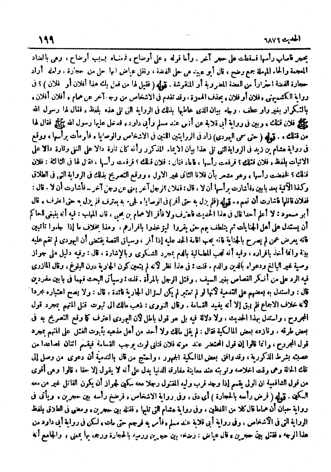 بِحَجَرٍ فَأَصَابَ رَأْسَهَا فَسَقَطَتْ عَلَى حَجَرٍ آخَرَ وَأَمَّا قَوْلُهُ عَلَى أَوْضَاحٍ فَمَعْنَاهُ بِسَبَبِ أَوْضَاحٍ وَهِيَ بِالضَّادِ الْمُعْجَمَةِ وَالْحَاءِ الْمُهْمَلَةِ جَمْعُ وَضَحٍ قَالَ أَبُو عُبَيْدٍ هِيَ حُلِيُّ الْفِضَّةِ وَنَقَلَ عِيَاضٌ أَنَّهَا حُلِيٌّ مِنْ حِجَارَةٍ وَلَعَلَّهُ أَرَادَ حِجَارَةَ الْفِضَّةِ احْتِرَازًا مِنَ الْفِضَّةِ الْمَضْرُوبَةِ أَوِ الْمَنْقُوشَةِ قَوْلُهُ فَقِيلَ لَهَا مَنْ فَعَلَ بِكِ هَذَا أَفُلَانٌ أَوْ فُلَانٌ فِي رِوَايَةِ الْكُشْمِيهَنِيِّ فُلَانٌ أَوْ فُلَانٌ بِحَذْفِ الْهَمْزَةِ وَقَدْ تَقَدَّمَ فِي الْأَشْخَاصِ مِنْ وَجْهٍ آخَرَ عَنْ هَمَّامٍ أَفُلَانٌ أَفُلَانٌ بِالتَّكْرَارِ بِغَيْرِ وَاوِ عَطْفٍ وَجَاءَ بَيَانُ الَّذِي خَاطَبَهَا بِذَلِكَ فِي الرِّوَايَةِ الَّتِي تَلِي هَذِهِ بِلَفْظِ فَقَالَ لَهَا رَسُولُ اللَّهِ صَلَّى اللَّهُ عَلَيْهِ وَسَلَّمَ فُلَانٌ قَتَلَكِ وَبَيْنَ فِي رِوَايَةِ أَبِي قِلَابَةَ عَنْ أَنَسٍ عِنْدَ مُسْلِمٍ وَأَبِي دَاوُدَ فَدَخَلَ عَلَيْهَا رَسُولِ اللَّهِ صَلَّى اللَّهُ عَلَيْهِ وَسَلَّمَ فَقَالَ لَهَا مَنْ قَتَلَكِ قَوْلُهُ حَتَّى سَمَّى الْيَهُودِيَّ زَادَ فِي الرِّوَايَتَيْنِ اللَّتَيْنِ فِي الْأَشْخَاصِ وَالْوَصَايَا فَأَوْمَأَتْ بِرَأْسِهَا وَوَقَعَ فِي رِوَايَةِ هِشَامِ بْنِ زَيْدٍ فِي الرِّوَايَةِ الَّتِي تَلِي هَذَا بَيَانُ الْإِيمَاءِ الْمَذْكُورِ وَأَنَّهُ كَانَ تَارَةً دَالًّا عَلَى النَّفْيِ وَتَارَةً دَالًّا عَلَى الْإِثْبَاتِ بِلَفْظِ فُلَانٌ قَتَلَكِ فَرَفَعَتْ رَأْسَهَا فَأَعَادَ فَقَالَ فُلَانٌ قَتَلَكِ فَرَفَعَتْ رَأْسَهَا فَقَالَ لَهَا فِي الثَّالِثَةِ فُلَانٌ قَتَلَكِ فَخَفَضَتْ رَأْسَهَا وَهُوَ مُشْعِرٌ بِأَنَّ فُلَانًا الثَّانِيَ غَيْرُ الْأَوَّلِ وَوَقَعَ التَّصْرِيحُ بِذَلِكَ فِي الرِّوَايَةِ الَّتِي فِي الطَّلَاقِ وَكَذَا الْآتِيَةُ بَعْدَ بَابَيْنِ فَأَشَارَتْ بِرَأْسِهَا أَنْ لَا قَالَ فَفُلَانٌ لِرَجُلٍ آخَرَ يَعْنِي عَنْ رَجُلٍ آخَرَ فَأَشَارَتْ أَنْ لَا قَالَ فَفُلَانٌ قَاتِلُهَا فَأَشَارَتْ أَنْ نَعَمْ قَوْلُهُ فَلَمْ يَزَلْ بِهِ حَتَّى أَقَرَّ فِي الْوَصَايَا فَجِيءَ بِهِ يَعْتَرِفُ فَلَمْ يَزَلْ بِهِ حَتَّى اعْتَرَفَ قَالَ أَبُو مَسْعُودٍ لَا أَعْلَمُ أَحَدًا قَالَ فِي هَذَا الْحَدِيثِ فَاعْتَرَفَ وَلَا فَأَقَرَّ إِلَّا هَمَّامَ بْنَ يَحْيَى قَالَ الْمُهَلَّبُ فِيهِ أَنَّهُ يَنْبَغِي لِلْحَاكِمِ أَنْ يَسْتَدِلَّ عَلَى أَهْلِ الْجِنَايَاتِ ثُمَّ يَتَلَطَّفَ بِهِمْ حَتَّى يُقِرُّوا لِيُؤْخَذُوا بإقرارهم وَهَذَا بِخِلَاف مَا إِذا جاؤوا تَائِبِينَ فَإِنَّهُ يُعْرِضُ عَمَّنْ لَمْ يُصَرِّحْ بِالْجِنَايَةِ فَإِنَّهُ يَجِبُ إِقَامَةُ الْحَدِّ عَلَيْهِ إِذَا أَقَرَّ وَسِيَاقُ الْقِصَّةِ يَقْتَضِي أَنَّ الْيَهُودِيَّ لَمْ تَقُمْ عَلَيْهِ بَيِّنَةٌ وَإِنَّمَا أُخِذَ بِإِقْرَارِهِ وَفِيهِ أَنَّهُ تَجِبُ الْمُطَالَبَةُ بِالدَّمِ بِمُجَرَّدِ الشَّكْوَى وَبِالْإِشَارَةِ قَالَ وَفِيهِ دَلِيلٌ عَلَى جَوَازِ وَصِيَّةِ غَيْرِ الْبَالِغِ وَدَعْوَاهُ بِالدَّيْنِ وَالدَّمِ قُلْتُ فِي هَذَا نَظَرٌ لِأَنَّهُ لَمْ يَتَعَيَّنْ كَوْنُ الْجَارِيَةِ دُونَ الْبُلُوغِ وَقَالَ الْمَازِرِيُّ فِيهِ الرَّدُّ عَلَى مَنْ أَنْكَرَ الْقِصَاصَ بِغَيْرِ السَّيْفِ وَقَتْلَ الرَّجُلِ بِالْمَرْأَةِ قُلْتُ وَسَيَأْتِي الْبَحْثُ فِيهِمَا فِي بَابَيْنِ مُفْرَدَيْنِ قَالَ وَاسْتَدَلَّ بِهِ بَعْضُهُمْ عَلَى التَّدْمِيَةِ لِأَنَّهَا لَوْ لَمْ تُعْتَبَرْ لَمْ يَكُنْ لِسُؤَالِ الْجَارِيَةِ فَائِدَةٌ قَالَ وَلَا يَصِحُّ اعْتِبَارُهُ مُجَرَّدًا لِأَنَّهُ خِلَافُ الْإِج