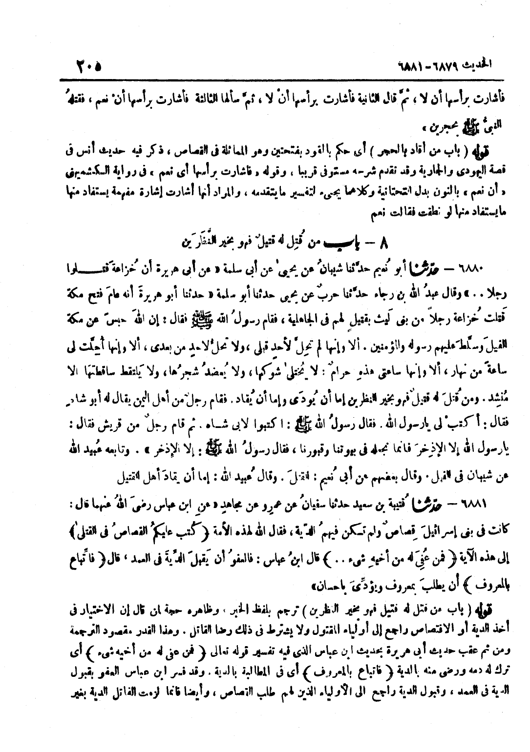 تَرْجَمَ بِلَفْظِ الْخَبَرِ وَظَاهِرُهُ حُجَّةٌ لِمَنْ قَالَ إِنَّ الِاخْتِيَارَ فِي أَخْذِ الدِّيَةِ أَوِ الِاقْتِصَاصِ رَاجِعٌ إِلَى أَوْلِيَاءِ الْمَقْتُولِ وَلَا يُشْتَرَطُ فِي ذَلِكَ رِضَا الْقَاتِلِ وَهَذَا الْقَدْرُ مَقْصُودُ التَّرْجَمَةِ وَمِنْ ثَمَّ عَقَّبَ حَدِيثَ أَبِي هُرَيْرَة بِحَدِيث بن عَبَّاسٍ الَّذِي فِيهِ تَفْسِيرُ قَوْلِهِ تَعَالَى فَمَنْ عُفيَ لَهُ من أَخِيه شَيْء أَيْ تَرَكَ لَهُ دَمَهُ وَرَضِيَ مِنْهُ بِالدِّيَةِ فاتباع بِالْمَعْرُوفِ أَي فِي الْمُطَالبَة بِالدِّيَةِ وَقد فسر بن عَبَّاسٍ الْعَفْوَ بِقَبُولِ الدِّيَةِ فِي الْعَمْدِ وَقَبُولُ الدِّيَةِ رَاجِعٌ إِلَى الْأَوْلِيَاءِ الَّذِينَ لَهُمْ طَلَبُ الْقِصَاصِ وَأَيْضًا فَإِنَّمَا لَزِمَتِ الْقَاتِلَ الدِّيَةُ بِغَيْرِ