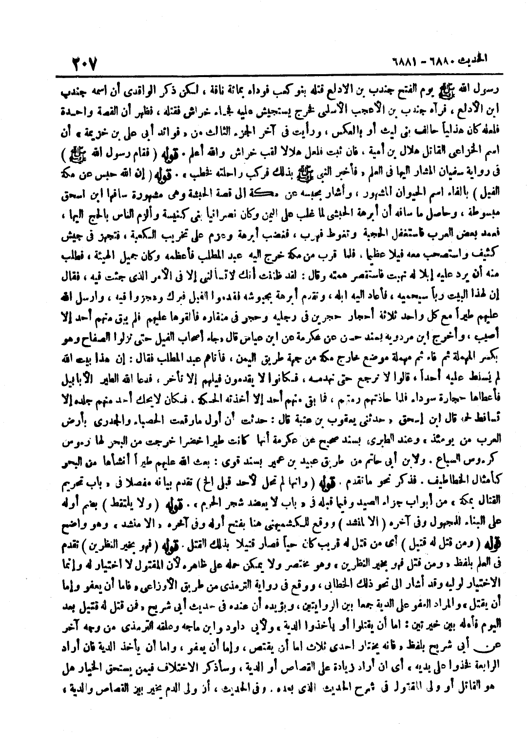 رَسُولُ اللَّهِ صَلَّى اللَّهُ عَلَيْهِ وَسَلَّمَ يَوْمَ الْفَتْحِ جُنْدَبُ بْنُ الْأَدْلَعِ قَتَلَهُ بَنُو كَعْبٍ فَوَدَاهُ بِمِائَةِ نَاقَةٍ لَكِنْ ذَكَرَ الْوَاقِدِيُّ أَنَّ اسْمَهُ جُنْدَبُ بْنُ الْأَدْلَعِ فَرَآهُ جُنْدَبُ بْنُ الْأَعْجَبِ الْأَسْلَمِيُّ فَخَرَجَ يَسْتَجِيشُ عَلَيْهِ فَجَاءَ خِرَاشٌ فَقَتَلَهُ فَظَهَرَ أَنَّ الْقِصَّةَ وَاحِدَةٌ فَلَعَلَّهُ كَانَ هُذَلِيًّا حَالَفَ بَنِي لَيْثٍ أَوْ بِالْعَكْسِ وَرَأَيْتُ فِي آخِرِ الْجُزْءِ الثَّالِثِ مِنْ فَوَائِدِ أَبِي عَلِيِّ بْنِ خُزَيْمَةَ أَنَّ اسْمَ الْخُزَاعِيِّ الْقَاتِلِ هِلَالُ بْنُ أُمَيَّةَ فَإِنْ ثَبَتَ فَلَعَلَّ هِلَالًا لَقَبُ خِرَاشٍ وَاللَّهُ أَعْلَمُ قَوْلُهُ فَقَامَ رَسُولُ اللَّهِ صَلَّى اللَّهُ عَلَيْهِ وَسَلَّمَ فِي رِوَايَةِ سُفْيَانَ الْمُشَارِ إِلَيْهَا فِي الْعِلْمِ فَأُخْبِرَ النَّبِيُّ صَلَّى اللَّهُ عَلَيْهِ وَسَلَّمَ بِذَلِكَ فَرَكِبَ رَاحِلَتَهُ فَخَطَبَ قَوْلُهُ إِنَّ اللَّهَ حَبَسَ عَنْ مَكَّةَ الْفِيلَ بِالْفَاءِ اسْمُ الْحَيَوَانِ الْمَشْهُورِ وَأَشَارَ بِحَبْسِهِ عَنْ مَكَّةَ إِلَى قِصَّةِ الْحَبَشَةِ وَهِيَ مَشْهُورَةٌ سَاقهَا بن إِسْحَاقَ مَبْسُوطَةً وَحَاصِلُ مَا سَاقَهُ أَنَّ أَبْرَهَةَ الْحَبَشِيَّ لَمَّا غَلَبَ عَلَى الْيَمَنِ وَكَانَ نَصْرَانِيًّا بَنَى كَنِيسَةً وَأَلْزَمَ النَّاسَ بِالْحَجِّ إِلَيْهَا فَعَمَدَ بَعْضُ الْعَرَبِ فَاسْتَغْفَلَ الْحَجَبَةَ وَتَغَوَّطَ فَهَرَبَ فَغَضِبَ أَبْرَهَةُ وَعَزَمَ عَلَى تَخْرِيبِ الْكَعْبَةِ فَتَجَهَّزَ فِي جَيْشٍ كَثِيفٍ وَاسْتَصْحَبَ مَعَهُ فِيلًا عَظِيمًا فَلَمَّا قَرُبَ مِنْ مَكَّةَ خَرَجَ إِلَيْهِ عَبْدُ الْمُطَّلِبِ فَأَعْظَمَهُ وَكَانَ جَمِيلَ الْهَيْئَةِ فَطَلَبَ مِنْهُ أَنْ يَرُدَّ عَلَيْهِ إِبِلًا لَهُ نُهِبَتْ فَاسْتَقْصَرَ هِمَّتَهُ وَقَالَ لَقَدْ ظَنَنْتُ أَنَّكَ لَا تَسْأَلُنِي إِلَّا فِي الْأَمْرِ الَّذِي جِئْتُ فِيهِ فَقَالَ إِنَّ لِهَذَا الْبَيْتِ رَبًّا سَيَحْمِيهِ فَأَعَادَ إِلَيْهِ إِبِلَهُ وَتَقَدَّمَ أَبْرَهَةُ بِجُيُوشِهِ فَقَدَّمُوا الْفِيلَ فَبَرَكَ وَعَجَزُوا فِيهِ وَأَرْسَلَ اللَّهُ عَلَيْهِمْ طَيْرًا مَعَ كُلِّ وَاحِد ثَلَاثَة أَحْجَار حجرين فِي رجلَيْهِ وَحجر فِي مِنْقَارِهِ فَأَلْقَوْهَا عَلَيْهِمْ فَلَمْ يَبْقَ مِنْهُمْ أحد إِلَّا اصيب وَأخرج بن مرْدَوَيْه بِسَنَد حسن عَن عِكْرِمَة عَن بن عياس قَالَ جَاءَ أَصْحَابُ الْفِيلِ حَتَّى نَزَلُوا الصِّفَاحَ وَهُوَ بِكَسْرِ الْمُهْمَلَةِ ثُمَّ فَاءٍ ثُمَّ مُهْمَلَةٍ مَوْضِعٌ خَارِجَ مَكَّةَ مِنْ جِهَةِ طَرِيقِ الْيَمَنِ فَأَتَاهُمْ عَبْدُ الْمُطَّلِبِ فَقَالَ إِنَّ هَذَا بَيْتُ اللَّهِ لَمْ يُسَلِّطْ عَلَيْهِ أَحَدًا قَالُوا لَا نَرْجِعُ حَتَّى نَهْدِمَهُ فَكَانُوا لَا يُقَدِّمُونَ فِيلَهُمْ إِلَّا تَأَخَّرَ فَدَعَا اللَّهُ الطَّيْرَ الْأَبَابِيلَ فَأَعْطَاهَا حِجَارَةً سَوْدَاءَ فَلَمَّا حَاذَتْهُمْ رَمَتْهُمْ فَمَا بَقِيَ مِنْهُمْ أَحَدٌ إِلَّا أَخَذَتْهُ الْحَكَّةُ فَكَانَ لَا يَحُكُّ أَحَدٌ مِنْهُمْ جِلْدَهُ إِلَّا تَسَاقَطَ لَحْمُهُ قَالَ بن إِسْحَاقَ حَدَّثَنِي يَعْقُوبُ بْنُ عُتْبَةَ قَالَ حُدِّثْتُ أَنَّ أَوَّلَ مَا وَقَعَتِ الْحَصْبَاءُ وَالْجُدَرِيُّ بِأَرْضِ الْعَرَبِ مِنْ يَوْمئِذٍ وَعِنْدَ الطَّبَرِيِّ بِسَنَدٍ صَحِيحٍ عَنْ عِكْرِمَةَ أَنَّهَا كَانَتْ طَيْرًا خُضْرًا خَرَجَتْ من الْبَحْر لَهَا رُؤُوس كَرُءُوسِ السِّبَاعِ وَلِابْنِ أَبِي حَاتِمٍ مِنْ طَرِيقِ عُبَيْدِ بْنِ عُمَيْرٍ بِسَنَدٍ قَوِيٍّ بَعَثَ اللَّهُ عَلَيْهِمْ طَيْرًا أَنْشَأَهَا مِنَ الْبَحْرِ كَأَمْثَالِ الْخَطَاطِيفِ فَذَكَرَ نَحْوَ مَا تَق