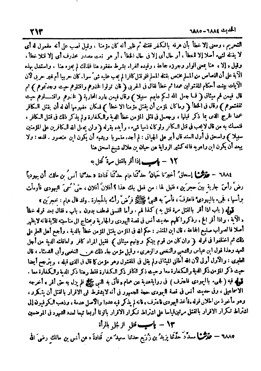كَذَا لَهُمْ وَأَمَّا النَّسَفِيُّ فَعَطَفَ بِدُونِ بَابٍ فَقَالَ بَعْدَ قَوْلِهِ خَطَأً الْآيَةَ وَإِذَا أَقَرَّ إِلَخْ وَذَكَرُوا كُلُّهُمْ حَدِيثَ أَنَسٍ فِي قِصَّةِ الْيَهُودِيِّ وَالْجَارِيَةِ وَيَحْتَاجُ إِلَى مُنَاسَبَتِهِ لِلْآيَةِ فَإِنَّهُ لَا يَظْهَرُ أصلا فَالصَّوَاب صَنِيع الْجَمَاعَة قَالَ بن الْمُنْذِرِ حَكَمَ اللَّهُ فِي الْمُؤْمِنِ يَقْتُلُ الْمُؤْمِنَ خَطَأً بِالدِّيَةِ وَأَجْمَعَ أَهْلُ الْعِلْمِ عَلَى ذَلِكَ ثُمَّ اخْتَلَفُوا فِي قَوْلِهِ وَإِنْ كَانَ مِنْ قوم بَيْنكُم وَبينهمْ مِيثَاق فَقِيلَ الْمُرَادُ كَافِرٌ وَلِعَاقِلَتِهِ الدِّيَةُ مِنْ أَجْلِ الْعَهْد وَهَذَا قَول بن عَبَّاسٍ وَالشَّعْبِيِّ وَالنَّخَعِيِّ وَالزَّهْرِيِّ وَقِيلَ مُؤْمِنٌ جَاءَ ذَلِك عَن النَّخعِيّ وَأبي الشعْثَاء قَالَ قَالَ الطَّبَرِيُّ وَالْأَوَّلُ أَوْلَى لِأَنَّ اللَّهَ أَطْلَقَ الْمِيثَاقَ وَلَمْ يَقُلْ فِي الْمَقْتُولِ وَهُوَ مُؤْمِنٌ كَمَا قَالَ فِي الَّذِي قَبْلَهُ وَيَتَرَجَّحُ أَيْضًا حَيْثُ ذَكَرَ الْمُؤْمِنَ ذَكَرَ الدِّيَةَ وَالْكَفَّارَةَ مَعًا وَحَيْثُ ذَكَرَ الْكَافِرَ ذَكَرَ الْكَفَّارَةَ فَقَطْ وَهُنَا ذكر الدِّيَة وَالْكَفَّارَة مَعًا قَوْله فِيهِ فَجِيءَ بِالْيَهُودِيِّ فَاعْتَرَفَ فِي رِوَايَةِ هُدْبَةَ عَنْ هَمَّامٍ فَأُتِيَ بِهِ النَّبِيُّ صَلَّى اللَّهُ عَلَيْهِ وَسَلَّمَ فَلَمْ يَزَلْ بِهِ حَتَّى أَقَرَّ أَخْرَجَهُ الْإِسْمَاعِيلِيُّ وَفِي حَدِيثِ أَنَسٍ فِي قِصَّةِ الْيَهُودِيِّ حُجَّةٌ لِلْجُمْهُورِ فِي أَنَّهُ لَا يُشْتَرَطُ فِي الْإِقْرَارِ بِالْقَتْلِ أَنْ يَتَكَرَّرَ وَهُوَ مَأْخُوذٌ مِنْ إِطْلَاقِ قَوْلِهِ فَأُخِذَ الْيَهُودِيُّ فَاعْتَرَفَ فَإِنَّهُ لَمْ يَذْكُرْ فِيهِ عَدَدًا وَالْأَصْلُ عَدَمُهُ وَذَهَبَ الْكُوفِيُّونَ إِلَى اشْتِرَاطِ تَكْرَارِ الْإِقْرَارِ بِالْقَتْلِ مَرَّتَيْنِ قِيَاسًا عَلَى اشْتِرَاطِ تَكْرَارِ الْإِقْرَارِ بِالزِّنَا أَرْبَعًا تَبَعًا لعدد الشُّهُود فِي الْمَوْضِعَيْنِ