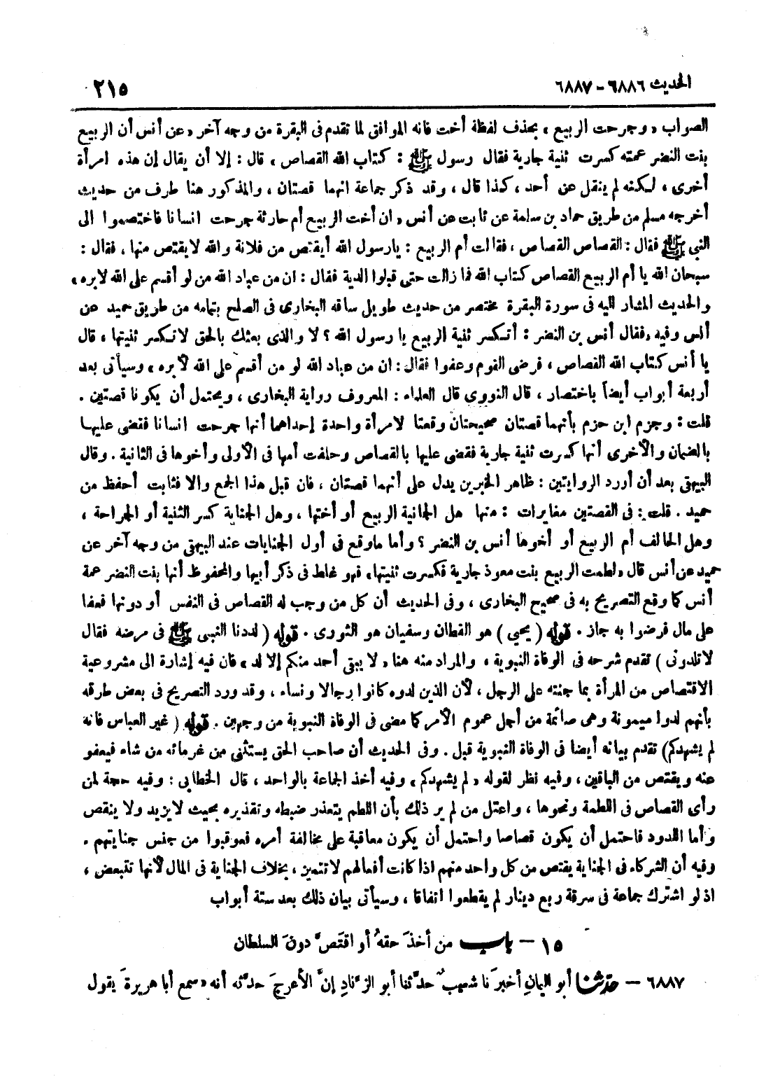 الصَّوَابَ وَجَرَحَتِ الرُّبَيِّعُ بِحَذْفِ لَفْظَةِ أُخْتٍ فَإِنَّهُ الْمُوَافِقُ لِمَا تَقَدَّمَ فِي الْبَقَرَةِ مِنْ وَجْهٍ آخَرَ عَنْ أَنَسٍ أَنَّ الرُّبَيِّعَ بِنْتَ النَّضْرِ عمته كسرت ثنية جَارِيَة فَقَالَ رَسُول صَلَّى اللَّهُ عَلَيْهِ وَسَلَّمَ كِتَابُ اللَّهِ الْقِصَاصُ قَالَ إِلَّا أَنْ يُقَالَ إِنَّ هَذِهِ امْرَأَةٌ أُخْرَى لَكِنَّهُ لَمْ يُنْقَلْ عَنْ أَحَدٍ كَذَا قَالَ وَقَدْ ذَكَرَ جَمَاعَةٌ أَنَّهُمَا قِصَّتَانِ وَالْمَذْكُورُ هُنَا طَرَفٌ مِنْ حَدِيثٍ أَخْرَجَهُ مُسْلِمٍ مِنْ طَرِيقِ حَمَّادِ بْنِ سَلَمَةَ عَنْ ثَابِتٍ عَنْ أَنَسٍ أَنَّ أُخْتَ الرُّبَيِّعِ أُمَّ حَارِثَةَ جَرَحَتْ إِنْسَانًا فَاخْتَصَمُوا إِلَى النَّبِيِّ صَلَّى اللَّهُ عَلَيْهِ وَسَلَّمَ فَقَالَ الْقِصَاصَ الْقِصَاصَ فَقَالَتْ أُمُّ الرَّبِيعِ يَا رَسُولَ اللَّهِ أَيُقْتَصُّ مِنْ فُلَانَةٍ وَاللَّهِ لَا يُقْتَصُّ مِنْهَا فَقَالَ سُبْحَانَ اللَّهِ يَا أُمَّ الرُّبَيِّعِ الْقِصَاصُ كِتَابُ اللَّهِ فَمَا زَالَتْ حَتَّى قَبِلُوا الدِّيَةَ فَقَالَ إِنَّ مِنْ عِبَادِ اللَّهِ مَنْ لَوْ أَقْسَمَ عَلَى اللَّهِ لَأَبَرَّهُ والْحَدِيث الْمُشَارُ إِلَيْهِ فِي سُورَةِ الْبَقَرَةِ مُخْتَصَرٌ مِنْ حَدِيثٍ طَوِيلٍ سَاقَهُ الْبُخَارِيُّ فِي الصُّلْحِ بِتَمَامِهِ مِنْ طَرِيقِ حُمَيْدٍ عَنْ أَنَسٍ وَفِيهِ فَقَالَ أَنَسُ بْنُ النَّضْرِ أَتُكْسَرُ ثَنِيَّةُ الرُّبَيِّعِ يَا رَسُولَ اللَّهِ لَا وَالَّذِي بَعَثَكَ بِالْحَقِّ لَا تُكْسَرُ ثَنِيَّتُهَا قَالَ يَا أَنَسُ كِتَابُ اللَّهِ الْقِصَاصُ فَرَضِيَ الْقَوْمُ وَعَفَوْا فَقَالَ إِنَّ مِنْ عباد الله لَو من أَقْسَمَ عَلَى اللَّهِ لَأَبَرَّهُ وَسَيَأْتِي بَعْدَ أَرْبَعَةِ أَبْوَابٍ أَيْضًا بِاخْتِصَارٍ قَالَ النَّوَوِيُّ قَالَ الْعُلَمَاءُ الْمَعْرُوفُ رِوَايَةُ الْبُخَارِيِّ وَيَحْتَمِلُ أَنْ يَكُونَا قِصَّتَيْنِ قلت وَجزم بن حَزْمٍ بِأَنَّهُمَا قِصَّتَانِ صَحِيحَتَانِ وَقَعَتَا لِامْرَأَةٍ وَاحِدَةٍ إِحْدَاهُمَا أَنَّهَا جَرَحَتْ إِنْسَانًا فَقُضِيَ عَلَيْهَا بِالضَّمَانِ وَالْأُخْرَى أَنَّهَا كَسَرَتْ ثَنِيَّةَ جَارِيَةٍ فَقُضِيَ عَلَيْهَا بِالْقِصَاصِ وَحَلَفَتْ أُمُّهَا فِي الْأُولَى وَأَخُوهَا فِي الثَّانِيَةِ وَقَالَ الْبَيْهَقِيُّ بَعْدَ أَنْ أَوْرَدَ الرِّوَايَتَيْنِ ظَاهِرُ الْخَبَرَيْنِ يَدُلُّ عَلَى أَنَّهُمَا قِصَّتَانِ فَإِنْ قُبِلَ هَذَا الْجَمْعُ وَإِلَّا فَثَابِتٌ أَحْفَظُ مِنْ حُمَيْدٍ قُلْتُ فِي الْقِصَّتَيْنِ مُغَايَرَاتٌ مِنْهَا هَلِ الْجَانِيَةُ الرُّبَيِّعُ أَوْ أُخْتُهَا وَهَلِ الْجِنَايَةُ كَسْرُ الثَّنِيَّةِ أَوِ الْجِرَاحَةُ وَهَلِ الْحَالِفُ أُمُّ الرُّبَيِّعِ أَوْ أَخُوهَا أَنَسُ بْنُ النَّضْرِ وَأَمَّا مَا وَقَعَ فِي أَوَّلِ الْجِنَايَاتِ عِنْدَ الْبَيْهَقِيِّ مِنْ وَجْهٍ آخَرَ عَنْ حُمَيْدٍ عَنْ أَنَسٍ قَالَ لَطَمَتِ الرُّبَيِّعُ بِنْتُ مُعَوِّذٍ جَارِيَةً فَكَسَرَتْ ثَنِيَّتَهَا فَهُوَ غَلَطٌ فِي ذِكْرِ أَبِيهَا وَالْمَحْفُوظُ أَنَّهَا بِنْتُ النَّضْرِ عَمَّةُ أَنَسٍ كَمَا وَقَعَ التَّصْرِيحُ بِهِ فِي صَحِيحِ الْبُخَارِيِّ وَفِي الْحَدِيثِ أَنَّ كُلَّ مَنْ وَجَبَ لَهُ الْقِصَاصُ فِي النَّفْسِ أَوْ دُونِهَا فَعَفَا عَلَى مَالٍ فَرَضُوا بِهِ جَازَ