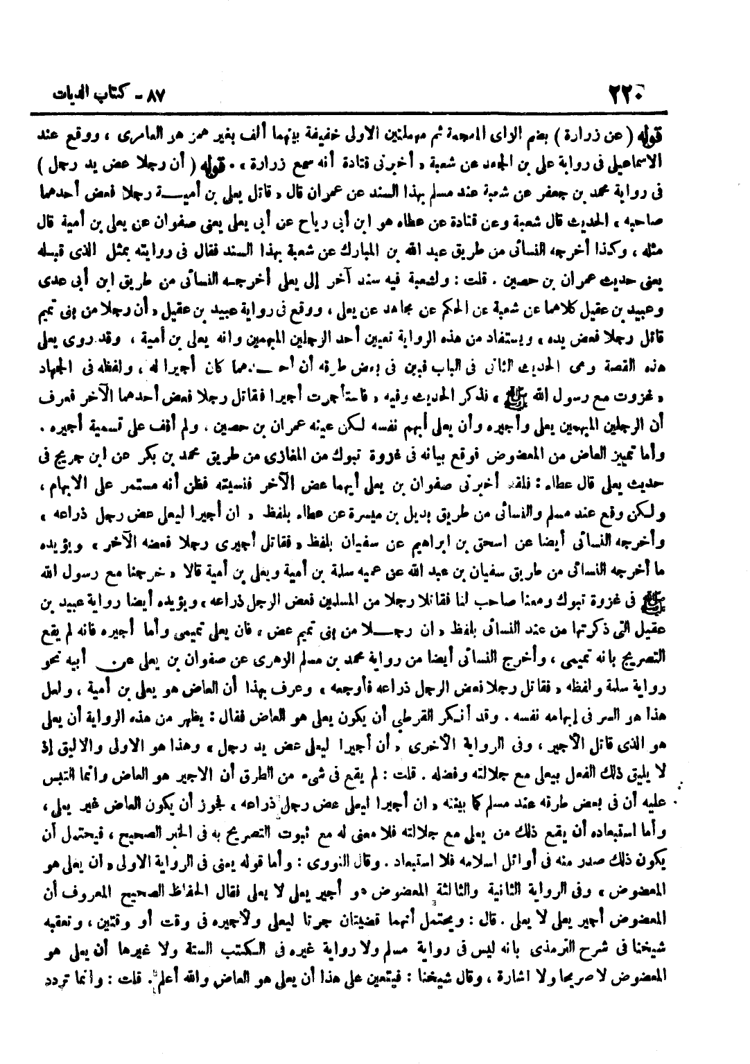 [6892] قَوْلُهُ عَنْ زُرَارَةَ بِضَمِّ الزَّايِ الْمُعْجَمَةِ ثُمَّ مُهْمَلَتَيْنِ الْأُولَى خَفِيفَةٌ بَيْنَهُمَا أَلِفٌ بِغَيْرِ هَمْزٍ هُوَ الْعَامِرِيُّ وَوَقَعَ عِنْدَ الْإِسْمَاعِيلِيِّ فِي رِوَايَةِ عَلِيِّ بْنِ الْجَعْدِ عَنْ شُعْبَةَ أَخْبَرَنِي قَتَادَةُ أَنَّهُ سَمِعَ زُرَارَةَ قَوْلُهُ أَنَّ رَجُلًا عَضَّ يَدَ رَجُلٍ فِي رِوَايَةِ مُحَمَّدِ بْنِ جَعْفَرٍ عَنْ شُعْبَةَ عِنْدَ مُسْلِمٍ بِهَذَا السَّنَدِ عَنْ عِمْرَانَ قَالَ قَاتَلَ يَعْلَى بْنُ أُمَيَّةَ رَجُلًا فَعَضَّ أَحَدُهُمَا صَاحِبَهُ الْحَدِيثَ قَالَ شُعْبَةُ وَعَنْ قَتَادَةَ عَن عَطاء هُوَ بن أَبِي رَبَاحٍ عَنْ أَبِي يَعْلَى يَعْنِي صَفْوَانَ عَنْ يَعْلَى بْنِ أُمَيَّةَ قَالَ مِثْلَهُ وَكَذَا أَخْرَجَهُ النَّسَائِيُّ مِنْ طَرِيقِ عَبْدِ اللَّهِ بْنِ الْمُبَارَكِ عَنْ شُعْبَةَ بِهَذَا السَّنَدِ فَقَالَ فِي رِوَايَتِهِ بِمِثْلِ الَّذِي قَبْلَهُ يَعْنِي حَدِيثَ عِمْرَانَ بْنِ حُصَيْنٍ قُلْتُ وَلِشُعْبَةَ فِيهِ سَنَدٌ آخَرُ إِلَى يعلى أخرجه النَّسَائِيّ من طَرِيق بن أَبِي عَدِيٍّ وَعُبَيْدِ بْنِ عُقَيْلٍ كِلَاهُمَا عَنْ شُعْبَةَ عَنِ الْحَكَمِ عَنْ مُجَاهِدٍ عَنْ يَعْلَى وَوَقَعَ فِي رِوَايَةِ عُبَيْدِ بْنِ عُقَيْلٍ أَنَّ رَجُلًا مِنْ بَنِي تَمِيمٍ قَاتَلَ رَجُلًا فَعَضَّ يَدَهُ وَيُسْتَفَادُ مِنْ هَذِهِ الرِّوَايَةِ تَعْيِينُ أَحَدِ الرَّجُلَيْنِ الْمُبْهَمَيْنِ وَأَنَّهُ يَعْلَى بْنُ أُمَيَّةَ وَقَدْ رَوَى يَعْلَى هَذِهِ الْقِصَّةَ وَهِيَ الْحَدِيثُ الثَّانِي فِي الْبَابِ فَبَيَّنَ فِي بَعْضِ طُرُقِهِ أَنَّ أَحَدَهُمَا كَانَ أَجِيرًا لَهُ وَلَفْظُهُ فِي الْجِهَادِ غَزَوْتُ مَعَ رَسُولِ اللَّهِ صَلَّى اللَّهُ عَلَيْهِ وَسَلَّمَ فَذَكَرَ الْحَدِيثَ وَفِيهِ فَاسْتَأْجَرْتُ أَجِيرًا فَقَاتَلَ رَجُلًا فَعَضَّ أَحَدُهُمَا الْآخَرَ فَعُرِفَ أَنَّ الرَّجُلَيْنِ الْمُبْهَمَيْنِ يَعْلَى وَأَجِيرُهُ وَأَنَّ يَعْلَى أَبْهَمَ نَفْسَهُ لَكِنْ عَيَّنَهُ عِمْرَانُ بْنُ حُصَيْنٍ وَلَمْ أَقِفْ عَلَى تَسْمِيَةِ أَجِيرِهِ وَأَمَّا تَمْيِيزُ الْعَاضِّ مِنَ الْمَعْضُوضِ فَوَقَعَ بَيَانُهُ فِي غَزْوَةِ تَبُوكَ مِنَ الْمَغَازِي مِنْ طَرِيقِ مُحَمَّدِ بْنِ بَكْرٍ عَنِ ابْنِ جُرَيْجٍ فِي حَدِيثِ يَعْلَى قَالَ عَطَاءٌ فَلَقَدْ أَخْبَرَنِي صَفْوَانُ بْنُ يَعْلَى أَيُّهُمَا عَضَّ الْآخَرَ فَنَسِيتُهُ فَظَنَّ أَنَّهُ مُسْتَمِرٌّ عَلَى الْإِبْهَامِ وَلَكِنْ وَقَعَ عِنْدَ مُسْلِمٍ وَالنَّسَائِيِّ مِنْ طَرِيقِ بُدَيْلِ بْنِ مَيْسَرَةَ عَنْ عَطَاءٍ بِلَفْظِ أَنَّ أَجِيرًا لِيَعْلَى عَضَّ رَجُلٌ ذِرَاعَهُ وَأَخْرَجَهُ النَّسَائِيُّ أَيْضًا عَنْ إِسْحَاقَ بْنِ إِبْرَاهِيمَ عَنْ سُفْيَانَ بِلَفْظِ فَقَاتَلَ أَجِيرِي رَجُلًا فَعَضَّهُ الْآخَرُ وَيُؤَيِّدُهُ مَا أَخْرَجَهُ النَّسَائِيُّ مِنْ طَرِيقِ سُفْيَانَ بْنِ عَبْدِ اللَّهِ عَنْ عَمَّيْهِ سَلَمَةَ بْنِ أُمَيَّةَ وَيَعْلَى بْنِ أُمَيَّةَ قَالَا خَرَجْنَا مَعَ رَسُولِ اللَّهِ صَلَّى اللَّهُ عَلَيْهِ وَسَلَّمَ فِي غَزْوَةِ تَبُوكَ وَمَعَنَا صَاحِبٌ لَنَا فَقَاتَلَا رَجُلًا مِنَ الْمُسْلِمِينَ فَعَضَّ الرَّجُلُ ذِرَاعَهُ وَيُؤَيِّدُهُ أَيْضًا رِوَايَةُ عُبَيْدِ بْنِ عُقَيْلٍ الَّتِي ذَكَرْتُهَا مِنْ عِنْدِ النَّسَائِيِّ بِلَفْظِ أَنَّ رَجُلًا مِنْ بَنِي تَمِيمٍ عَضَّ فَإِنَّ يَعْلَى تَمِيمِيٌّ وَأَمَّا أَجِيرُهُ فَإِنَّهُ لَمْ يَقَعِ التَّصْرِيحُ بِأَنَّهُ تَمِيمِيٌّ وَأَخْرَجَ النَّسَائِيُّ أَيْضًا مِنْ رِوَايَةِ مُحَمَّدِ بْنِ مُسْلِمٍ الزُّهْرِيِّ عَنْ صَفْوَانَ بْنِ يَعْلَى عَنْ أَبِيهِ نَحْوَ رِوَايَةِ سَلَمَةَ وَلَفْظُهُ فَقَاتَلَ رَجُلًا فَعَضَّ الرَ