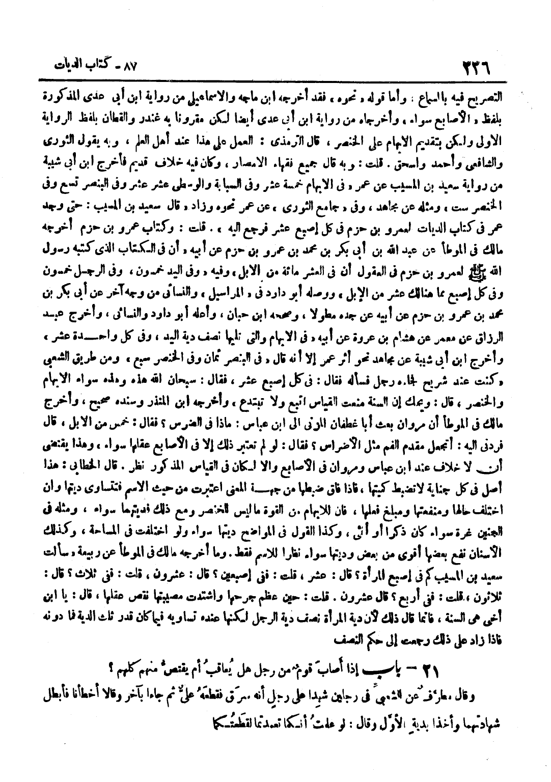 التَّصْرِيحِ فِيهِ بِالسَّمَاعِ وَأَمَّا قَوْلُهُ نَحْوَهُ فَقَدْ أخرجه بن ماجة والإسماعيلي من رِوَايَة بن أَبِي عَدِيٍّ الْمَذْكُورَةِ بِلَفْظِ الْأَصَابِعُ سَوَاءٌ وَأَخْرَجَاهُ من رِوَايَة بن أَبِي عَدِيٍّ أَيْضًا لَكِنْ مَقْرُونًا بِهِ غُنْدَرٌ وَالْقَطَّانُ بِلَفْظِ الرِّوَايَةِ الْأُولَى وَلَكِنْ بِتَقْدِيمِ الْإِبْهَامِ عَلَى الْخِنْصَرِ قَالَ التِّرْمِذِيُّ الْعَمَلُ عَلَى هَذَا عِنْدَ أَهْلِ الْعِلْمِ وَبِهِ يَقُولُ الثَّوْرِيُّ وَالشَّافِعِيُّ وَأَحْمَدُ وَإِسْحَاقُ قُلْتُ وَبِهِ قَالَ جَمِيعُ فُقَهَاءِ الْأَمْصَار وَكَانَ فِيهِ خلاف قديم فَأخْرج بن أَبِي شَيْبَةَ مِنْ رِوَايَةِ سَعِيدِ بْنِ الْمُسَيَّبِ عَنْ عُمَرَ فِي الْإِبْهَامِ خَمْسَةَ عَشَرَ وَفِي السَّبَّابَةِ وَالْوُسْطَى عَشْرٌ عَشْرٌ وَفِي الْبِنْصِرِ تِسْعٌ وَفِي الْخِنْصَرِ سِتٌّ وَمِثْلُهُ عَنْ مُجَاهِدٍ وَفِي جَامِعِ الثَّوْرِيِّ عَنْ عُمَرَ نَحْوَهُ وَزَادَ قَالَ سَعِيدُ بْنُ الْمُسَيَّبِ حَتَّى وَجَدَ عُمَرُ فِي كِتَابِ الدِّيَاتِ لِعَمْرِو بْنِ حَزْمٍ فِي كُلِّ إِصْبَعٍ عَشْرٌ فَرَجَعَ إِلَيْهِ قُلْتُ وَكِتَابُ عَمْرِو بْنِ حَزْمٍ أَخْرَجَهُ مَالِكٌ فِي الْمُوَطَّأِ عَنْ عَبْدِ اللَّهِ بْنِ أَبِي بَكْرِ بْنِ مُحَمَّدِ بْنِ عَمْرِو بْنِ حَزْمٍ عَنْ أَبِيهِ أَنَّ فِي الْكِتَابِ الَّذِي كَتَبَهُ رَسُولُ اللَّهِ صَلَّى اللَّهُ عَلَيْهِ وَسَلَّمَ لِعَمْرِو بْنِ حَزْمٍ فِي الْعُقُول أَن فِي الْعشْر مِائَةً مِنَ الْإِبِلِ وَفِيهِ وَفِي الْيَدِ خَمْسُونَ وَفِي الرِّجْلِ خَمْسُونَ وَفِي كُلِّ إِصْبَعٍ مِمَّا هُنَالِكَ عَشْرٌ مِنَ الْإِبِلِ وَوَصَلَهُ أَبُو دَاوُدَ فِي الْمَرَاسِيلِ وَالنَّسَائِيُّ مِنْ وَجْهٍ آخَرَ عَنْ أَبِي بَكْرِ بْنِ مُحَمَّدِ بْنِ عَمْرِو بْنِ حَزْمٍ عَنْ أَبِيهِ عَنْ جَدِّهِ مُطَوَّلًا وَصَحَّحَهُ بن حِبَّانَ وَأَعَلَّهُ أَبُو دَاوُدَ وَالنَّسَائِيُّ وَأَخْرَجَ عَبْدُ الرَّزَّاقِ عَنْ مَعْمَرٍ عَنْ هِشَامِ بْنِ عُرْوَةَ عَنْ أَبِيهِ فِي الْإِبْهَامِ وَالَّتِي تَلِيهَا نِصْفُ دِيَةِ الْيَدِ وَفِي كُلِّ وَاحِدَةٍ عَشْرٌ وَأَخْرَجَ بن أَبِي شَيْبَةَ عَنْ مُجَاهِدٍ نَحْوَ أَثَرِ عُمَرَ إِلَّا أَنَّهُ قَالَ فِي الْبِنْصِرِ ثَمَانٍ وَفِي الْخِنْصَرِ سَبْعٌ وَمِنْ طَرِيقِ الشَّعْبِيِّ كُنْتُ عِنْدَ شُرَيْحٍ فَجَاءَهُ رَجُلٌ فَسَأَلَهُ فَقَالَ فِي كُلِّ إِصْبَعٍ عَشْرٌ فَقَالَ سُبْحَانَ اللَّهِ هَذِهِ وَهَذِهِ سَوَاءٌ الْإِبْهَامُ وَالْخِنْصَرُ قَالَ وَيْحَكَ إِنَّ السُّنَّةَ منعت الْقيَاس اتبع وَلَا تبتدع وَأخرجه بن الْمُنْذِرِ وَسَنَدُهُ صَحِيحٌ وَأَخْرَجَ مَالِكٌ فِي الْمُوَطَّإِ أَنَّ مَرْوَانَ بَعَثَ أَبَا غَطَفَانَ الْمُزَنِيَّ إِلَى بن عَبَّاسٍ مَاذَا فِي الضِّرْسِ فَقَالَ خَمْسٌ مِنَ الْإِبِلِ قَالَ فَرَدَّنِي إِلَيْهِ أَتَجْعَلُ مُقَدَّمَ الْفَمِ مِثْلَ الْأَضْرَاسِ فَقَالَ لَوْ لَمْ تَعْتَبِرْ ذَلِكَ إِلَّا فِي الْأَصَابِعِ عَقْلُهَا سَوَاءٌ وَهَذَا يَقْتَضِي ان لَا خلاف عِنْد بن عَبَّاسٍ وَمَرْوَانَ فِي الْأَصَابِعِ وَإِلَّا لَكَانَ فِي الْقِيَاسِ الْمَذْكُورِ نَظَرٌ قَالَ الْخَطَّابِيُّ هَذَا أَصْلٌ فِي كُلِّ جِنَايَةٍ لَا تُضْبَطُ كَمِّيَّتُهَا فَإِذَا فَاقَ ضَبْطُهَا مِنْ جِهَةِ الْمَعْنَى اعْتُبِرَتْ مِنْ حَيْثُ الِاسْمُ فَتَتَسَاوَى دِيَتُهَا وَإِنِ اخْتَلَفَ حَالُهَا وَمَنْفَعَتُهَا وَمَبْلَغُ فِعْلِهَا فَإِنَّ لِلْإِبْهَامِ مِنَ الْقُوَّةِ مَا لَيْسَ لِلْخِنْصَرِ وَمَعَ ذَلِكَ فَدِيَتُهُمَا سَوَاءٌ وَمِثْلُهُ فِي الْجَنِينِ غُرَّةٌ سَوَاءٌ كَانَ ذَكَرًا أَو أُنْثَى وَكَذَا القَوْل فِي الْوَاضِح دِيَتهَا سَوَاء وَلَو اخْتلفت فِي الْمِسَاحَة