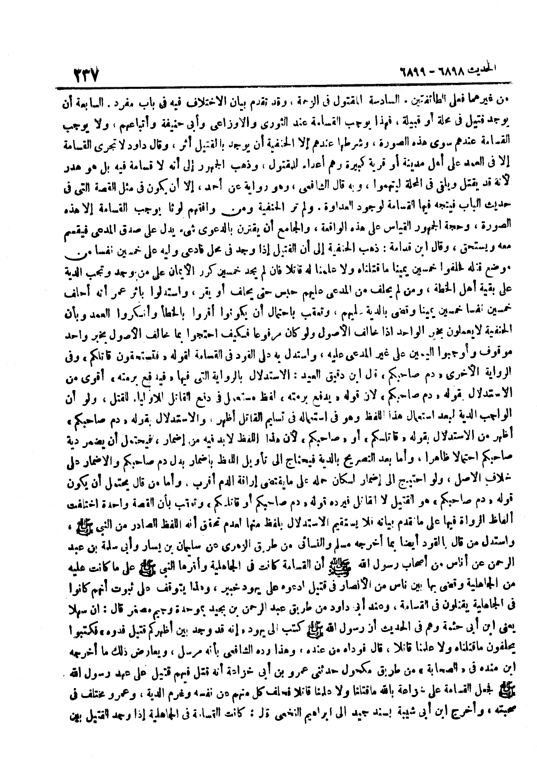 مِنْ غَيْرِهِمَا فَعَلَى الطَّائِفَتَيْنِ السَّادِسَةُ الْمَقْتُولُ فِي الزَّحْمَةِ وَقَدْ تَقَدَّمَ بَيَانُ الِاخْتِلَافِ فِيهِ فِي بَابٍ مُفْرَدٍ السَّابِعَةُ أَنْ يُوجَدَ قَتِيلٌ فِي مَحَلَّةٍ أَوْ قَبِيلَةٍ فَهَذَا يُوجِبُ الْقَسَامَةَ عِنْدَ الثَّوْرِيِّ وَالْأَوْزَاعِيِّ وَأَبِي حَنِيفَةَ وَأَتْبَاعِهِمْ وَلَا يُوجِبُ الْقَسَامَةَ عِنْدَهُمْ سِوَى هَذِهِ الصُّورَةِ وَشَرْطُهَا عِنْدَهُمْ إِلَّا الْحَنَفِيَّةُ أَنْ يُوجَدَ بِالْقَتِيلِ أَثَرٌ وَقَالَ دَاوُدُ لَا تُجْرَى الْقَسَامَةُ إِلَّا فِي الْعَمْدِ عَلَى أَهْلِ مَدِينَةٍ أَوْ قَرْيَةٍ كَبِيرَةٍ وَهُمْ أَعْدَاءٌ لِلْمَقْتُولِ وَذَهَبَ الْجُمْهُورُ إِلَى أَنَّهُ لَا قَسَامَةَ فِيهِ بَلْ هُوَ هَدَرٌ لِأَنَّهُ قَدْ يُقْتَلُ وَيُلْقَى فِي الْمَحَلَّةِ لِيُتَّهَمُوا وَبِهِ قَالَ الشَّافِعِيُّ وَهُوَ رِوَايَةٌ عَنْ أَحْمَدَ إِلَّا أَنْ يَكُونَ فِي مِثْلِ الْقِصَّةِ الَّتِي فِي حَدِيثِ الْبَابِ فَيُتَّجَهُ فِيهَا الْقَسَامَةُ لِوُجُودِ الْعَدَاوَةِ وَلَمْ تَرَ الْحَنَفِيَّةُ وَمَنْ وَافَقَهُمْ لَوْثًا يُوجِبُ الْقَسَامَةَ إِلَّا هَذِهِ الصُّورَةَ وَحُجَّةُ الْجُمْهُورِ الْقِيَاسُ عَلَى هَذِهِ الْوَاقِعَةِ وَالْجَامِعُ أَنْ يَقْتَرِنَ بِالدَّعْوَى شَيْءٌ يَدُلُّ عَلَى صِدْقِ الْمُدَّعَى فَيُقْسِمُ مَعَهُ وَيَسْتَحِقُّ وَقَالَ بن قُدَامَةَ ذَهَبَ الْحَنَفِيَّةُ إِلَى أَنَّ الْقَتِيلَ إِذَا وُجِدَ فِي مَحَلٍّ فَادَّعَى وَلِيُّهُ عَلَى خَمْسِينَ نَفْسًا مِنْ مَوْضِعِ قَتْلِهِ فَحَلَفُوا خَمْسِينَ يَمِينًا مَا قَتَلْنَاهُ وَلَا عَلِمْنَا لَهُ قَاتِلًا فَإِنْ لَمْ يَجِدْ خَمْسِينَ كَرَّرَ الْأَيْمَانَ عَلَى مَنْ وَجَدَ وَتَجِبُ الدِّيَةُ عَلَى بَقِيَّةِ أَهْلِ الْخُطَّةِ وَمَنْ لَمْ يَحْلِفْ مِنَ الْمُدَّعَى عَلَيْهِمْ حُبِسَ حَتَّى يَحْلِفَ أَوْ يُقِرَّ وَاسْتَدَلُّوا بِأَثَرِ عُمَرَ أَنَّهُ أَحْلَفَ خَمْسِينَ نَفْسًا خَمْسِينَ يَمِينًا وَقَضَى بِالدِّيَةِ عَلَيْهِمْ وَتُعُقِّبَ بِاحْتِمَالِ أَنْ يَكُونُوا أَقَرُّوا بِالْخَطَإِ وَأَنْكَرُوا الْعَمْدَ وَبِأَنَّ الْحَنَفِيَّةَ لَا يَعْمَلُونَ بِخَبَرِ الْوَاحِدِ إِذَا خَالَفَ الْأُصُولَ وَلَوْ كَانَ مَرْفُوعًا فَكَيْفَ احْتَجُّوا بِمَا خَالَفَ الْأُصُولَ بِخَبَرِ وَاحِدٍ مَوْقُوفٍ وَأَوْجَبُوا الْيَمِينَ عَلَى غَيْرِ الْمُدَّعَى عَلَيْهِ وَاسْتُدِلَّ بِهِ عَلَى الْقَوَدِ فِي الْقَسَامَةِ لِقَوْلِهِ فَتَسْتَحِقُّونَ قَاتِلَكُمْ وَفِي الرِّوَايَةِ الْأُخْرَى دَمَ صَاحبكُم قَالَ بن دَقِيقِ الْعِيدِ الِاسْتِدْلَالُ بِالرِّوَايَةِ الَّتِي فِيهَا فَيُدْفَعُ بِرُمَّتِهِ أَقْوَى مِنَ الِاسْتِدْلَالِ بِقَوْلِهِ دَمَ صَاحِبِكُمْ لِأَنَّ قَوْلَهُ يُدْفَعُ بِرُمَّتِهِ لَفْظٌ مُسْتَعْمَلٌ فِي دَفْعِ الْقَاتِلِ لِلْأَوْلِيَاءِ لِلْقَتْلِ وَلَوْ أَنَّ الْوَاجِبَ الدِّيَةُ لَبَعُدَ اسْتِعْمَالُ هَذَا اللَّفْظِ وَهُوَ فِي اسْتِعْمَالِهِ فِي تَسْلِيمِ الْقَاتِلِ أَظْهَرُ وَالِاسْتِدْلَالُ بِقَوْلِهِ دَمَ صَاحِبِكُمْ أَظْهَرُ مِنَ الِاسْتِدْلَالِ بِقَوْلِهِ قَاتِلِكُمْ أَوْ صَاحِبِكُمْ لِأَنَّ هَذَا اللَّفْظُ لَا بُدَّ فِيهِ مِنْ إِضْمَارٍ فَيَحْتَمِلُ أَنْ يُضْمَرَ دِيَةُ صَاحِبِكُمْ احْتِمَالًا ظَاهِرًا وَأَمَّا بَعْدَ التَّصْرِيحِ بِالدِّيَةِ فَيَحْتَاجُ إِلَى تَأْوِيلِ اللَّفْظِ بِإِضْمَارٍ بَدَلَ دَمِ صَاحِبِكُمْ وَالْإِضْمَارُ عَلَى خِلَافِ الْأَصْلِ وَلَوِ احْتِيجَ إِلَى إِضْمَارٍ لَكَانَ حَمْلُهُ عَلَى مَا يَقْتَضِي إِرَاقَةَ الدَّمِ أَقْرَبَ وَأَمَّا مَنْ قَالَ يَحْتَمِلُ أَنْ يَكُونَ قَوْلُهُ دَمَ صَاحِبِكُمْ هُوَ الْقَتِيلَ لَا الْقَ