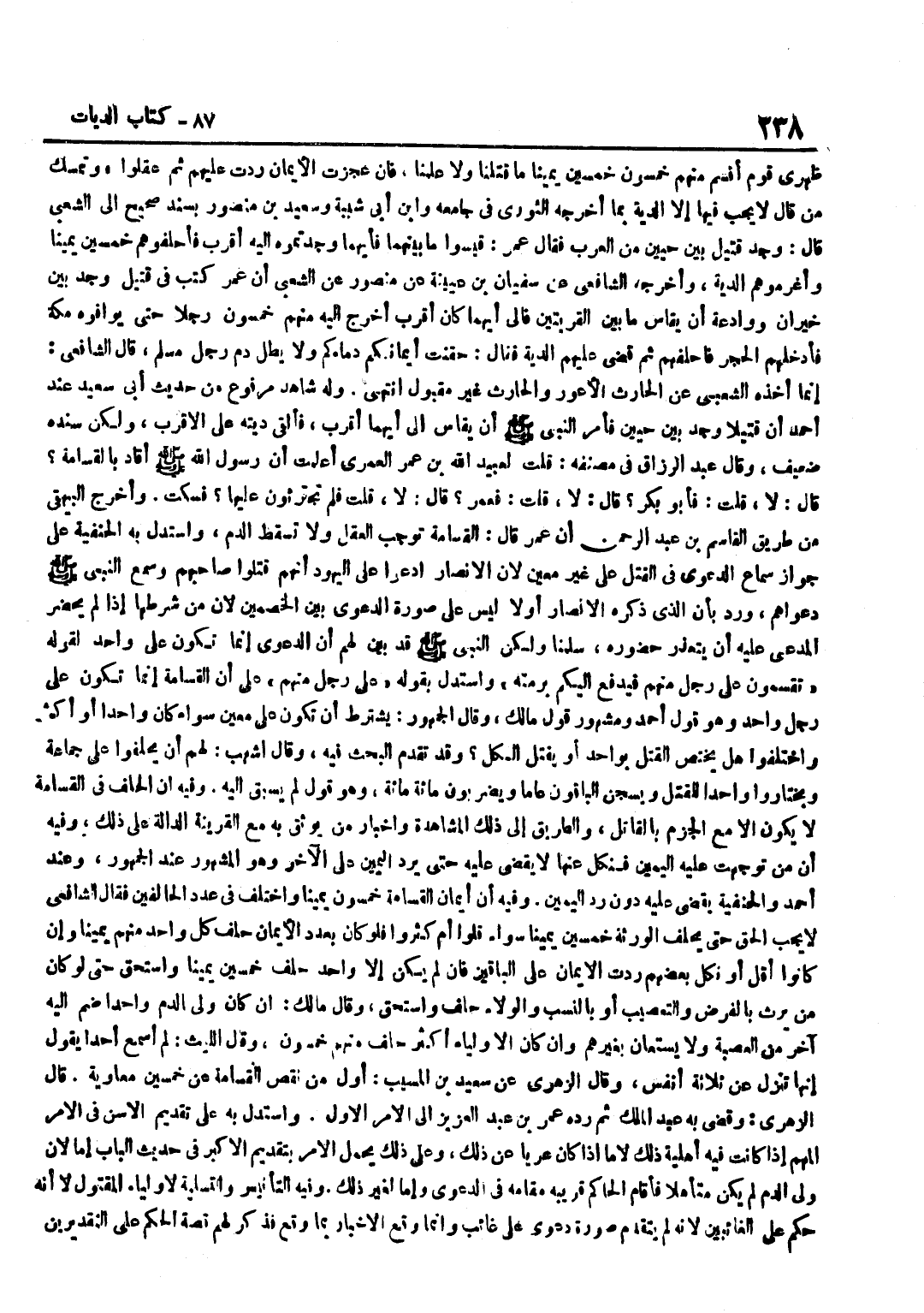 ظَهْري قوم أقسم مِنْهُم خَمْسُونَ خَمْسِينَ يَمِينًا مَا قَتَلْنَا وَلَا عَلِمْنَا فَإِنْ عَجَزَتِ الْأَيْمَانُ رُدَّتْ عَلَيْهِمْ ثُمَّ عَقَلُوا وَتَمَسَّكَ مَنْ قَالَ لَا يَجِبُ فِيهَا إِلَّا الدِّيَةُ بِمَا أخرجه الثَّوْريّ فِي جَامعه وبن أَبِي شَيْبَةَ وَسَعِيدُ بْنُ مَنْصُورٍ بِسَنَدٍ صَحِيحٍ إِلَى الشَّعْبِيِّ قَالَ وُجِدَ قَتِيلٌ بَيْنَ حَيَّيْنِ مِنَ الْعَرَبِ فَقَالَ عُمَرُ قِيسُوا مَا بَيْنَهُمَا فَأَيُّهُمَا وَجَدْتُمُوهُ إِلَيْهِ أَقْرَبَ فَأَحْلِفُوهُمْ خَمْسِينَ يَمِينًا وَأَغْرِمُوهُمُ الدِّيَةَ وَأَخْرَجَهُ الشَّافِعِيُّ عَنْ سُفْيَانَ بْنِ عُيَيْنَةَ عَنْ مَنْصُورٍ عَنْ الشَّعْبِيِّ أَنَّ عُمَرَ كَتَبَ فِي قَتِيلٍ وُجِدَ بَيْنَ خَيْرَانَ وَوَادِعَةَ أَنْ يُقَاسَ مَا بَيْنَ الْقَرْيَتَيْنِ فَإِلَى أَيِّهِمَا كَانَ أَقْرَبَ أُخْرِجَ إِلَيْهِ مِنْهُمْ خَمْسُونَ رَجُلًا حَتَّى يُوَافُوهُ مَكَّةَ فَأَدْخَلَهُمُ الْحِجْرَ فَأَحْلَفَهُمْ ثُمَّ قَضَى عَلَيْهِمُ الدِّيَةَ فَقَالَ حَقَنَتْ أَيْمَانُكُمْ دِمَاءَكُمْ وَلَا يُطَلُّ دَمُ رَجُلٍ مُسْلِمٍ قَالَ الشَّافِعِيُّ إِنَّمَا أَخَذَهُ الشَّعْبِيُّ عَنِ الْحَارِثِ الْأَعْوَرِ وَالْحَارِثُ غَيْرُ مَقْبُولٍ انْتَهَى وَلَهُ شَاهِدٌ مَرْفُوعٌ مِنْ حَدِيثِ أَبِي سَعِيدٍ عِنْدَ أَحْمَدَ أَنَّ قَتِيلًا وُجِدَ بَيْنَ حَيَّيْنِ فَأَمَرَ النَّبِيُّ صَلَّى اللَّهُ عَلَيْهِ وَسَلَّمَ أَنْ يُقَاسَ إِلَى أَيِّهِمَا أَقْرَبُ فَأَلْقَى دِيَتَهُ عَلَى الْأَقْرَبِ وَلَكِنَّ سَنَدَهُ ضَعِيفٌ وَقَالَ عَبْدُ الرَّزَّاقِ فِي مُصَنَّفِهِ قُلْتُ لِعُبَيْدِ اللَّهِ بْنِ عُمَرَ الْعُمَرِيِّ أَعَلِمْتَ أَنَّ رَسُولَ اللَّهِ صَلَّى اللَّهُ عَلَيْهِ وَسَلَّمَ أَقَادَ بِالْقَسَامَةِ قَالَ لَا قلت فَأَبُو بكر قَالَ لاقلت فَعُمَرُ قَالَ لَا قُلْتُ فَلِمَ تَجْتَرِئُونَ عَلَيْهَا فَسَكَتَ وَأَخْرَجَ الْبَيْهَقِيُّ مِنْ طَرِيقِ الْقَاسِمِ بْنِ عَبْدِ الرَّحْمَنِ أَنَّ عُمَرَ قَالَ الْقَسَامَةُ تُوجِبُ الْعَقْلَ وَلَا تُسْقِطُ الدَّمَ وَاسْتَدَلَّ بِهِ الْحَنَفِيَّةُ عَلَى جَوَازِ سَمَاعِ الدَّعْوَى فِي الْقَتْلِ عَلَى غَيْرِ مُعَيَّنٍ لِأَنَّ الْأَنْصَارَ ادَّعَوْا عَلَى الْيَهُودِ أَنَّهُمْ قَتَلُوا صَاحِبَهُمْ وَسَمِعَ النَّبِيُّ صَلَّى اللَّهُ عَلَيْهِ وَسَلَّمَ دَعْوَاهُمْ وَرُدَّ بِأَنَّ الَّذِي ذَكَرَهُ الْأَنْصَارُ أَوَّلًا لَيْسَ عَلَى صُورَةِ الدَّعْوَى بَيْنَ الْخَصْمَيْنِ لِأَنَّ مِنْ شَرْطِهَا إِذَا لَمْ يَحْضُرِ الْمُدَّعَى عَلَيْهِ أَنْ يَتَعَذَّرَ حُضُورُهُ سَلَّمْنَا وَلَكِنَّ النَّبِيَّ صَلَّى اللَّهُ عَلَيْهِ وَسَلَّمَ قَدْ بَيَّنَ لَهُمْ أَنَّ الدَّعْوَى إِنَّمَا تَكُونُ عَلَى وَاحِدٍ لِقَوْلِهِ تُقْسِمُونَ عَلَى رَجُلٍ مِنْهُمْ فَيُدْفَعُ إِلَيْكُمْ بِرُمَّتِهِ وَاسْتُدِلَّ بِقَوْلِهِ عَلَى رَجُلٍ مِنْهُمْ عَلَى أَنَّ الْقَسَامَةَ إِنَّمَا تَكُونُ عَلَى رَجُلٍ وَاحِدٍ وَهُوَ قَوْلُ أَحْمَدَ وَمَشْهُورٌ قَوْلُ مَالِكٍ وَقَالَ الْجُمْهُورُ يُشْتَرَطُ أَنْ تَكُونَ عَلَى مُعَيَّنٍ سَوَاءٌ كَانَ وَاحِدًا أَوْ أَكْثَرَ وَاخْتَلَفُوا هَلْ يَخْتَصُّ الْقَتْلُ بِوَاحِدٍ أَوْ يُقْتَلُ الْكُلُّ وَقَدْ تَقَدَّمَ الْبَحْثُ فِيهِ وَقَالَ أَشْهَبُ لَهُمْ أَنْ يَحْلِفُوا عَلَى جَمَاعَةٍ وَيَخْتَارُوا وَاحِدًا لِلْقَتْلِ وَيُسْجَنُ الْبَاقُونَ عَامًا وَيُضْرَبُونَ مِائَةً مِائَةً وَهُوَ قَوْلٌ لَمْ يُسْبَقْ إِلَيْهِ وَفِيهِ أَنَّ الْحَلِفَ فِي الْقَسَامَةِ لَا يَكُونُ إِلَّا مَعَ الْجَزْمِ بِالْقَاتِلِ وَالطَّرِيقُ إِلَى ذَلِكَ الْمُشَاهَدَةُ وَإِخْبَارُ مَنْ يُوثَقُ بِهِ مَعَ الْقَرِينَةِ الدَّالَّةِ