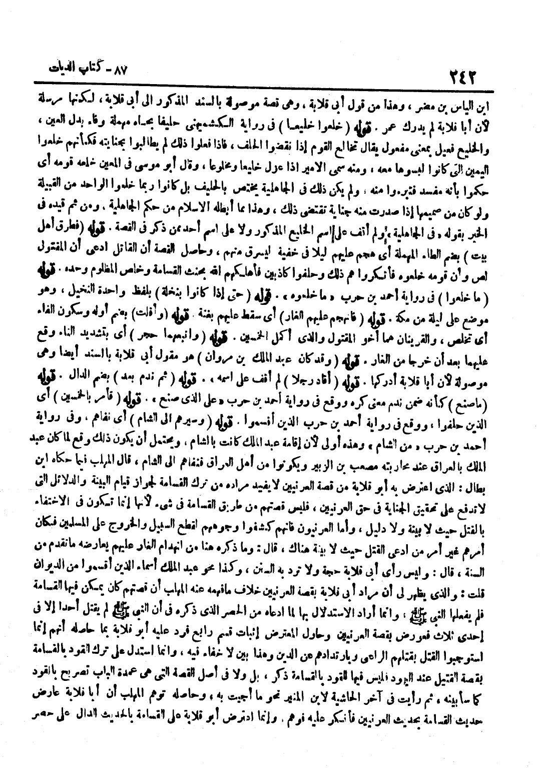 بْنِ إِلْيَاسَ بْنِ مُضَرَ وَهَذَا مِنْ قَوْلِ أَبِي قِلَابَةَ وَهِيَ قِصَّةٌ مَوْصُولَةٌ بِالسَّنَدِ الْمَذْكُورِ إِلَى أَبِي قِلَابَةَ لَكِنَّهَا مُرْسَلَةٌ لِأَنَّ أَبَا قِلَابَةَ لَمْ يُدْرِكْ عُمَرَ قَوْلُهُ خَلَعُوا خَلِيعًا فِي رِوَايَةِ الْكُشْمِيهَنِيِّ حَلِيفًا بِحَاءٍ مُهْمَلَةٍ وَفَاءٍ بَدَلَ الْعَيْنِ وَالْخَلِيعُ فَعِيلٌ بِمَعْنَى مَفْعُولٍ يُقَالُ تَخَالَعَ الْقَوْمُ إِذَا نَقَضُوا الْحِلْفَ فَإِذَا فَعَلُوا ذَلِكَ لَمْ يُطَالَبُوا بِجِنَايَتِهِ فَكَأَنَّهُمْ خَلَعُوا الْيَمِينَ الَّتِي كَانُوا لَبِسُوهَا مَعَهُ وَمِنْهُ سُمِّيَ الْأَمِيرُ إِذَا عُزِلَ خَلِيعًا وَمَخْلُوعًا وَقَالَ أَبُو مُوسَى فِي الْمُعِينِ خَلَعَهُ قَوْمُهُ أَيْ حَكَمُوا بِأَنَّهُ مُفْسِدٌ فَتَبَرَّءُوا مِنْهُ وَلَمْ يَكُنْ ذَلِكَ فِي الْجَاهِلِيَّةِ يَخْتَصُّ بِالْحَلِيفِ بَلْ كَانُوا رُبَّمَا خَلَعُوا الْوَاحِدَ مِنَ الْقَبِيلَةِ وَلَوْ كَانَ مِنْ صَمِيمِهَا إِذَا صَدَرَتْ مِنْهُ جِنَايَةٌ تَقْتَضِي ذَلِكَ وَهَذَا مِمَّا أَبْطَلَهُ الْإِسْلَامُ مِنْ حُكْمِ الْجَاهِلِيَّةِ وَمِنْ ثَمَّ قَيَّدَهُ فِي الْخَبَرِ بِقَوْلِهِ فِي الْجَاهِلِيَّةِ وَلَمْ أَقِفْ عَلَى اسْمِ الْخَلِيعِ الْمَذْكُورِ وَلَا عَلَى اسْمِ أَحَدٍ مِمَّنْ ذُكِرَ فِي الْقِصَّةِ قَوْلُهُ فَطَرَقَ أَهْلَ بَيْتٍ بِضَمِّ الطَّاءِ الْمُهْمَلَةِ أَيْ هَجَمَ عَلَيْهِمْ لَيْلًا فِي خُفْيَةٍ لِيَسْرِقَ مِنْهُمْ وَحَاصِلُ الْقِصَّةِ أَنَّ الْقَاتِلَ ادَّعَى أَنَّ الْمَقْتُولَ لِصٌّ وَأَنَّ قَوْمَهُ خَلَعُوهُ فَأَنْكَرُوا هُمْ ذَلِكَ وَحَلَفُوا كَاذِبِينَ فَأَهْلَكَهُمُ اللَّهُ بِحِنْثِ الْقَسَامَةِ وَخَلَّصَ الْمَظْلُومَ وَحْدَهُ قَوْلُهُ مَا خَلَعُوا فِي رِوَايَةِ أَحْمَدَ بْنِ حَرْبٍ مَا خَلَعُوهُ قَوْلُهُ حَتَّى إِذَا كَانُوا بِنَخْلَةَ بِلَفْظِ وَاحِدَةِ النَّخِيلِ وَهُوَ مَوْضِعٌ عَلَى لَيْلَةٍ مِنْ مَكَّةَ قَوْلُهُ فَانْهَجَمَ عَلَيْهِمُ الْغَارُ أَيْ سَقَطَ عَلَيْهِمْ بَغْتَةً قَوْلُهُ وَأُفْلِتَ بِضَمِّ أَوَّلِهِ وَسُكُونِ الْفَاءِ أَيْ تَخَلَّصَ وَالْقَرِينَانِ هُمَا أَخُو الْمَقْتُولِ وَالَّذِي أَكْمَلَ الْخَمْسِينَ قَوْلُهُ وَاتَّبَعَهُمَا حَجَرٌ أَيْ بِتَشْدِيدِ التَّاءِ وَقَعَ عَلَيْهِمَا بَعْدَ أَنْ خَرَجَا مِنَ الْغَارِ قَوْلُهُ وَقَدْ كَانَ عَبْدُ الْمَلِكِ بْنُ مَرْوَانَ هُوَ مَقُولُ أَبِي قِلَابَةَ بِالسَّنَدِ أَيْضًا وَهِيَ مَوْصُولَةٌ لِأَنَّ أَبَا قِلَابَةَ أَدْرَكَهَا قَوْلُهُ أَقَادَ رَجُلًا لَمْ أَقِفْ عَلَى اسْمِهِ قَوْلُهُ ثُمَّ نَدِمَ بَعْدُ بِضَمِّ الدَّالِ قَوْلُهُ مَا صَنَعَ كَأَنَّهُ ضَمَّنَ نَدِمَ مَعْنَى كَرِهَ وَوَقَعَ فِي رِوَايَةِ أَحْمَدَ بْنِ حَرْبٍ عَلَى الَّذِي صَنَعَ قَوْلُهُ فَأَمَرَ بِالْخَمْسِينَ أَيِ الَّذِينَ حَلَفُوا وَوَقَعَ فِي رِوَايَةِ أَحْمَدَ بْنِ حَرْبٍ الَّذِينَ أَقْسَمُوا قَوْلُهُ وَسَيَّرَهُمْ إِلَى الشَّامِ أَيْ نَفَاهُمْ وَفِي رِوَايَةِ أَحْمَدَ بْنِ حَرْبٍ مِنَ الشَّامِ وَهَذِهِ أَوْلَى لِأَنَّ إِقَامَةَ عَبْدِ الْمَلِكِ كَانَتْ بِالشَّامِ وَيَحْتَمِلُ أَنْ يَكُونَ ذَلِكَ وَقَعَ لَمَّا كَانَ عَبْدُ الْمَلِكِ بِالْعِرَاقِ عِنْدَ مُحَارَبَتِهِ مُصْعَبَ بْنَ الزُّبَيْرِ وَيَكُونُوا مِنْ أَهْلِ الْعِرَاقِ فَنَفَاهُمْ إِلَى الشَّام قَالَ الْمُهلب فِيمَا حَكَاهُ بن بَطَّالٍ الَّذِي اعْتَرَضَ بِهِ أَبُو قِلَابَةَ مِنْ قِصَّةِ الْعُرَنِيِّينَ لَا يُفِيدُ مُرَادَهُ مِنْ تَرْكِ الْقَسَامَةِ لِجَوَازِ قِيَامِ الْبَيِّنَةِ وَالدَّلَائِلِ الَّتِي لَا تُدْفَعُ عَلَى تَحْقِيقِ الْجِنَايَةِ فِي حَقِّ الْعُرَنِيِّينَ فَلَيْسَ قِصَّتُهُمْ مِنْ طَر