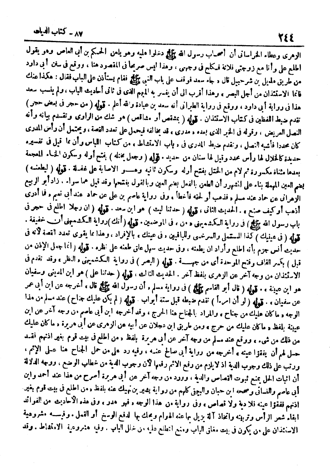الزُّهْرِيّ وَعَطَاء الخرساني أَنَّ أَصْحَابَ رَسُولِ اللَّهِ صَلَّى اللَّهُ عَلَيْهِ وَسَلَّمَ دَخَلُوا عَلَيْهِ وَهُوَ يَلْعَنُ الْحَكَمَ بْنَ أَبِي الْعَاصِ وَهُوَ يَقُولُ اطَّلَعَ عَلَيَّ وَأَنَا مَعَ زَوْجَتِي فُلَانَةَ فَكَلَحَ فِي وَجْهِي وَهَذَا لَيْسَ صَرِيحًا فِي الْمَقْصُودِ هُنَا وَوَقَعَ فِي سُنَنِ أَبِي دَاوُدَ مِنْ طَرِيقِ هُذَيْلِ بْنِ شُرَحْبِيلَ قَالَ جَاءَ سَعْدٌ فَوَقَفَ عَلَى بَابِ النَّبِيِّ صَلَّى اللَّهُ عَلَيْهِ وَسَلَّمَ فَقَامَ يَسْتَأْذِنُ عَلَى الْبَابِ فَقَالَ هَكَذَا عَنْكَ فَإِنَّمَا الِاسْتِئْذَانُ مِنْ أَجْلِ الْبَصَرِ وَهَذَا أَقْرَبُ إِلَى أَنْ يُفَسَّرَ بِهِ الْمُبْهَمُ الَّذِي فِي ثَانِي أَحَادِيثِ الْبَابِ وَلَمْ يَنْسِبْ سَعْدٌ هَذَا فِي رِوَايَةِ أَبِي دَاوُدَ وَوَقَعَ فِي رِوَايَةِ الطَّبَرَانِيِّ أَنَّهُ سَعْدُ بْنُ عُبَادَةَ وَاللَّهُ أَعْلَمُ قَوْلُهُ مِنْ حجر فِي بعض حجر تقدم ضبط اللَّفْظَيْنِ فِي كِتَابِ الِاسْتِئْذَانِ قَوْلُهُ بِمِشْقَصٍ أَوْ مَشَاقِصَ هُوَ شَكٌّ مِنَ الرَّاوِي وَتَقَدَّمَ بَيَانُهُ وَأَنَّهُ النَّصْلُ الْعَرِيضُ وَقَوْلُهُ فِي الْخَبَرِ الَّذِي بَعْدَهُ مِدْرًى قَدْ يُخَالِفُهُ فَيُحْمَلُ عَلَى تَعَدُّدِ الْقِصَّةِ وَيَحْتَمِلُ أَنَّ رَأْسَ الْمِدْرَى كَانَ مُحَدَّدًا فَأَشْبَهَ النَّصْلَ وَتَقَدَّمَ ضَبْطُ الْمِدْرَى فِي بَابِ الِامْتِشَاطِ مِنْ كِتَابِ اللِّبَاسِ وَأَنَّ مِمَّا قِيلَ فِي تَفْسِيرِهِ حَدِيدَةً كَالْخِلَالِ لَهَا رَأْسٌ مُحَدَّدٌ وَقِيلَ لَهَا سِنَّانِ مِنْ حَدِيدٍ قَوْلُهُ وَجَعَلَ يَخْتِلُهُ بِفَتْحِ أَوَّلِهِ وَسُكُونِ الْخَاءِ الْمُعْجَمَةِ بَعْدَهَا مُثَنَّاةٌ مَكْسُورَةٌ ثُمَّ لَامٌ مِنَ الْخَتْلِ بِفَتْحِ أَوَّلِهِ وَسُكُونِ ثَانِيهِ وَهُوَ الْإِصَابَةُ عَلَى غَفْلَةٍ قَوْلُهُ لِيَطْعُنَهُ بِضَمِّ الْعَيْنِ الْمُهْمَلَةِ بِنَاءً عَلَى الْمَشْهُورِ أَنَّ الطَّعْنَ بِالْفِعْلِ بِضَمِّ الْعَيْنِ وَبِالْقَوْلِ بِفَتْحِهَا وَقَدْ قِيلَ هُمَا سَوَاءٌ زَادَ أَبُو الرَّبِيعِ الزَّهْرَانِيُّ عَنْ حَمَّادٍ عِنْدَ مُسْلِمٍ فَذَهَبَ أَوْ لَحِقَهُ فَأَخْطَأَ وَفِي رِوَايَةِ عَاصِمِ بْنِ عَلِيٍّ عَنْ حَمَّادٍ عِنْدَ أَبِي نُعَيْمٍ فَمَا أَدْرِي أذهب أَو كَيفَ صنع الحَدِيث الثَّانِي
