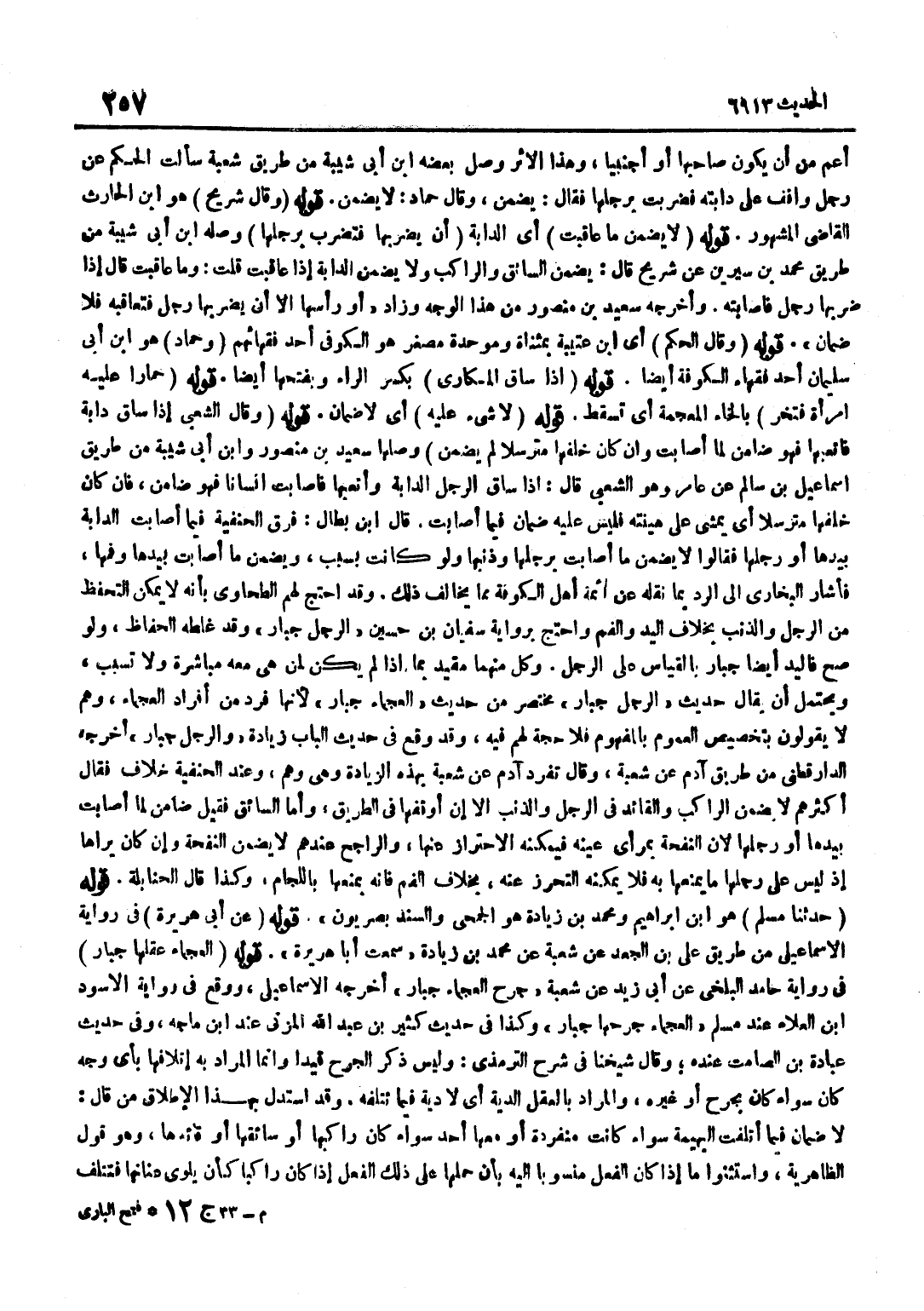 أَعَمُّ مِنْ أَنْ يَكُونَ صَاحِبُهَا أَوْ أَجْنَبِيًّا وَهَذَا الْأَثر وصل بعضه بن أَبِي شَيْبَةَ مِنْ طَرِيقِ شُعْبَةَ سَأَلْتُ الْحَكَمَ عَنْ رَجُلٍ وَاقِفٍ عَلَى دَابَّتِهِ فَضَرَبَتْ بِرِجْلِهَا فَقَالَ يَضْمَنُ وَقَالَ حَمَّادٌ لَا يَضْمَنُ قَوْلُهُ وَقَالَ شُرَيْح هُوَ بن الْحَارِثِ الْقَاضِي الْمَشْهُورُ قَوْلُهُ لَا يَضْمَنُ مَا عَاقَبَتْ أَيِ الدَّابَّةُ أَنْ يَضْرِبَهَا فَتَضْرِبَ بِرِجْلِهَا وَصله بن أَبِي شَيْبَةَ مِنْ طَرِيقِ مُحَمَّدِ بْنِ سِيرِينَ عَنْ شُرَيْحٍ قَالَ يَضْمَنُ السَّائِقَ وَالرَّاكِبَ وَلَا يَضْمَنُ الدَّابَّةَ إِذَا عَاقَبَتْ قُلْتُ وَمَا عَاقَبَتْ قَالَ إِذَا ضَرَبَهَا رَجُلٌ فَأَصَابَتْهُ وَأَخْرَجَهُ سَعِيدُ بْنُ مَنْصُورٍ مِنْ هَذَا الْوَجْهِ وَزَادَ أَوْ رَأْسُهَا إِلَّا أَنْ يَضْرِبَهَا رَجُلٌ فَتُعَاقِبَهُ فَلَا ضَمَان قَوْله وَقَالَ الحكم أَي بن عُتَيْبَةَ بِمُثَنَّاةٍ وَمُوَحَّدَةٍ مُصَغَّرٌ هُوَ الْكُوفِيُّ أَحَدُ فقهائهم وَحَمَّاد هُوَ بن أَبِي سُلَيْمَانَ أَحَدُ فُقَهَاءِ الْكُوفَةِ أَيْضًا قَوْلُهُ إِذَا سَاقَ الْمُكَارِي بِكَسْرِ الرَّاءِ وَبِفَتْحِهَا أَيْضًا قَوْلُهُ حِمَارًا عَلَيْهِ امْرَأَةٌ فَتَخِرُّ بِالْخَاءِ الْمُعْجَمَةٌ أَيْ تَسْقُطُ قَوْلُهُ لَا شَيْءَ عَلَيْهِ أَيْ لَا ضَمَانَ قَوْلُهُ وَقَالَ الشَّعْبِيُّ إِذَا سَاقَ دَابَّةً فَأَتْعَبَهَا فَهُوَ ضَامِنٌ لِمَا أَصَابَتْ وَإِنْ كَانَ خَلْفَهَا مُتَرَسِّلًا لَمْ يَضْمَنْ وَصَلَهَا سَعِيدُ بن مَنْصُور وبن أَبِي شَيْبَةَ مِنْ طَرِيقِ إِسْمَاعِيلَ بْنِ سَالِمٍ عَنْ عَامِرٍ وَهُوَ الشَّعْبِيُّ قَالَ إِذَا سَاقَ الرَّجُلُ الدَّابَّةَ وَأَتْعَبَهَا فَأَصَابَتْ إِنْسَانًا فَهُوَ ضَامِنٌ فَإِنْ كَانَ خَلْفَهَا مُتَرَسِّلًا أَيْ يَمْشِي عَلَى هِينَتِهِ فَلَيْسَ عَلَيْهِ ضَمَانٌ فِيمَا أَصَابَتْ قَالَ بن بَطَّالٍ فَرَّقَ الْحَنَفِيَّةُ فِيمَا أَصَابَتِ الدَّابَّةُ بِيَدِهَا أَوْ رِجْلِهَا فَقَالُوا لَا يَضْمَنُ مَا أَصَابَتْ بِرِجْلِهَا وَذَنَبِهَا وَلَوْ كَانَتْ بِسَبَبٍ وَيَضْمَنُ مَا أَصَابَتْ بِيَدِهَا وَفَمِهَا فَأَشَارَ الْبُخَارِيُّ إِلَى الرَّدِّ بِمَا نَقَلَهُ عَنْ أَئِمَّةِ أَهْلِ الْكُوفَةِ مِمَّا يُخَالِفُ ذَلِكَ وَقَدِ احْتَجَّ لَهُمُ الطَّحَاوِيُّ بِأَنَّهُ لَا يُمْكِنُ التَّحَفُّظُ مِنَ الرِّجْلِ وَالذَّنَبِ بِخِلَافِ الْيَدِ وَالْفَمِ وَاحْتَجَّ بِرِوَايَةِ سُفْيَانَ بْنِ حُسَيْنٍ الرِّجْلُ جُبَارٌ وَقَدْ غَلَّطَهُ الْحُفَّاظُ وَلَوْ صَحَّ فَالْيَدُ أَيْضًا جُبَارٌ بِالْقِيَاسِ عَلَى الرِّجْلِ وَكُلٌّ مِنْهُمَا مُقَيَّدٌ بِمَا إِذَا لَمْ يَكُنْ لِمَنْ هِيَ مَعَهُ مُبَاشَرَةٌ وَلَا تَسَبُّبٌ وَيَحْتَمِلُ أَنْ يُقَالَ حَدِيثُ الرِّجْلُ جُبَارٌ مُخْتَصَرٌ مِنْ حَدِيثِ الْعَجْمَاءِ جُبَارٌ لِأَنَّهَا فَرْدٌ مِنْ أَفْرَادِ الْعَجْمَاءِ وَهُمْ لَا يَقُولُونَ بِتَخْصِيصِ الْعُمُومِ بِالْمَفْهُومِ فَلَا حُجَّةَ لَهُمْ فِيهِ وَقَدْ وَقَعَ فِي حَدِيثِ الْبَابِ زِيَادَةٌ وَالرِّجْلُ جُبَارٌ أَخْرَجَهُ الدَّارَقُطْنِيُّ مِنْ طَرِيقِ آدَمَ عَنْ شُعْبَةَ وَقَالَ تَفَرَّدَ آدَمُ عَنْ شُعْبَةَ بِهَذِهِ الزِّيَادَةِ وَهِيَ وَهْمٌ وَعِنْدَ الْحَنَفِيَّةِ خِلَافٌ فَقَالَ أَكْثَرُهُمْ لَا يَضْمَنُ الرَّاكِبُ وَالْقَائِدُ فِي الرِّجْلِ وَالذَّنَبِ إِلَّا إِنْ أَوْقَفَهَا فِي الطَّرِيقِ وَأَمَّا السَّائِقُ فَقِيلَ ضَامِنٌ لِمَا أَصَابَتْ بِيَدِهَا أَوْ رِجْلِهَا لِأَنَّ النَّفْحَةَ بِمَرْأَى عَيْنِهِ فَيُمْكِنُهُ الِاحْتِرَازُ عَنْهَا وَالرَّاجِحُ عِنْدَهُمْ لَا يَضْمَنُ النَّفْحَةَ وَإِنْ كَانَ يَرَاهَا إِذْ لَيْسَ عَلَى رِجْلِهَا مَا يَمْن