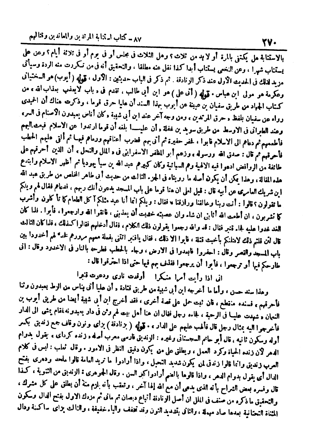 بِالِاسْتِتَابَةِ هَلْ يُكْتَفَى بِالْمَرَّةِ أَوْ لَا بُدَّ مِنْ ثَلَاثٍ وَهَلِ الثَّلَاثُ فِي مَجْلِسٍ أَوْ فِي يَوْمٍ أَوْ فِي ثَلَاثَةِ أَيَّامٍ وَعَنْ عَلِيٍّ يُسْتَتَابُ شَهْرًا وَعَنِ النَّخَعِيِّ يُسْتَتَابُ أَبَدًا كَذَا نُقِلَ عَنْهُ مُطْلَقًا وَالتَّحْقِيقُ أَنَّهُ فِي مَنْ تَكَرَّرَتْ مِنْهُ الرِّدَّةُ وَسَيَأْتِي مَزِيدٌ لِذَلِكَ فِي الْحَدِيثِ الْأَوَّلِ عِنْدَ ذِكْرِ الزَّنَادِقَةِ ثُمَّ ذَكَرَ فِي الْبَابِ حَدِيثَيْنِ الْأَوَّلُ قَوْلُهُ أَيُّوبُ هُوَ السَّخْتِيَانِيُّ وَعِكْرِمَةُ هُوَ مَوْلَى بن عَبَّاس قَوْله أَتَى عَليّ هُوَ بن أَبِي طَالِبٍ تَقَدَّمَ فِي بَابِ لَا يُعَذَّبُ بِعَذَابِ اللَّهِ مِنْ كِتَابِ الْجِهَادِ مِنْ طَرِيقِ سُفْيَانَ بْنِ عُيَيْنَةَ عَنْ أَيُّوبَ بِهَذَا السَّنَدِ أَنَّ عَلِيًّا حَرَّقَ قَوْمًا وَذَكَرْتُ هُنَاكَ أَنَّ الْحُمَيْدِيَّ رَوَاهُ عَنْ سُفْيَانَ بِلَفْظِ حَرَّقَ الْمُرْتَدِّينَ وَمن وَجه آخر عِنْد بن أَبِي شَيْبَةَ كَانَ أُنَاسٌ يَعْبُدُونَ الْأَصْنَامَ فِي السِّرِّ وَعِنْدَ الطَّبَرَانِيُّ فِي الْأَوْسَطِ مِنْ طَرِيقِ سُوَيْدِ بْنِ غَفَلَةَ أَنَّ عَلِيًّا بَلَغَهُ أَنَّ قَوْمًا ارْتَدُّوا عَنِ الْإِسْلَامِ فَبَعَثَ إِلَيْهِمْ فَأَطْعَمَهُمْ ثُمَّ دَعَاهُمْ إِلَى الْإِسْلَامِ فَأَبَوْا فَحَفَرَ حَفِيرَةً ثُمَّ أَتَى بِهِمْ فَضَرَبَ أَعْنَاقَهُمْ وَرَمَاهُمْ فِيهَا ثُمَّ أَلْقَى عَلَيْهِمُ الْحَطَبَ فَأَحْرَقَهُمْ ثُمَّ قَالَ صَدَقَ اللَّهُ وَرَسُولُهُ وَزَعَمَ أَبُو الْمُظَفَّرِ الْإِسْفَرَايِنِيُّ فِي الْمِلَلِ وَالنِّحَلِ أَنَّ الَّذِينَ أَحْرَقَهُمْ عَلِيٌّ طَائِفَةٌ مِنَ الرَّوَافِضِ ادَّعَوْا فِيهِ الْإِلَهِيَّةَ وَهُمُ السَّبَائِيَّةُ وَكَانَ كَبِيرُهُمْ عَبْدُ اللَّهِ بْنُ سَبَأٍ يَهُودِيًّا ثُمَّ أَظْهَرَ الْإِسْلَامَ وَابْتَدَعَ هَذِهِ الْمَقَالَةَ وَهَذَا يُمْكِنُ أَنْ يَكُونَ أَصْلُهُ مَا رُوِّينَاهُ فِي الْجُزْءِ الثَّالِثِ مِنْ حَدِيثِ أَبِي طَاهِرٍ الْمُخَلِّصِ مِنْ طَرِيقِ عَبْدِ اللَّهِ بْنِ شَرِيكٍ الْعَامِرِيِّ عَنْ أَبِيهِ قَالَ قِيلَ لِعَلِيٍّ إِنَّ هُنَا قَوْمًا عَلَى بَابِ الْمَسْجِدِ يَدَّعُونَ أَنَّكَ رَبَّهُمْ فَدَعَاهُمْ فَقَالَ لَهُمْ وَيْلَكُمْ مَا تَقُولُونَ قَالُوا أَنْتَ رَبُّنَا وَخَالِقُنَا وَرَازِقُنَا فَقَالَ وَيْلَكُمْ إِنَّمَا أَنَا عَبْدٌ مِثْلُكُمْ آكُلُ الطَّعَامَ كَمَا تَأْكُلُونَ وَأَشْرَبُ كَمَا تَشْرَبُونَ إِنْ أَطَعْتُ اللَّهَ أَثَابَنِي إِنْ شَاءَ وَإِنْ عَصَيْتُهُ خَشِيتُ أَنْ يُعَذِّبَنِي فَاتَّقُوا اللَّهَ وَارْجِعُوا فَأَبَوْا فَلَمَّا كَانَ الْغَدُ غَدَوْا عَلَيْهِ فَجَاءَ قَنْبَرٌ فَقَالَ قَدْ وَاللَّهِ رَجَعُوا يَقُولُونَ ذَلِكَ الْكَلَامَ فَقَالَ أَدْخِلْهُمْ فَقَالُوا كَذَلِكَ فَلَمَّا كَانَ الثَّالِثُ قَالَ لَئِنْ قُلْتُمْ ذَلِكَ لَأَقْتُلَنَّكُمْ بِأَخْبَثِ قِتْلَةٍ فَأَبَوْا إِلَّا ذَلِكَ فَقَالَ يَا قَنْبَرُ ائْتِنِي بِفَعْلَةٍ مَعَهُمْ مرورهم فَخُدَّ لَهُمْ أُخْدُودًا بَيْنَ بَابِ الْمَسْجِدِ وَالْقَصْرِ وَقَالَ احْفِرُوا فَأَبْعِدُوا فِي الْأَرْضِ وَجَاءَ بِالْحَطَبِ فَطَرَحَهُ بِالنَّارِ فِي الْأُخْدُودِ وَقَالَ إِنِّي طَارِحُكُمْ فِيهَا أَوْ تَرْجِعُوا فَأَبَوْا أَنْ يَرْجِعُوا فَقَذَفَ بِهِمْ فِيهَا حَتَّى إِذَا احْتَرَقُوا قَالَ إِنِّي إِذَا رَأَيْتُ أَمْرًا مُنْكَرًا أَوْقَدْتُ نَارِي وَدَعَوْتُ قَنْبَرَا وَهَذَا سَنَدٌ حَسَنٌ وَأَمَّا مَا أَخْرَجَهُ بن أَبِي شَيْبَةَ مِنْ طَرِيقِ قَتَادَةَ أَنَّ عَلِيًّا أُتِيَ بِنَاسٍ مِنَ الزُّطِّ يَعْبُدُونَ وَثَنًا فَأَحْرَقَهُمْ فَسَنَدُهُ مُنْقَطِعٌ فَإِنْ ثَبَتَ حُمِلَ عَ