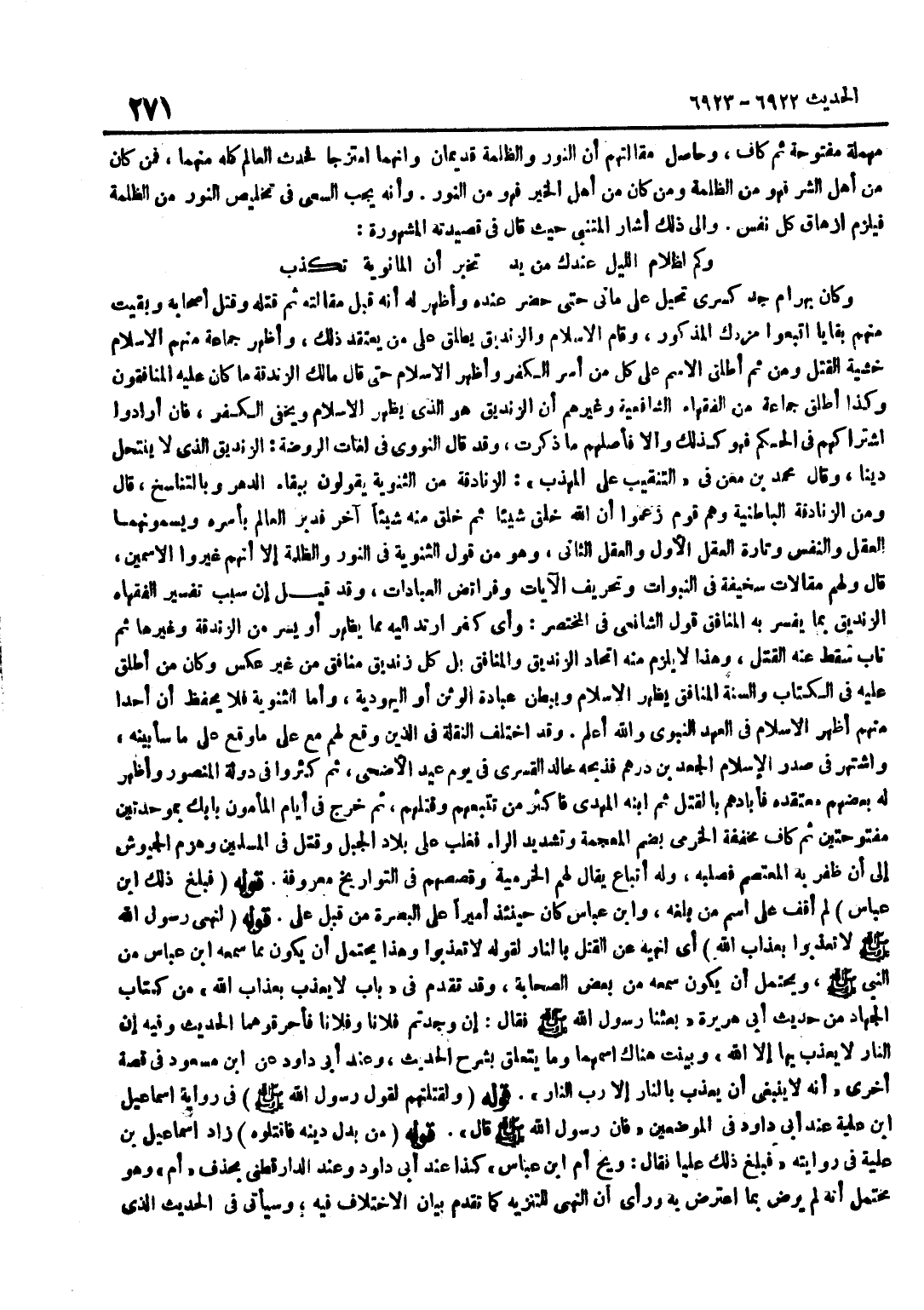 مُهْمَلَةٍ مَفْتُوحَةٍ ثُمَّ كَافٍ وَحَاصِلُ مَقَالَتِهِمْ أَنَّ النُّورَ وَالظُّلْمَةَ قَدِيمَانِ وَأَنَّهُمَا امْتَزَجَا فَحَدَثَ الْعَالَمُ كُلُّهُ مِنْهُمَا فَمَنْ كَانَ مِنْ أَهْلِ الشَّرِّ فَهُوَ مِنَ الظُّلْمَةِ وَمَنْ كَانَ مِنْ أَهْلِ الْخَيْرِ فَهُوَ مِنَ النُّورِ وَأَنَّهُ يَجِبُ السَّعْيُ فِي تَخْلِيصِ النُّورِ مِنَ الظُّلْمَةِ فَيَلْزَمُ إِزْهَاقُ كُلِّ نَفْسٍ وَإِلَى ذَلِكَ أَشَارَ الْمُتَنَبِّي حَيْثُ قَالَ فِي قَصِيدَتِهِ الْمَشْهُورَةِ وَكَمْ لِظَلَامِ اللَّيْلِ عِنْدَكَ مِنْ يَدِ تُخَبِّرُ أَنَّ الْمَانَوِيَّةَ تَكْذِبُ وَكَانَ بَهْرَامُ جَدُّ كِسْرَى تَحَيَّلَ عَلَى مَانِّيَ حَتَّى حَضَرَ عِنْدَهُ وَأَظْهَرَ لَهُ أَنَّهُ قَبِلَ مَقَالَتَهُ ثُمَّ قَتَلَهُ وَقَتَلَ أَصْحَابَهُ وَبَقِيَتْ مِنْهُمْ بَقَايَا اتَّبَعُوا مَزْدَكَ الْمَذْكُورَ وَقَامَ الْإِسْلَامُ وَالزِّنْدِيقُ يُطْلَقُ عَلَى مَنْ يَعْتَقِدُ ذَلِكَ وَأَظْهَرَ جَمَاعَةٌ مِنْهُمُ الْإِسْلَامَ خَشْيَةَ الْقَتْلِ وَمِنْ ثَمَّ أُطْلِقَ الِاسْمُ عَلَى كُلِّ مَنْ أَسَرَّ الْكُفْرَ وَأَظْهَرَ الْإِسْلَامَ حَتَّى قَالَ مَالِكٌ الزَّنْدَقَةُ مَا كَانَ عَلَيْهِ الْمُنَافِقُونَ وَكَذَا أَطْلَقَ جَمَاعَةٌ مِنَ الْفُقَهَاءِ الشَّافِعِيَّةِ وَغَيْرُهُمْ أَنَّ الزِّنْدِيقَ هُوَ الَّذِي يُظْهِرُ الْإِسْلَامَ وَيُخْفِي الْكُفْرَ فَإِنْ أَرَادُوا اشْتِرَاكَهُمْ فِي الْحُكْمِ فَهُوَ كَذَلِكَ وَإِلَّا فَأَصْلُهُمْ مَا ذَكَرْتُ وَقَدْ قَالَ النَّوَوِيُّ فِي لُغَاتِ الرَّوْضَةِ الزِّنْدِيقُ الَّذِي لَا يَنْتَحِلُ دِينًا وَقَالَ مُحَمَّدُ بْنُ مَعْنٍ فِي التَّنْقِيبِ عَلَى الْمُهَذَّبِ الزَّنَادِقَةُ مِنَ الثَّنَوِيَّةِ يَقُولُونَ بِبَقَاءِ الدَّهْرِ وَبِالتَّنَاسُخِ قَالَ وَمِنَ الزَّنَادِقَةِ الْبَاطِنِيَّةُ وَهُمْ قَوْمٌ زَعَمُوا أَنَّ اللَّهَ خَلَقَ شَيْئًا ثُمَّ خَلَقَ مِنْهُ شَيْئًا آخَرَ فَدَبَّرَ الْعَالَمَ بِأَسْرِهِ وَيُسَمُّونَهُمَا الْعَقْلَ وَالنَّفْسَ وَتَارَةً الْعَقْلَ الْأَوَّلَ وَالْعَقْلَ الثَّانِيَ وَهُوَ مِنْ قَوْلِ الثَّنَوِيَّةِ فِي النُّورِ وَالظُّلْمَةِ إِلَّا أَنَّهُمْ غَيَّرُوا الِاسْمَيْنِ قَالَ وَلَهُمْ مَقَالَاتٌ سَخِيفَةٌ فِي النُّبُوَّاتِ وَتَحْرِيفِ الْآيَاتِ وَفَرَائِضِ الْعِبَادَاتِ وَقَدْ قِيلَ إِنَّ سَبَبَ تَفْسِيرِ الْفُقَهَاءِ الزِّنْدِيقَ بِمَا يُفَسَّرُ بِهِ الْمُنَافِقُ قَوْلُ الشَّافِعِيِّ فِي الْمُخْتَصَرِ وَأَيُّ كُفْرٍ ارْتَدَّ إِلَيْهِ مِمَّا يُظْهِرُ أَوْ يُسِرُّ مِنَ الزَّنْدَقَةِ وَغَيْرِهَا ثُمَّ تَابَ سَقَطَ عَنْهُ الْقَتْلُ وَهَذَا لَا يَلْزَمُ مِنْهُ اتِّحَادُ الزِّنْدِيقِ وَالْمُنَافِقِ بَلْ كُلُّ زِنْدِيقٍ مُنَافِقٌ مِنْ غَيْرِ عَكْسٍ وَكَانَ مَنْ أُطْلِقَ عَلَيْهِ فِي الْكِتَابِ وَالسُّنَّةِ الْمُنَافِقُ يُظْهِرُ الْإِسْلَامَ وَيُبْطِنُ عِبَادَةَ الْوَثَنِ أَوِ الْيَهُودِيَّةَ وَأَمَّا الثَّنَوِيَّةُ فَلَا يُحْفَظُ أَنَّ أَحَدًا مِنْهُمْ أَظْهَرَ الْإِسْلَامَ فِي الْعَهْدِ النَّبَوِيِّ وَاللَّهُ أَعْلَمُ وَقَدِ اخْتَلَفَ النَّقَلَةُ فِي الَّذِينَ وَقَعَ لَهُمْ مَعَ عَلِيٍّ مَا وَقَعَ عَلَى مَا سَأُبَيِّنُهُ وَاشْتَهَرَ فِي صَدْرِ الْإِسْلَامِ الْجَعْدُ بْنُ دِرْهَمٍ فَذَبَحَهُ خَالِدٌ الْقَسْرِيُّ فِي يَوْمِ عِيدِ الْأَضْحَى ثُمَّ كَثُرُوا فِي دَوْلَةِ الْمَنْصُورِ وَأَظْهَرَ لَهُ بَعْضُهُمْ مُعْتَقَدَهُ فَأَبَادَهُمْ بِالْقَتْلِ ثُمَّ ابْنُهُ الْمهْدي فَأكْثر من تَتَبُّعِهِمْ وَقَتْلِهِمْ ثُمَّ خَرَجَ فِي أَيَّامِ الْمَأْمُونِ بَابَكُ بِمُوَحَّدَتَيْنِ مَفْتُوحَتَيْنِ ثُمَّ كَافٍ مُخَفَّفَةٍ الْخُرَّمِيُّ ب