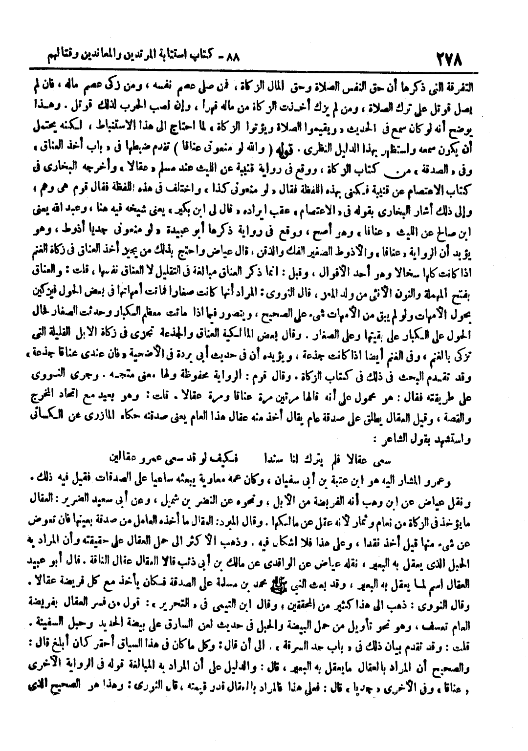 التَّفْرِقَةِ الَّتِي ذَكَرَهَا أَنَّ حَقَّ النَّفْسِ الصَّلَاةُ وَحَقَّ الْمَالِ الزَّكَاةُ فَمَنْ صَلَّى عَصَمَ نَفْسَهُ وَمَنْ زَكَّى عَصَمَ مَالَهُ فَإِنْ لَمْ يُصَلِّ قُوتِلَ عَلَى تَرْكِ الصَّلَاةِ وَمَنْ لَمْ يُزَكِّ أُخِذَتِ الزَّكَاةُ مِنْ مَالِهِ قَهْرًا وَإِنْ نَصَبَ الْحَرْبَ لِذَلِكَ قُوتِلَ وَهَذَا يُوَضِّحُ أَنَّهُ لَوْ كَانَ سَمِعَ فِي الْحَدِيثِ وَيُقِيمُوا الصَّلَاةَ وَيُؤْتُوا الزَّكَاةَ لَمَا احْتَاجَ إِلَى هَذَا الِاسْتِنْبَاطِ لَكِنَّهُ يَحْتَمِلُ أَنْ يَكُونَ سَمِعَهُ وَاسْتَظْهَرَ بِهَذَا الدَّلِيلِ النَّظَرِيِّ قَوْلُهُ وَاللَّهِ لَوْ مَنَعُونِي عَنَاقًا تَقَدَّمَ ضَبْطُهَا فِي بَابِ أَخْذِ الْعَنَاقِ وَفِي الصَّدَقَةِ مِنْ كِتَابِ الزَّكَاةِ وَوَقَعَ فِي رِوَايَةِ قُتَيْبَةَ عَنِ اللَّيْثِ عِنْدَ مُسْلِمٍ عِقَالًا وَأَخْرَجَهُ الْبُخَارِيُّ فِي كِتَابِ الِاعْتِصَامِ عَنْ قُتَيْبَةَ فَكَنَّى بِهَذِهِ اللَّفْظَةِ فَقَالَ لَوْ مَنَعُونِي كَذَا وَاخْتُلِفَ فِي هَذِهِ اللَّفْظَةِ فَقَالَ قَوْمٌ هِيَ وَهْمٌ وَإِلَى ذَلِكَ أَشَارَ الْبُخَارِيُّ بِقَوْلِهِ فِي الِاعْتِصَامِ عَقِبَ إِيرَاده قَالَ لي بن بُكَيْرٍ يَعْنِي شَيْخَهُ فِيهِ هُنَا وَعَبْدُ اللَّهِ يَعْنِي بن صَالِحٍ عَنِ اللَّيْثِ عَنَاقًا وَهُوَ أَصَحُّ وَوَقَعَ فِي رِوَايَةٍ ذَكَرَهَا أَبُو عُبَيْدَةَ لَوْ مَنَعُونِي جَدْيًا أَذْوَطَ وَهُوَ يُؤَيِّدُ أَنَّ الرِّوَايَةَ عَنَاقًا وَالْأَذْوَطُ الصَّغِيرُ الْفَكِّ وَالذَّقَنِ قَالَ عِيَاضٌ وَاحْتَجَّ بِذَلِكَ مَنْ يُجِيزُ أَخْذَ الْعَنَاقِ فِي زَكَاةِ الْغَنَمِ إِذَا كَانَتْ كُلُّهَا سِخَالًا وَهُوَ أَحَدُ الْأَقْوَالِ وَقِيلَ إِنَّمَا ذَكَرَ الْعَنَاقَ مُبَالَغَةً فِي التَّقْلِيلِ لَا الْعَنَاقَ نَفْسَهَا قُلْتُ وَالْعَنَاقُ بِفَتْحِ الْمُهْمَلَةِ وَالنُّونِ الْأُنْثَى مِنْ وَلَدِ الْمَعْزِ قَالَ النَّوَوِيُّ الْمُرَادُ أَنَّهَا كَانَتْ صِغَارًا فَمَاتَتْ أُمَّهَاتُهَا فِي بَعْضِ الْحَوْلِ فَيُزَكَّيْنَ بِحَوْلِ الْأُمَّهَاتِ وَلَوْ لَمْ يَبْقَ مِنَ الْأُمَّهَاتِ شَيْءٌ عَلَى الصَّحِيحِ وَيُتَصَوَّرُ فِيمَا إِذَا مَاتَتْ مُعْظَمُ الْكِبَارِ وَحَدَثَتِ الصِّغَارُ فَحَالَ الْحَوْلُ عَلَى الْكِبَارِ عَلَى بَقِيَّتِهَا وَعَلَى الصِّغَارِ وَقَالَ بَعْضُ الْمَالِكِيَّةِ الْعَنَاقُ وَالْجَذَعَةُ تجزي فِي زَكَاةِ الْإِبِلِ الْقَلِيلَةِ الَّتِي تُزَكَّى بِالْغَنَمِ وَفِي الْغَنَمِ أَيْضًا إِذَا كَانَتْ جَذَعَةً وَيُؤَيِّدُهُ أَنَّ فِي حَدِيثِ أَبِي بُرْدَةَ فِي الْأُضْحِيَّةِ فَإِنَّ عِنْدِي عَنَاقًا جَذَعَةً وَقَدْ تَقَدَّمَ الْبَحْثُ فِي ذَلِكَ فِي كِتَابِ الزَّكَاةِ وَقَالَ قَوْمٌ الرِّوَايَةُ مَحْفُوظَةٌ وَلَهَا مَعْنًى مُتَّجَهٌ وَجَرَى النَّوَوِيُّ عَلَى طَرِيقَتِهِ فَقَالَ هُوَ مَحْمُولٌ عَلَى أَنَّهُ قَالَهَا مَرَّتَيْنِ مَرَّةً عَنَاقًا وَمَرَّةً عِقَالًا قُلْتُ وَهُوَ بَعِيدٌ مَعَ اتِّحَادِ الْمَخْرَجِ وَالْقِصَّةِ وَقِيلَ الْعِقَالُ يُطْلَقُ عَلَى صَدَقَةِ عَامٍ يُقَالُ أُخِذَ مِنْهُ عِقَالُ هَذَا الْعَامِ يَعْنِي صَدَقَتَهُ حَكَاهُ الْمَازِرِيُّ عَنِ الْكِسَائِيِّ وَاسْتَشْهَدَ بِقَوْلِ الشَّاعِرِ سَعَى عِقَالًا فَلَمْ يَتْرُكْ لَنَا سَنَدًا فَكَيْفَ لَوْ قَدْ سَعَى عَمْرٌو عِقَالَيْنِ وَعَمْرٌو الْمُشَارُ إِلَيْهِ هُوَ بن عُتْبَةَ بْنِ أَبِي سُفْيَانَ وَكَانَ عَمُّهُ مُعَاوِيَةُ يَبْعَثُهُ سَاعِيًا عَلَى الصَّدَقَاتِ فَقِيلَ فِيهِ ذَلِكَ وَنقل عِيَاض عَن بن وَهْبٍ أَنَّهُ الْفَرِيضَةُ مِنَ الْإِبِلِ وَنَحْوُهُ عَنْ النَّضْرِ بْنِ شُمَيْلٍ وَعَنْ أَبِي سَعِيدٍ الضَّرِيرِ العقال مَا يُؤْخَذ فِي الزَّكَ