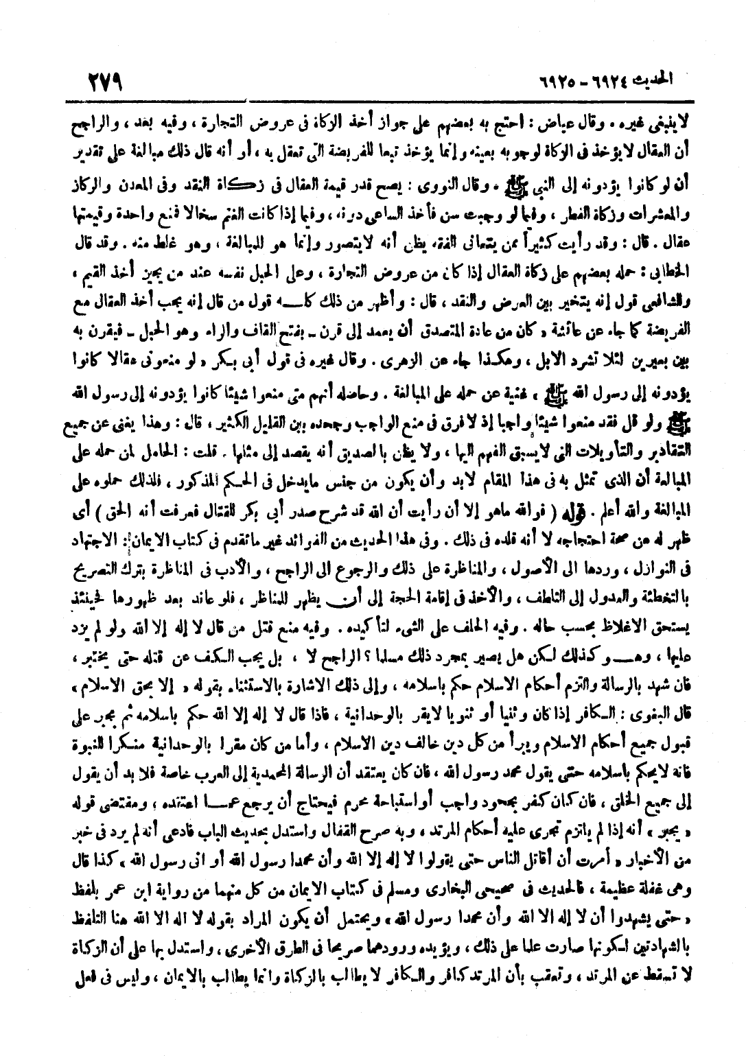 لَا يَنْبَغِي غَيْرُهُ وَقَالَ عِيَاضٌ احْتَجَّ بِهِ بَعْضُهُمْ عَلَى جَوَازِ أَخْذِ الزَّكَاةِ فِي عُرُوضِ التِّجَارَة وَفِيه بعد وَالرَّاجِح أَن العقال لايؤخذ فِي الزَّكَاةِ لِوُجُوبِهِ بِعَيْنِهِ وَإِنَّمَا يُؤْخَذُ تَبَعًا لِلْفَرِيضَةِ الَّتِي تُعْقَلُ بِهِ أَوْ أَنَّهُ قَالَ ذَلِكَ مُبَالَغَةً عَلَى تَقْدِيرِ أَنْ لَوْ كَانُوا يُؤَدُّونَهُ إِلَى النَّبِيِّ صَلَّى اللَّهُ عَلَيْهِ وَسَلَّمَ وَقَالَ النَّوَوِيُّ يَصِحُّ قَدْرُ قِيمَةِ الْعِقَالِ فِي زَكَاةِ النَّقْدِ وَفِي الْمَعْدِنِ وَالرِّكَازِ وَالْمُعَشَّرَاتِ وَزَكَاةِ الْفِطْرِ وَفِيمَا لَوْ وَجَبَتْ سِنٌّ فَأَخَذَ السَّاعِي دُونَهُ وَفِيمَا إِذَا كَانَتِ الْغَنَمُ سِخَالًا فَمَنَعَ وَاحِدَةً وَقِيمَتُهَا عِقَالٌ قَالَ وَقَدْ رَأَيْتُ كَثِيرًا مِمَّنْ يَتَعَانَى الْفِقْهَ يَظُنُّ أَنَّهُ لَا يُتَصَوَّرُ وَإِنَّمَا هُوَ لِلْمُبَالَغَةِ وَهُوَ غَلَطٌ مِنْهُ وَقَدْ قَالَ الْخَطَّابِيُّ حَمَلَهُ بَعْضُهُمْ عَلَى زَكَاةِ الْعِقَالِ إِذَا كَانَ مِنْ عُرُوضِ التِّجَارَةِ وَعَلَى الْحَبْلِ نَفْسِهِ عِنْدَ مَنْ يُجِيزُ أَخْذَ الْقِيَمِ وَلِلشَّافِعِيِّ قَوْلٌ إِنَّهُ يَتَخَيَّرُ بَيْنَ الْعَرَضِ وَالنَّقْدِ قَالَ وَأَظْهَرُ مِنْ ذَلِكَ كُلِّهِ قَوْلُ مَنْ قَالَ إِنَّهُ يَجِبُ أَخْذُ الْعِقَالِ مَعَ الْفَرِيضَةِ كَمَا جَاءَ عَنْ عَائِشَةَ كَانَ مِنْ عَادَةِ الْمُتَصَدِّقِ أَنْ يَعْمِدَ إِلَى قَرَنٍ بِفَتْحِ الْقَافِ وَالرَّاءِ وَهُوَ الْحَبْلُ فَيَقْرُنُ بِهِ بَيْنَ بَعِيرَيْنِ لِئَلَّا تَشْرُدَ الْإِبِلُ وَهَكَذَا جَاءَ عَنِ الزُّهْرِيِّ وَقَالَ غَيْرُهُ فِي قَوْلِ أَبِي بَكْرٍ لَوْ مَنَعُونِي عِقَالًا كَانُوا يُؤَدُّونَهُ إِلَى رَسُولِ اللَّهِ صَلَّى اللَّهُ عَلَيْهِ وَسَلَّمَ غَنِيَّةً عَنْ حَمْلِهِ عَلَى الْمُبَالَغَةِ وَحَاصِلُهُ أَنَّهُمْ مَتَى مَنَعُوا شَيْئًا كَانُوا يُؤَدُّونَهُ إِلَى رَسُولِ اللَّهِ صَلَّى اللَّهُ عَلَيْهِ وَسَلَّمَ وَلَوْ قَلَّ فَقَدْ مَنَعُوا شَيْئًا وَاجِبًا إِذْ لَا فَرْقَ فِي مَنْعِ الْوَاجِبِ وَجَحْدِهِ بَين الْقَلِيل الْكثير قَالَ وَهَذَا يغنى عَنْ جَمِيعِ التَّقَادِيرِ وَالتَّأْوِيلَاتِ الَّتِي لَا يَسْبِقُ الْفَهْمُ إِلَيْهَا وَلَا يُظَنُّ بِالصِّدِّيقِ أَنَّهُ يَقْصِدُ إِلَى مِثْلِهَا قُلْتُ الْحَامِلُ لِمَنْ حَمَلَهُ عَلَى الْمُبَالَغَةِ أَنَّ الَّذِي تَمَثَّلَ بِهِ فِي هَذَا الْمقَام لابد وَأَنْ يَكُونَ مِنْ جِنْسِ مَا يَدْخُلُ فِي الْحُكْمِ الْمَذْكُورِ فَلِذَلِكَ حَمَلُوهُ عَلَى الْمُبَالَغَةِ وَاللَّهُ أعلم قَوْله فو الله مَا هُوَ إِلَّا أَنْ رَأَيْتُ أَنَّ اللَّهَ قَدْ شَرَحَ صَدْرَ أَبِي بَكْرٍ لِلْقِتَالِ فَعَرَفْتُ أَنه الْحق أَي ظهر لَهُ عَن صِحَّةِ احْتِجَاجِهِ لَا أَنَّهُ قَلَّدَهُ فِي ذَلِكَ وَفِي هَذَا الْحَدِيثِ مِنَ الْفَوَائِدِ غَيْرِ مَا تَقَدَّمَ فِي كِتَابِ الْإِيمَانِ الِاجْتِهَادُ فِي النَّوَازِلِ وَرَدُّهَا إِلَى الْأُصُولِ وَالْمُنَاظَرَةُ عَلَى ذَلِكَ وَالرُّجُوعُ إِلَى الرَّاجِحِ وَالْأَدَبُ فِي الْمُنَاظَرَةِ بِتَرْكِ التَّصْرِيحِ بِالتَّخْطِئَةِ وَالْعُدُولُ إِلَى التَّلَطُّفِ وَالْأَخْذُ فِي إِقَامَةِ الْحُجَّةِ إِلَى أَنْ يَظْهَرَ لِلْمَنَاظِرِ فَلَوْ عَانَدَ بَعْدَ ظُهُورِهَا فَحِينَئِذٍ يَسْتَحِقُّ الْإِغْلَاظَ بِحَسَبِ حَالِهِ وَفِيهِ الْحَلِفُ عَلَى الشَّيْءِ لِتَأْكِيدِهِ وَفِيهِ مَنْعُ قَتْلِ مَنْ قَالَ لَا إِلَهَ إِلَّا اللَّهُ وَلَوْ لَمْ يَزِدْ عَلَيْهَا وَهُوَ كَذَلِكَ لَكِنْ هَلْ يَصِيرُ بِمُجَرَّدِ ذَلِكَ مُسْلِمًا الرَّاجِحُ لَا بَلْ يَجِبُ الْكَفُّ عَنْ قَتْلِهِ حَتَّى يُخْتَبَرَ فَإِنْ شَهِدَ بِالرِّسَا