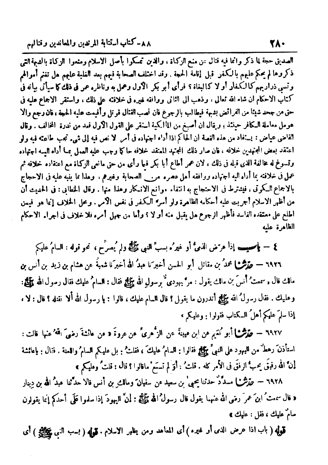 الصِّدِّيقِ حُجَّةٌ لِمَا ذُكِرَ وَإِنَّمَا فِيهِ قِتَالُ مَنْ مَنَعَ الزَّكَاةَ وَالَّذِينَ تَمَسَّكُوا بِأَصْلِ الْإِسْلَامِ وَمَنَعُوا الزَّكَاةَ بِالشُّبْهَةِ الَّتِي ذَكَرُوهَا لَمْ يُحْكَمْ عَلَيْهِمْ بِالْكُفْرِ قَبْلَ إِقَامَةِ الْحُجَّةِ وَقَدِ اخْتَلَفَ الصَّحَابَةُ فِيهِمْ بَعْدَ الْغَلَبَةِ عَلَيْهِمْ هَلْ تُغْنَمُ أَمْوَالُهُمْ وَتُسْبَى ذَرَارِيُّهُمْ كَالْكُفَّارِ أَوْ لَا كَالْبُغَاةِ فَرَأَى أَبُو بَكْرٍ الْأَوَّلَ وَعَمِلَ بِهِ وَنَاظَرَهُ عُمَرُ فِي ذَلِكَ كَمَا سَيَأْتِي بَيَانُهُ فِي كِتَابِ الْأَحْكَامِ إِنْ شَاءَ اللَّهُ تَعَالَى وَذَهَبَ إِلَى الثَّانِي وَوَافَقَهُ غَيْرُهُ فِي خِلَافَتِهِ عَلَى ذَلِكَ وَاسْتَقَرَّ الْإِجْمَاعُ عَلَيْهِ فِي حَقِّ مَنْ جَحَدَ شَيْئًا مِنَ الْفَرَائِضِ بِشُبْهَةٍ فَيُطَالَبُ بِالرُّجُوعِ فَإِنْ نَصَبَ الْقِتَالَ قُوتِلَ وَأُقِيمَتْ عَلَيْهِ الْحُجَّةُ فَإِنْ رَجَعَ وَإِلَّا عُومِلَ مُعَامَلَةَ الْكَافِرِ حِينَئِذٍ وَيُقَالُ إِنَّ أَصْبَغَ مِنَ الْمَالِكِيَّةِ اسْتَقَرَّ عَلَى الْقَوْلِ الْأَوَّلِ فَعُدَّ مِنْ نُدْرَةِ الْمُخَالِفِ وَقَالَ الْقَاضِي عِيَاضٌ يُسْتَفَادُ مِنْ هَذِهِ الْقِصَّةِ أَنَّ الْحَاكِمَ إِذَا أَدَّاهُ اجْتِهَادُهُ فِي أَمْرٍ لَا نَصَّ فِيهِ إِلَى شَيْءٍ تَجِبُ طَاعَتُهُ فِيهِ وَلَوِ اعْتَقَدَ بَعْضُ الْمُجْتَهِدِينَ خِلَافَهُ فَإِنْ صَارَ ذَلِكَ الْمُجْتَهِدُ الْمُعْتَقِدُ خِلَافَهُ حَاكِمًا وَجَبَ عَلَيْهِ الْعَمَلُ بِمَا أَدَّاهُ إِلَيْهِ اجْتِهَادُهُ وَتَسُوغُ لَهُ مُخَالَفَةُ الَّذِي قَبْلَهُ فِي ذَلِكَ لِأَنَّ عُمَرَ أَطَاعَ أَبَا بَكْرٍ فِيمَا رَأَى مِنْ حَقِّ مَانِعِي الزَّكَاةِ مَعَ اعْتِقَادِهِ خِلَافَهُ ثُمَّ عَمِلَ فِي خِلَافَتِهِ بِمَا أَدَّاهُ إِلَيْهِ اجْتِهَادُهُ وَوَافَقَهُ أَهْلُ عَصْرِهِ مِنَ الصَّحَابَةِ وَغَيْرِهِمْ وَهَذَا مِمَّا يُنَبه عَلَيْهِ فِي الاحجاج بِالْإِجْمَاعِ السُّكُوتِيِّ فَيُشْتَرَطُ فِي الِاحْتِجَاجِ بِهِ انْتِفَاءُ مَوَانِعِ الْإِنْكَارِ وَهَذَا مِنْهَا وَقَالَ الْخَطَّابِيُّ فِي الْحَدِيثِ إِنَّ مَنْ أَظْهَرَ الْإِسْلَامَ أُجْرِيَتْ عَلَيْهِ أَحْكَامُهُ الظَّاهِرَةُ وَلَوْ أَسَرَّ الْكُفْرَ فِي نَفْسِ الْأَمْرِ وَمَحَلُّ الْخِلَافِ إِنَّمَا هُوَ فِيمَنِ اطُّلِعَ عَلَى مُعْتَقَدِهِ الْفَاسِدِ فَأَظْهَرَ الرُّجُوعَ هَلْ يُقْبَلُ مِنْهُ أَوْ لَا وَأَمَّا مَنْ جُهِلَ أَمْرُهُ فَلَا خِلَافَ فِي إِجْرَاءِ الْأَحْكَامِ الظَّاهِرَةِ عَلَيْهِ