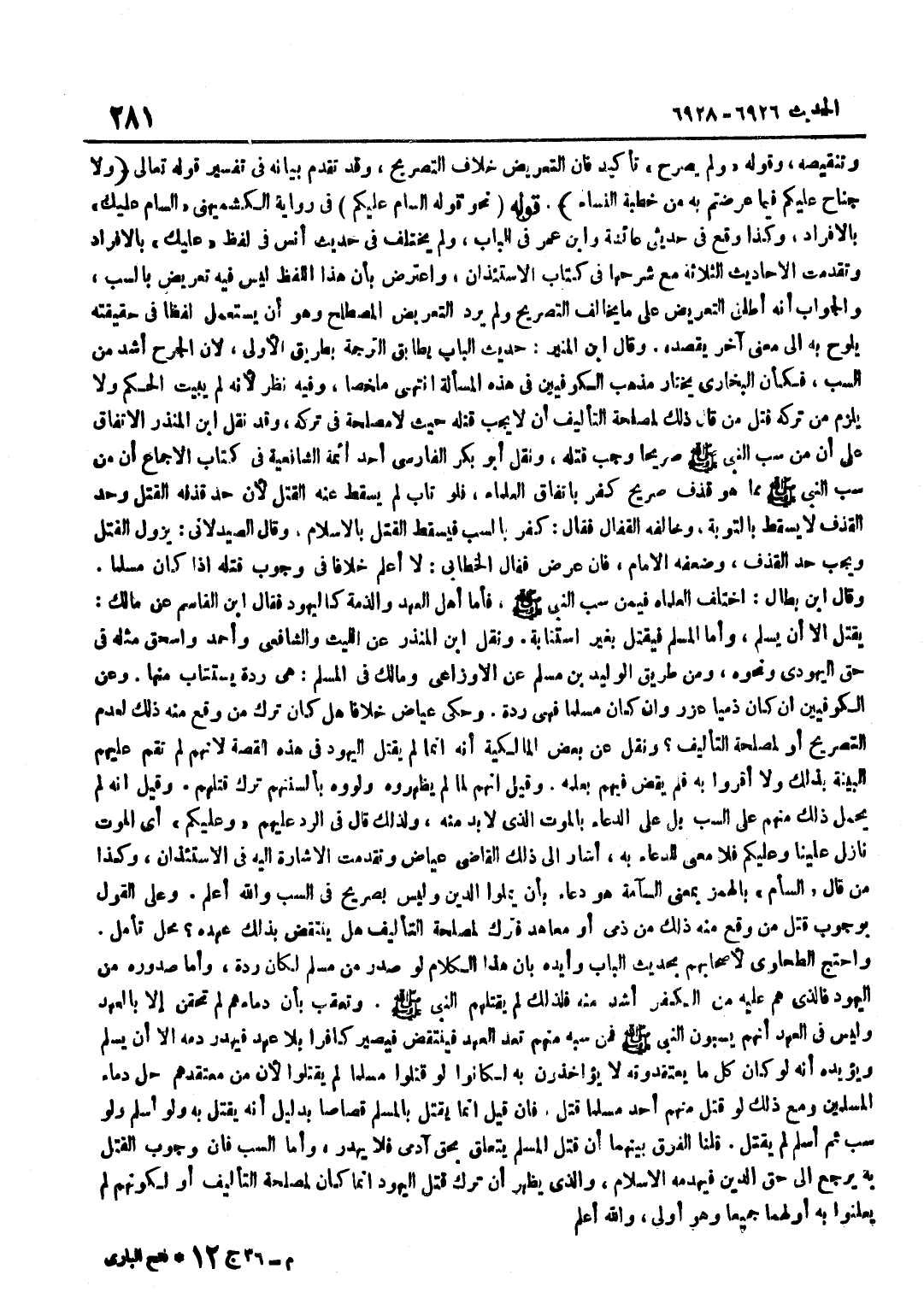 وَتَنْقِيصُهُ وَقَوْلُهُ وَلَمْ يُصَرِّحْ تَأْكِيدٌ فَإِنَّ التَّعْرِيضَ خِلَافُ التَّصْرِيحِ وَقَدْ تَقَدَّمَ بَيَانُهُ فِي تَفْسِيرِ قَوْلِهِ تَعَالَى وَلَا جُنَاحَ عَلَيْكُمْ فِيمَا عَرَّضْتُمْ بِهِ مِنْ خطْبَة النِّسَاء قَوْلُهُ نَحْوَ قَوْلِهِ السَّامُ عَلَيْكُمْ فِي رِوَايَةِ الْكُشْمِيهَنِيِّ السَّامُ عَلَيْكَ بِالْإِفْرَادِ وَكَذَا وَقَعَ فِي حَدِيثي عَائِشَة وبن عُمَرَ فِي الْبَابِ وَلَمْ يُخْتَلَفْ فِي حَدِيثِ أَنَسٍ فِي لَفْظِ عَلَيْكَ بِالْإِفْرَادِ وَتَقَدَّمَتِ الْأَحَادِيثُ الثَّلَاثَةُ مَعَ شَرْحِهَا فِي كِتَابِ الِاسْتِئْذَانِ وَاعْتُرِضَ بِأَنَّ هَذَا اللَّفْظَ لَيْسَ فِيهِ تَعْرِيضٌ بِالسَّبِّ وَالْجَوَابُ أَنَّهُ أَطْلَقَ التَّعْرِيضَ عَلَى مَا يُخَالِفُ التَّصْرِيحَ وَلَمْ يَرِدِ التَّعْرِيضُ الْمُصْطَلَحُ وَهُوَ أَنْ يَسْتَعْمِلَ لَفْظًا فِي حَقِيقَتِهِ يُلَوِّحُ بِهِ إِلَى معنى آخر يقْصد وَقَالَ بن الْمُنِيرِ حَدِيثُ الْبَابِ يُطَابِقُ التَّرْجَمَةَ بِطَرِيقِ الْأَوْلَى لِأَنَّ الْجَرْحَ أَشَدُّ مِنَ السَّبِّ فَكَأَنَّ الْبُخَارِيَّ يَخْتَارُ مَذْهَبَ الْكُوفِيِّينَ فِي هَذِهِ الْمَسْأَلَةِ انْتَهَى مُلَخصا وَفِيه نظر لِأَنَّهُ لم يبيت الْحُكْمَ وَلَا يَلْزَمُ مِنْ تَرْكِهِ قَتْلُ مَنْ قَالَ ذَلِكَ لِمَصْلَحَةِ التَّأْلِيفِ أَنْ لَا يَجِبَ قَتْلُهُ حَيْثُ لَا مَصْلَحَةَ فِي تَرْكِهِ وَقَدْ نقل بن الْمُنْذِرِ الِاتِّفَاقَ عَلَى أَنَّ مَنْ سَبَّ النَّبِيَّ صَلَّى اللَّهُ عَلَيْهِ وَسَلَّمَ صَرِيحًا وَجَبَ قَتْلُهُ وَنَقَلَ أَبُو بَكْرٍ الْفَارِسِيُّ أَحَدُ أَئِمَّةِ الشَّافِعِيَّةِ فِي كِتَابِ الْإِجْمَاعِ أَنَّ مَنْ سَبَّ النَّبِيُّ صَلَّى اللَّهُ عَلَيْهِ وَسَلَّمَ مِمَّا هُوَ قَذْفٌ صَرِيحٌ كَفَرَ بِاتِّفَاقِ الْعُلَمَاءِ فَلَوْ تَابَ لَمْ يَسْقُطْ عَنْهُ الْقَتْلُ لِأَنَّ حَدَّ قَذْفِهِ الْقَتْلُ وَحَدَّ الْقَذْفِ لَا يَسْقُطُ بِالتَّوْبَةِ وَخَالَفَهُ الْقَفَّالُ فَقَالَ كَفَرَ بِالسَّبِّ فَيَسْقُطُ الْقَتْلُ بِالْإِسْلَامِ وَقَالَ الصَّيْدَلَانِيُّ يَزُولُ الْقَتْلُ وَيَجِبُ حَدُّ الْقَذْفِ وَضَعَّفَهُ الْإِمَامُ فَإِنْ عَرَّضَ فَقَالَ الْخَطَّابِيُّ لَا أَعْلَمُ خِلَافًا فِي وُجُوبِ قَتْلِهِ إِذَا كَانَ مُسْلِمًا وَقَالَ بن بَطَّالٍ اخْتَلَفَ الْعُلَمَاءُ فِيمَنْ سَبَّ النَّبِيَّ صَلَّى اللَّهُ عَلَيْهِ وَسَلَّمَ فَأَمَّا أَهْلُ الْعَهْدِ وَالذِّمَّةِ كاليهود فَقَالَ بن الْقَاسِمِ عَنْ مَالِكٍ يُقْتَلُ إِلَّا أَنْ يُسْلِمَ وَأما الْمُسلم فَيقْتل بِغَيْر اسْتِتَابَة وَنقل بن الْمُنْذِرِ عَنِ اللَّيْثِ وَالشَّافِعِيِّ وَأَحْمَدَ وَإِسْحَاقَ مِثْلَهُ فِي حَقِّ الْيَهُودِيِّ وَنَحْوِهِ وَمِنْ طَرِيقِ الْوَلِيدِ بْنِ مُسْلِمٍ عَنِ الْأَوْزَاعِيِّ وَمَالِكٍ فِي الْمُسْلِمِ هِيَ رِدَّةٌ يُسْتَتَابُ مِنْهَا وَعَنِ الْكُوفِيِّينَ إِنْ كَانَ ذِمِّيًّا عُزِّرَ وَإِنْ كَانَ مُسْلِمًا فَهِيَ رِدَّةٌ وَحَكَى عِيَاضٌ خِلَافًا هَلْ كَانَ تَرْكُ مَنْ وَقَعَ مِنْهُ ذَلِكَ لِعَدَمِ التَّصْرِيحِ أَوْ لِمَصْلَحَةِ التَّأْلِيفِ وَنُقِلَ عَنْ بَعْضِ الْمَالِكِيَّةِ أَنَّهُ إِنَّمَا لَمْ يَقْتُلِ الْيَهُودَ فِي هَذِهِ الْقِصَّةِ لِأَنَّهُمْ لَمْ تَقُمْ عَلَيْهِمُ الْبَيِّنَةُ بِذَلِكَ وَلَا أَقَرُّوا بِهِ فَلَمْ يَقْضِ فِيهِمْ بِعِلْمِهِ وَقِيلَ إِنَّهُمْ لَمَّا لَمْ يُظْهِرُوهُ وَلَوَوْهُ بِأَلْسِنَتِهِمْ تَرَكَ قَتْلَهُمْ وَقِيلَ إِنَّهُ لَمْ يُحْمَلْ ذَلِكَ مِنْهُمْ عَلَى السَّبِّ بَلْ عَلَى الدُّعَاءِ بِالْمَوْتِ الَّذِي لَا بُدَّ مِنْهُ وَلِذَلِكَ قَالَ فِي الرَّدِّ عَلَيْهِمْ وَعَلَيْكُمْ أَيِ الْمَوْتُ نَازِلٌ عَلَيْن