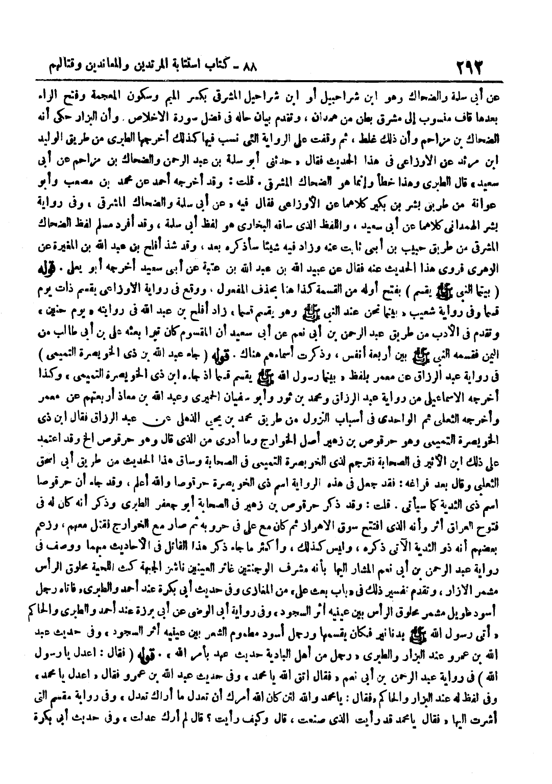 عَن أبي سَلمَة وَالضَّحَّاك وَهُوَ بن شراحبيل أَو بن شَرَاحِيلَ الْمِشْرَقِيُّ بِكَسْرِ الْمِيمِ وَسُكُونِ الْمُعْجَمَةِ وَفَتْحِ الرَّاءِ بَعْدَهَا قَافٌ مَنْسُوبٌ إِلَى مِشْرَقَ بَطْنٍ مِنْ هَمْدَانَ وَتَقَدَّمَ بَيَانُ حَالِهِ فِي فَضْلِ سُورَةِ الْإِخْلَاصِ وَأَنَّ الْبَزَّارَ حَكَى أَنَّهُ الضَّحَّاكُ بْنُ مُزَاحِمٍ وَأَنَّ ذَلِكَ غَلَطٌ ثُمَّ وَقَفْتُ عَلَى الرِّوَايَةِ الَّتِي نُسِبَ فِيهَا كَذَلِكَ أَخْرَجَهَا الطَّبَرِيُّ مِنْ طَرِيقِ الْوَلِيدِ بْنِ مَرْثَدٍ عَنِ الْأَوْزَاعِيِّ فِي هَذَا الْحَدِيثِ فَقَالَ حَدَّثَنِي أَبُو سَلَمَةَ بْنُ عَبْدِ الرَّحْمَنِ وَالضَّحَّاكُ بْنُ مُزَاحِمٍ عَنْ أَبِي سَعِيدٍ قَالَ الطَّبَرِيُّ وَهَذَا خَطَأٌ وَإِنَّمَا هُوَ الضَّحَّاكُ الْمِشْرَقِيُّ قُلْتُ وَقَدْ أَخْرَجَهُ أَحْمَدُ عَنْ مُحَمَّدِ بْنِ مُصْعَبٍ وَأَبُو عَوَانَةَ مِنْ طَرِيقِ بِشْرِ بْنِ بُكَيْرٍ كِلَاهُمَا عَنِ الْأَوْزَاعِيِّ فَقَالَ فِيهِ عَنْ أَبِي سَلَمَةَ وَالضَّحَّاكِ الْمِشْرَقِيِّ وَفِي رِوَايَةِ بِشْرٍ الْهَمْدَانِيِّ كِلَاهُمَا عَنْ أَبِي سَعِيدٍ وَاللَّفْظُ الَّذِي سَاقَهُ الْبُخَارِيُّ هُوَ لَفْظُ أَبِي سَلَمَةَ وَقَدْ أَفْرَدَ مُسْلِمٌ لَفْظَ الضَّحَّاكِ الْمِشْرَقِيِّ مِنْ طَرِيقِ حَبِيبِ بْنِ أَبِي ثَابِتٍ عَنْهُ وَزَادَ فِيهِ شَيْئًا سَأَذْكُرُهُ بَعْدُ وَقَدْ شَذَّ أَفْلَحُ بْنُ عَبْدِ اللَّهِ بْنِ الْمُغِيرَةِ عَنِ الزُّهْرِيِّ فَرَوَى هَذَا الْحَدِيثَ عَنْهُ فَقَالَ عَنْ عُبَيْدِ اللَّهِ بْنِ عَبْدِ اللَّهِ بْنِ عُتْبَةَ عَنْ أَبِي سَعِيدٍ أَخْرَجَهُ أَبُو يعلى قَوْلُهُ بَيْنَمَا النَّبِيُّ صَلَّى اللَّهُ عَلَيْهِ وَسَلَّمَ يَقْسِمُ بِفَتْحِ أَوَّلِهِ مِنَ الْقِسْمَةِ كَذَا هُنَا بِحَذْفِ الْمَفْعُولِ وَوَقَعَ فِي رِوَايَةِ الْأَوْزَاعِيِّ يَقْسِمُ ذَاتَ يَوْمٍ قَسْمًا وَفِي رِوَايَةِ شُعَيْبٍ بَيْنَمَا نَحْنُ عِنْدَ النَّبِيِّ صَلَّى اللَّهُ عَلَيْهِ وَسَلَّمَ وَهُوَ يَقْسِمُ قَسْمًا زَادَ أَفْلَحُ بْنُ عَبْدِ اللَّهِ فِي رِوَايَتِهِ يَوْمَ حُنَيْنٍ وَتَقَدَّمَ فِي الْأَدَبِ مِنْ طَرِيقِ عَبْدِ الرَّحْمَنِ بْنِ أَبِي نُعْمٍ عَنْ أَبِي سَعِيدٍ أَنَّ الْمَقْسُومَ كَانَ تِبْرًا بَعَثَهُ عَلِيُّ بْنُ أَبِي طَالِبٍ مِنَ الْيَمَنِ فَقَسَمَهُ النَّبِيُّ صَلَّى اللَّهُ عَلَيْهِ وَسَلَّمَ بَيْنَ أَرْبَعَةِ أَنْفُسٍ وَذَكَرْتُ أَسْمَاءَهُمْ هُنَاكَ قَوْلُهُ جَاءَ عَبْدُ اللَّهِ بْنُ ذِي الْخُوَيْصِرَةِ التَّمِيمِيُّ فِي رِوَايَةِ عَبْدِ الرَّزَّاقِ عَنْ مَعْمَرٍ بِلَفْظِ بَيْنَمَا رَسُولُ اللَّهِ صَلَّى اللَّهُ عَلَيْهِ وَسَلَّمَ يقسم قسما إِذْ جَاءَهُ بن ذِي الْخُوَيْصِرَةِ التَّمِيمِيُّ وَكَذَا أَخْرَجَهُ الْإِسْمَاعِيلِيُّ مِنْ رِوَايَةِ عَبْدِ الرَّزَّاقِ وَمُحَمَّدُ بْنُ ثَوْرٍ وَأَبُو سُفْيَانَ الْحِمْيَرِيُّ وَعَبْدُ اللَّهِ بْنُ مُعَاذٍ أَرْبَعَتُهُمْ عَنْ مَعْمَرٍ وَأَخْرَجَهُ الثَّعْلَبِيُّ ثُمَّ الْوَاحِدِيُّ فِي أَسْبَابِ النُّزُولِ مِنْ طَرِيقِ مُحَمَّدِ بْنِ يَحْيَى الذُّهْلِيِّ عَنْ عبد الرَّزَّاق فَقَالَ بن ذِي الْخُوَيْصِرَةِ التَّمِيمِيُّ وَهُوَ حُرْقُوصُ بْنُ زُهَيْرٍ أَصْلُ الْخَوَارِجِ وَمَا أَدْرِي مَنِ الَّذِي قَالَ وَهُوَ حُرْقُوصٌ إِلَخْ وَقَدِ اعْتَمَدَ عَلَى ذَلِكَ بن الْأَثِيرِ فِي الصَّحَابَةِ فَتَرْجَمَ لِذِي الْخُوَيْصِرَةِ التَّمِيمِيِّ فِي الصَّحَابَةِ وَسَاقَ هَذَا الْحَدِيثَ مِنْ طَرِيقِ أَبِي إِسْحَاقَ الثَّعْلَبِيِّ وَقَالَ بَعْدَ فَرَاغِهِ فَقَدْ جَعَلَ فِي هَذِهِ الرِّوَايَةِ اسْمَ ذِي الْخُوَيْصِرَةِ حُرْقُوصًا وَاللَّهُ أَعْلَمُ وَقَدْ جَاءَ أَنَّ حُرْقُوصًا اسْمُ ذِي الثُّدَي